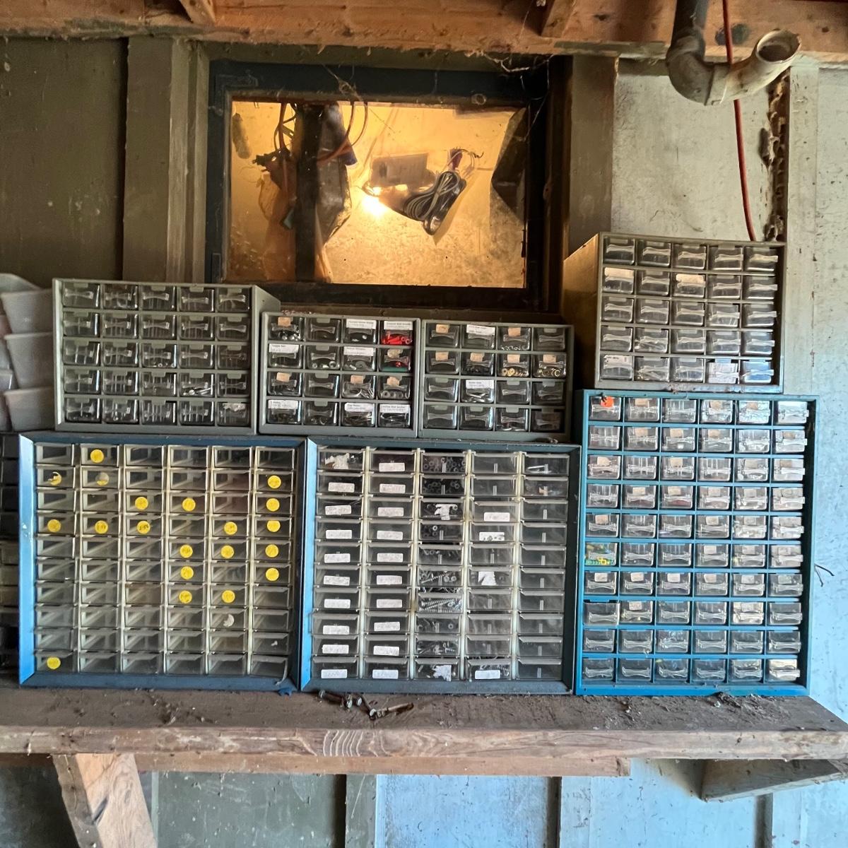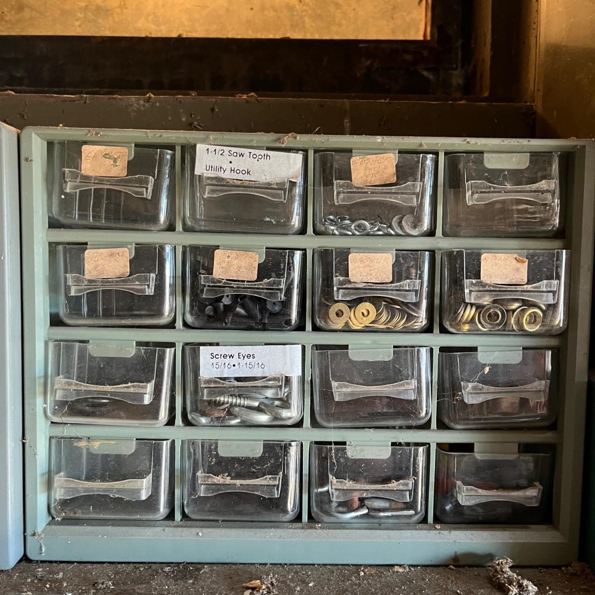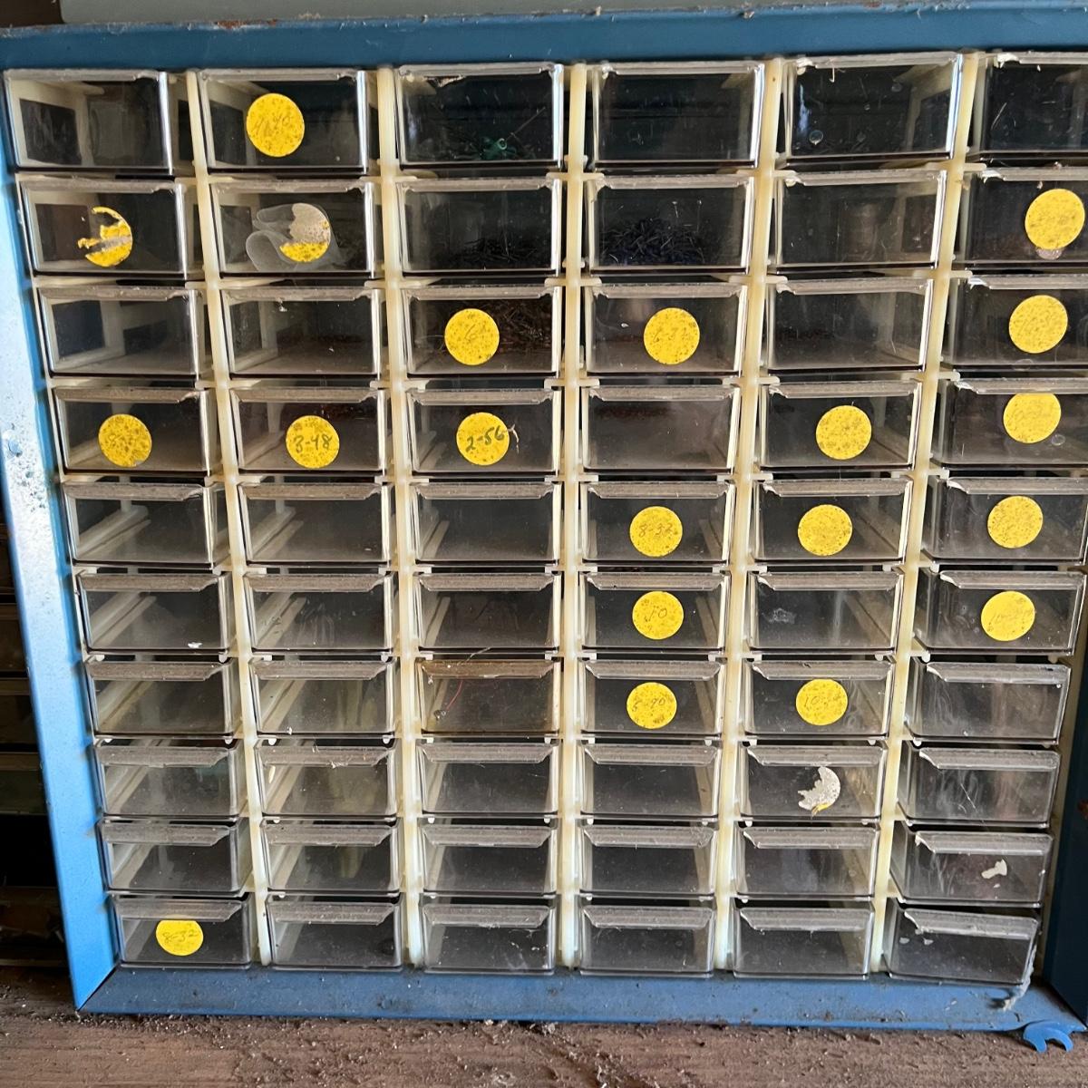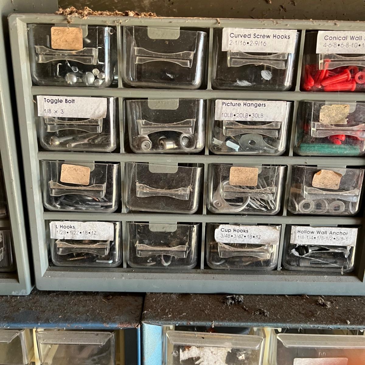 Lot includes seven small drawer boxes with the largest having sixty drawers. Also includes the contents of organizers which includes various types of hardware (nails, screws, etc.).