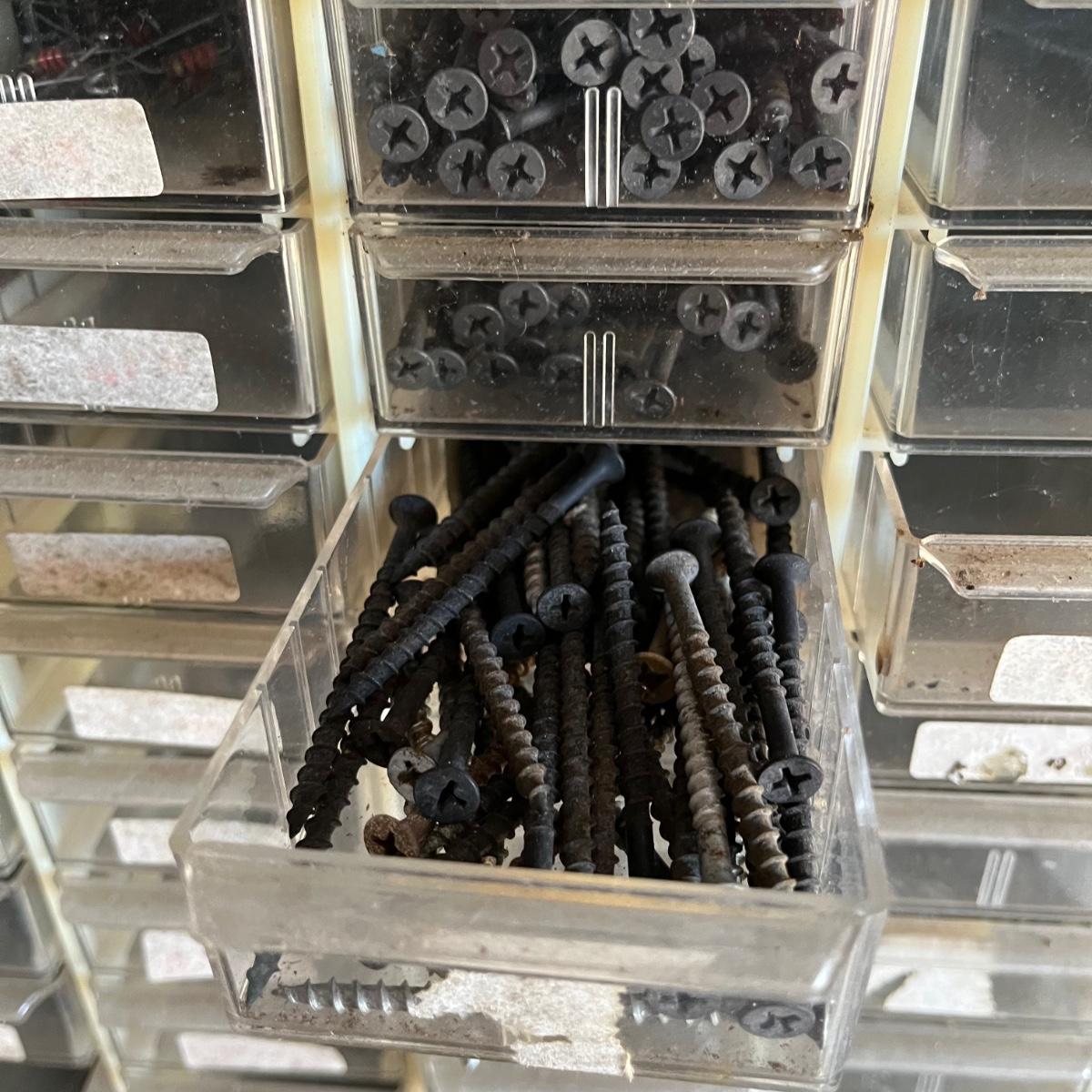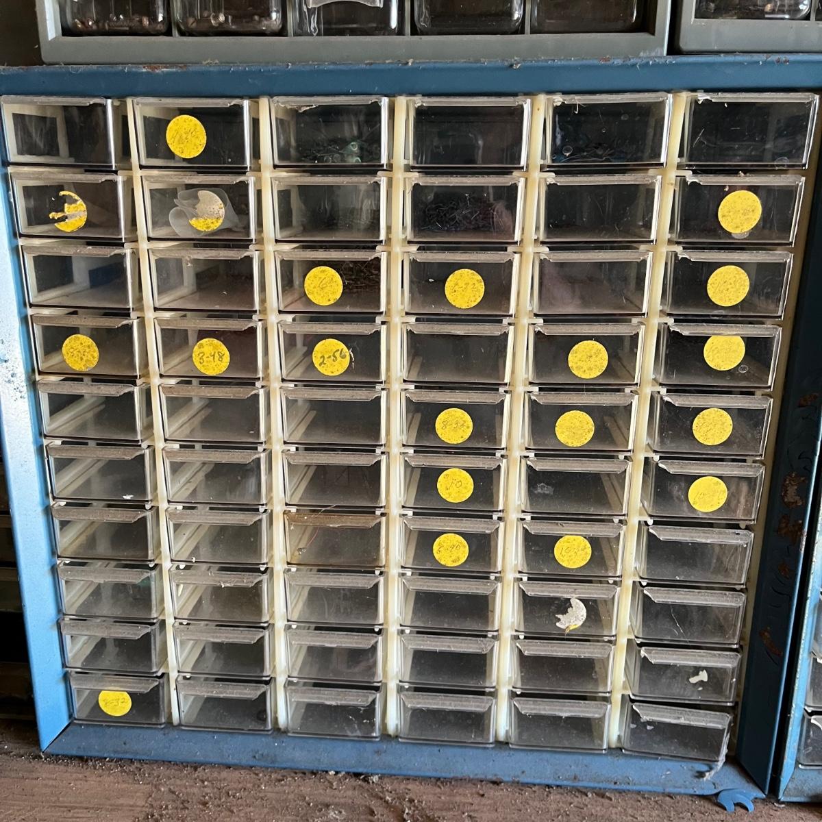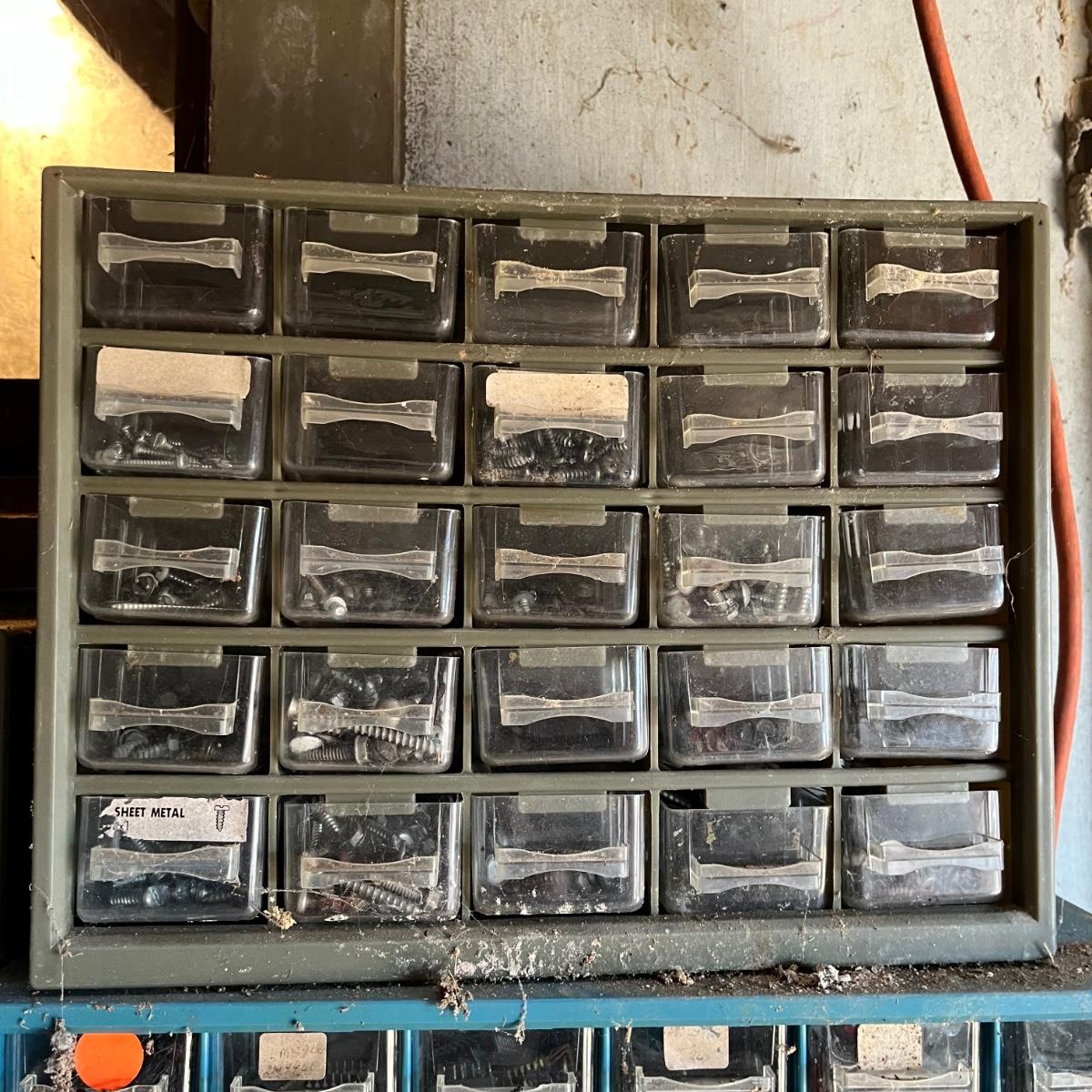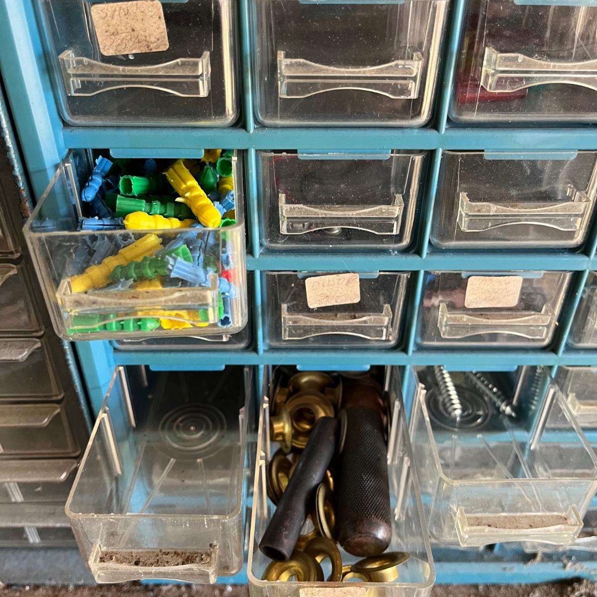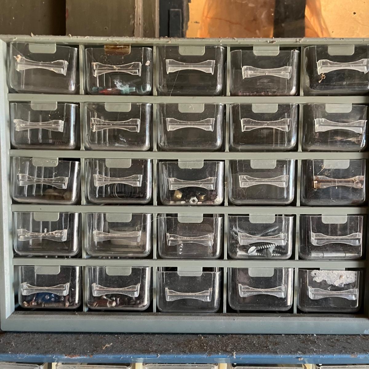 Lot includes seven small drawer boxes with the largest having sixty drawers. Also includes the contents of organizers which includes various types of hardware (nails, screws, etc.).