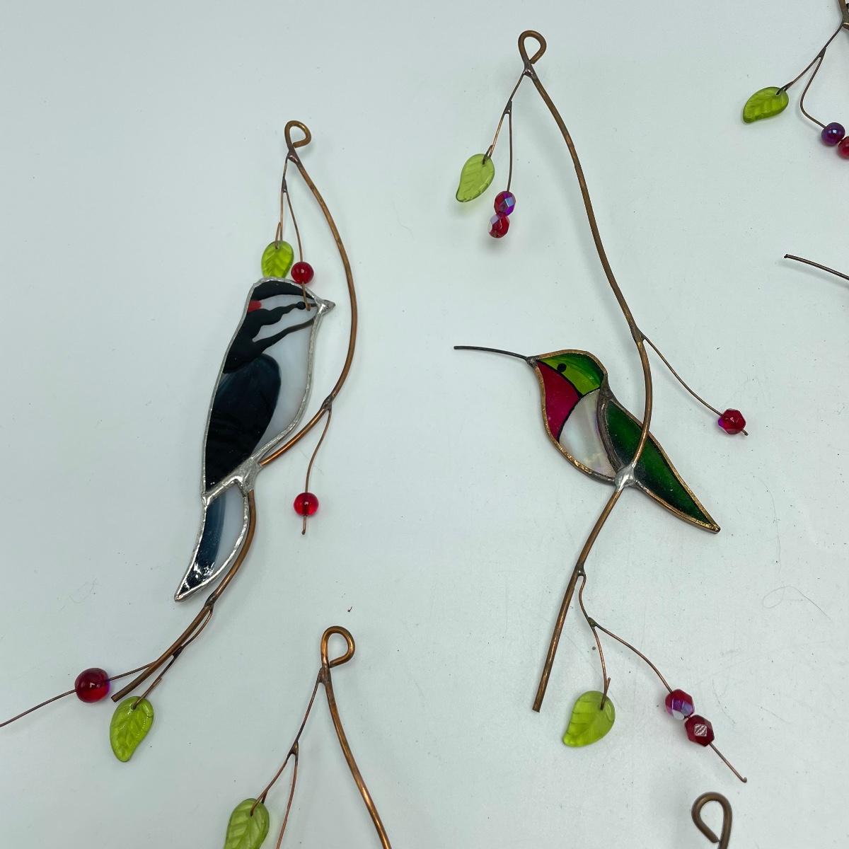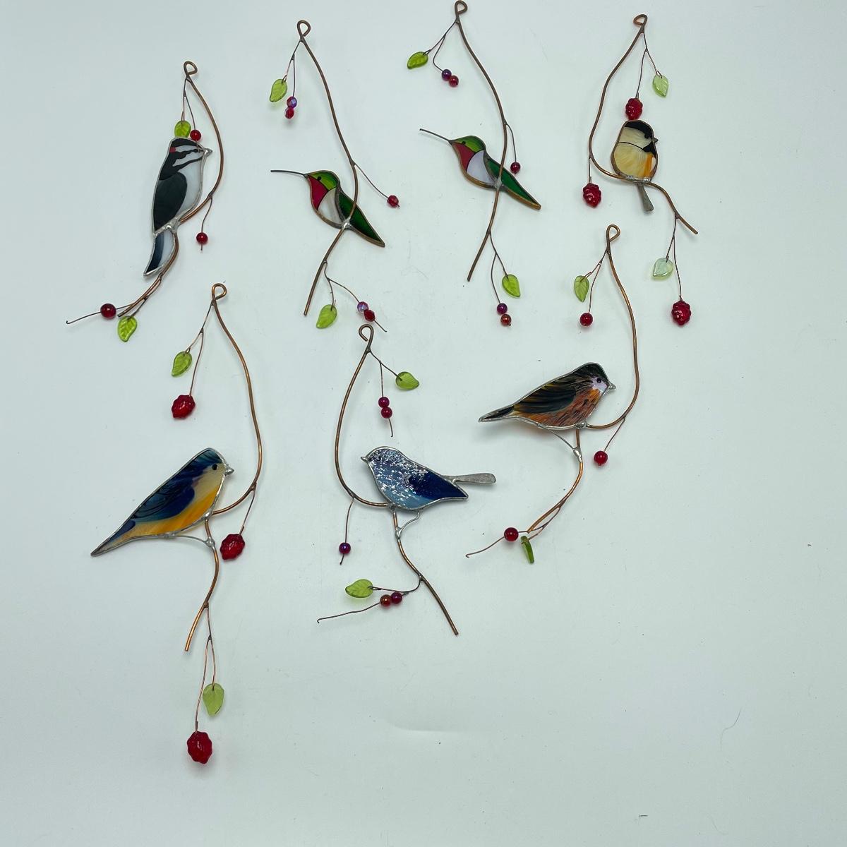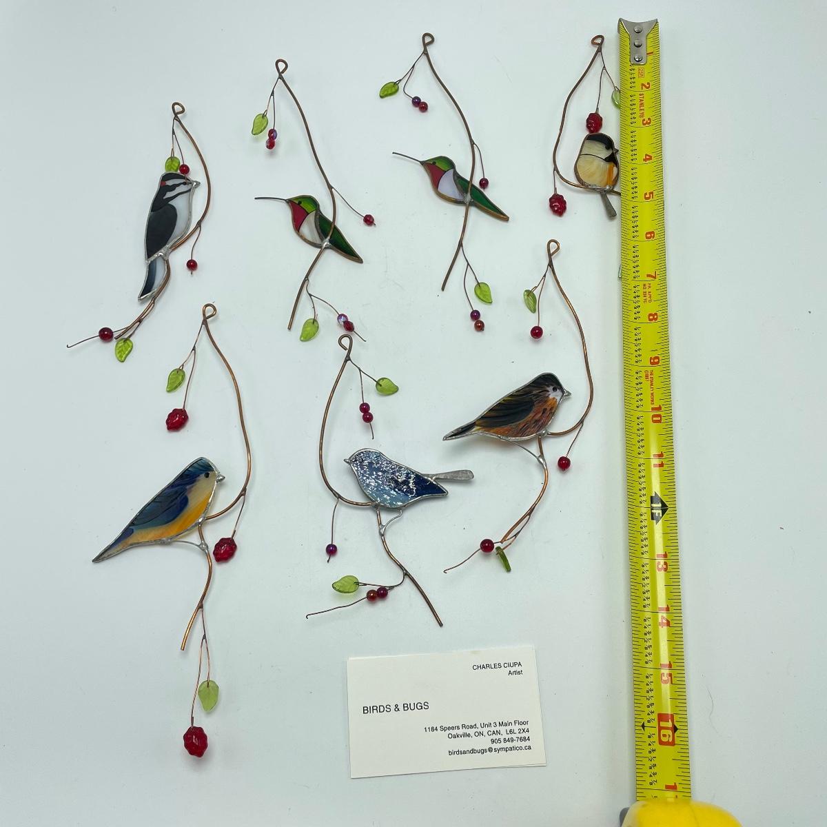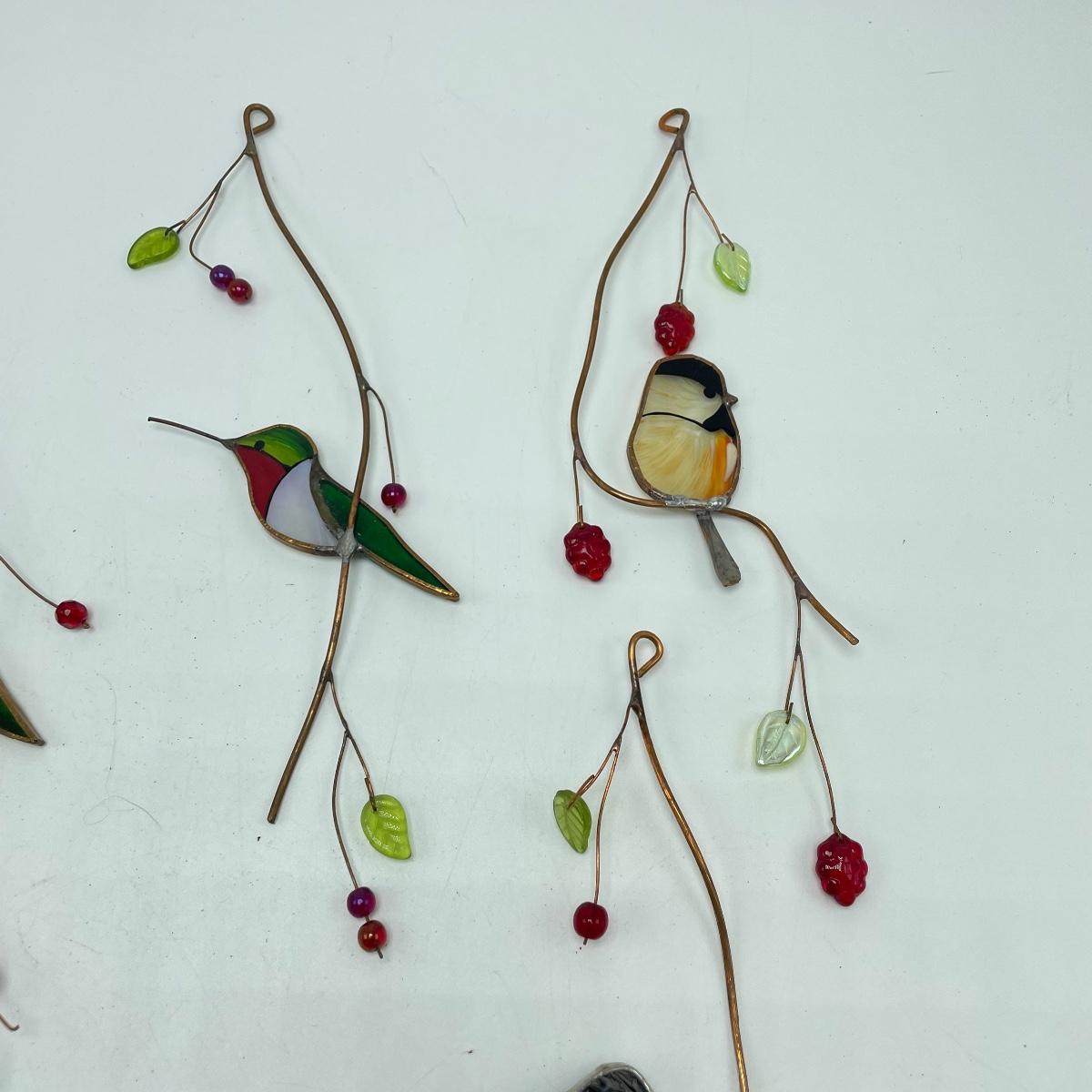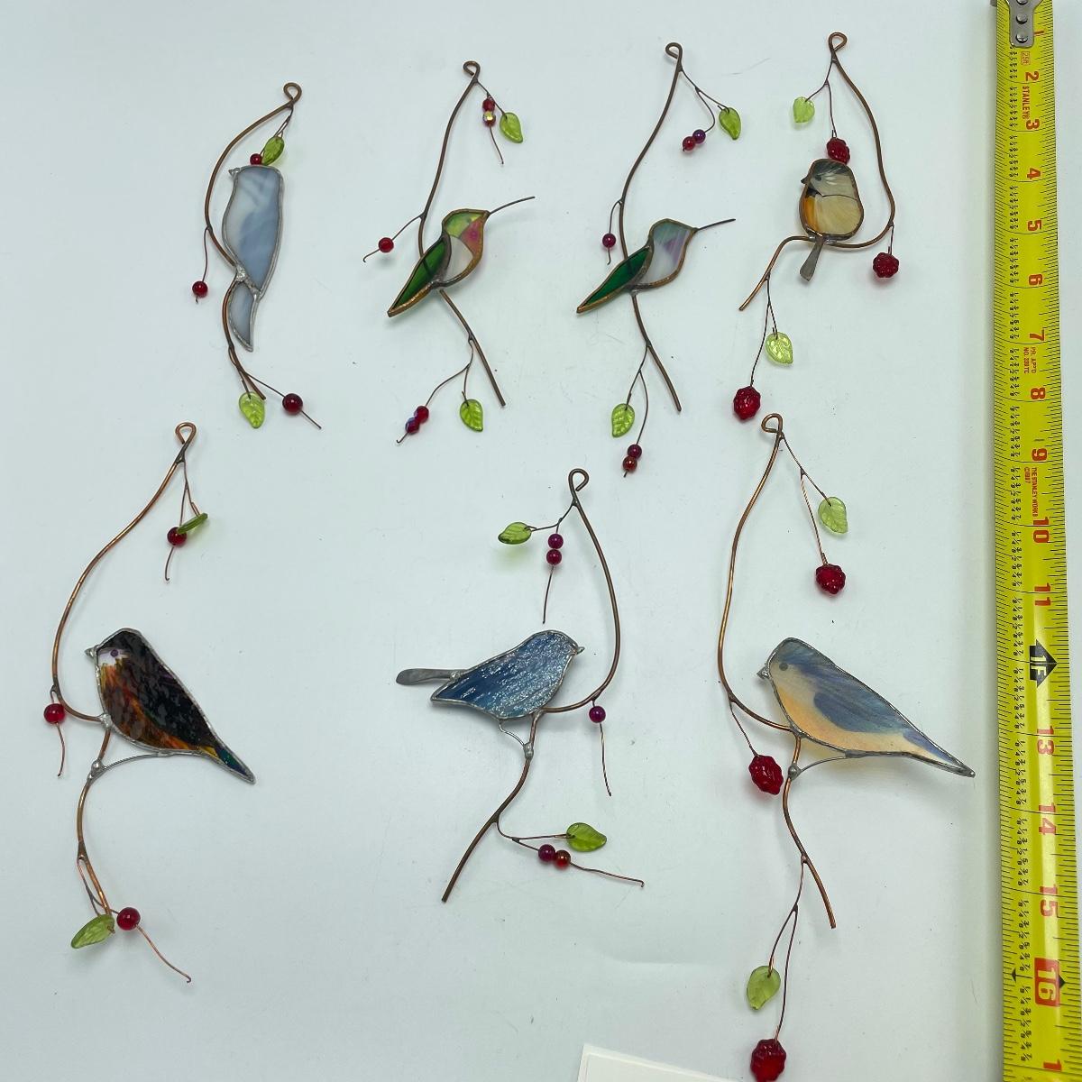 Wrens, Jays, Hummingbirds with brightly colored stained glass light catchers by Charles Ciupa. Seven stained glass pieces attached to wires for hanging and sprinkled with bright beads. See images. Shipping available.
