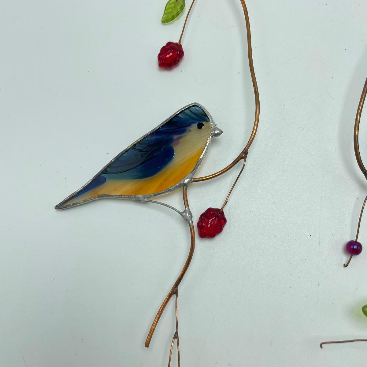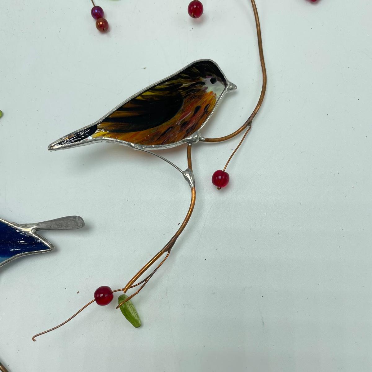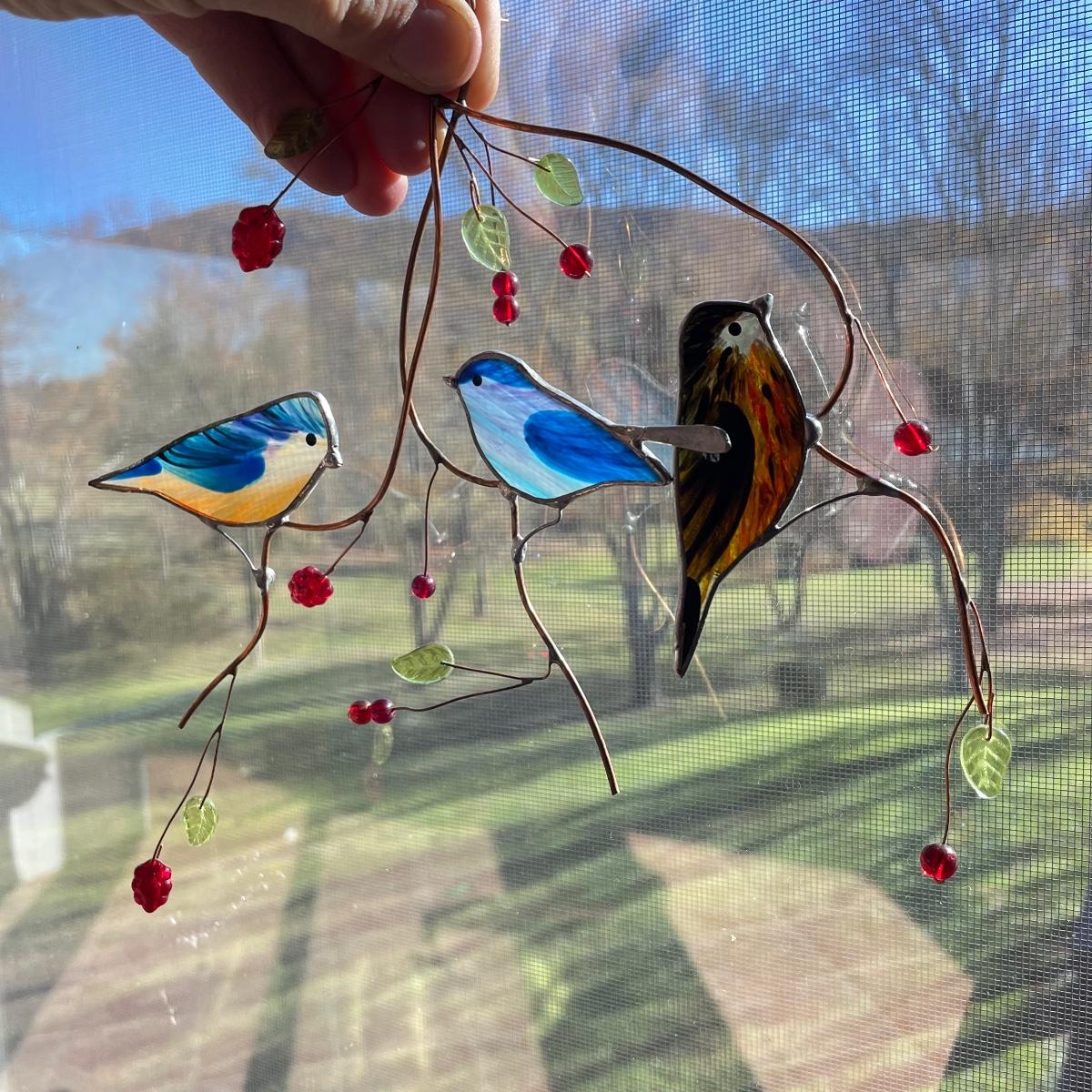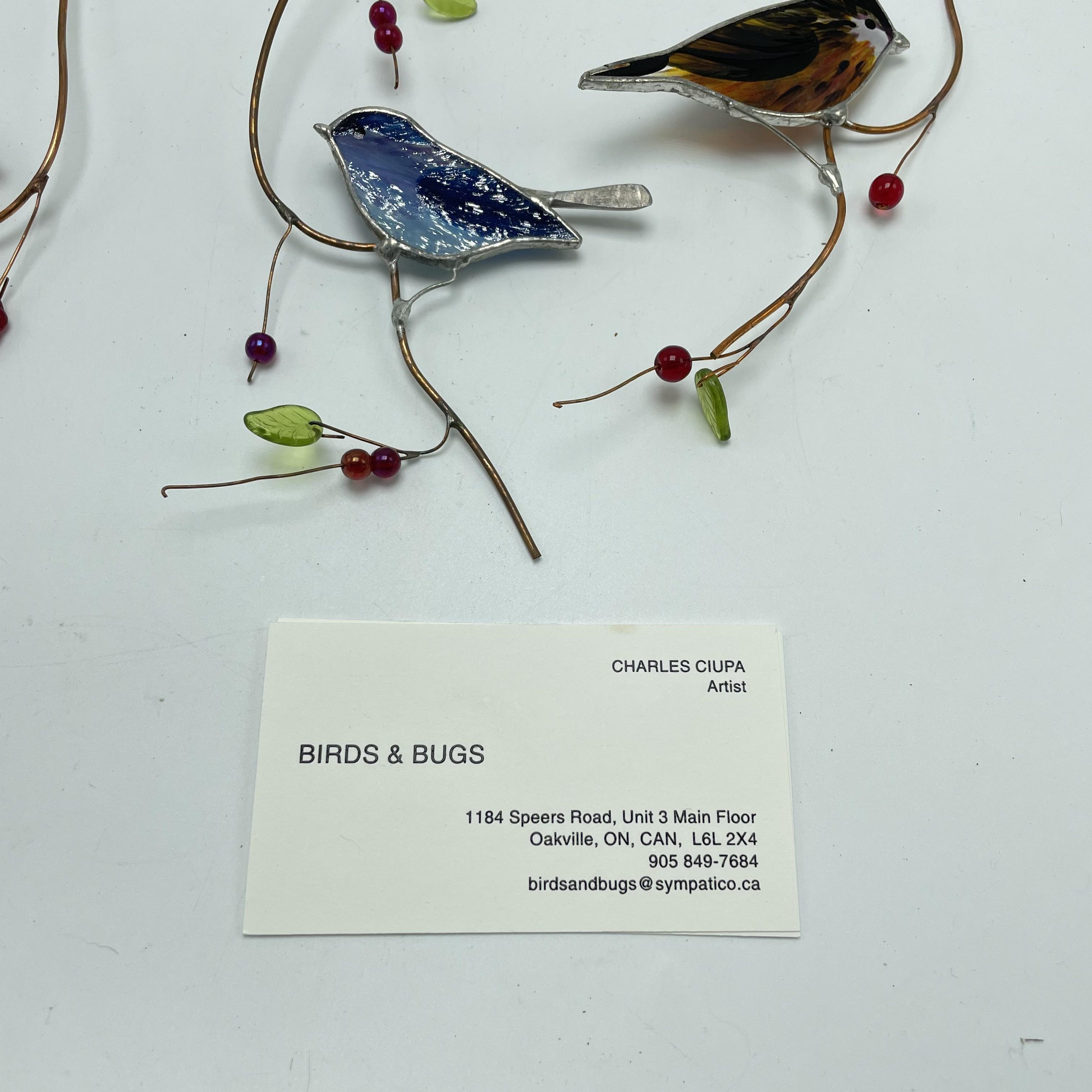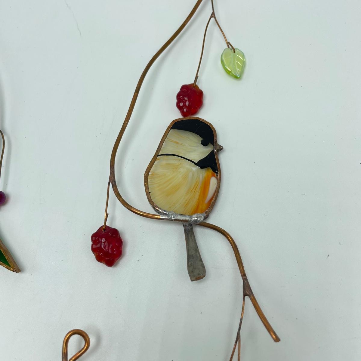 Wrens, Jays, Hummingbirds with brightly colored stained glass light catchers by Charles Ciupa. Seven stained glass pieces attached to wires for hanging and sprinkled with bright beads. See images. Shipping available.