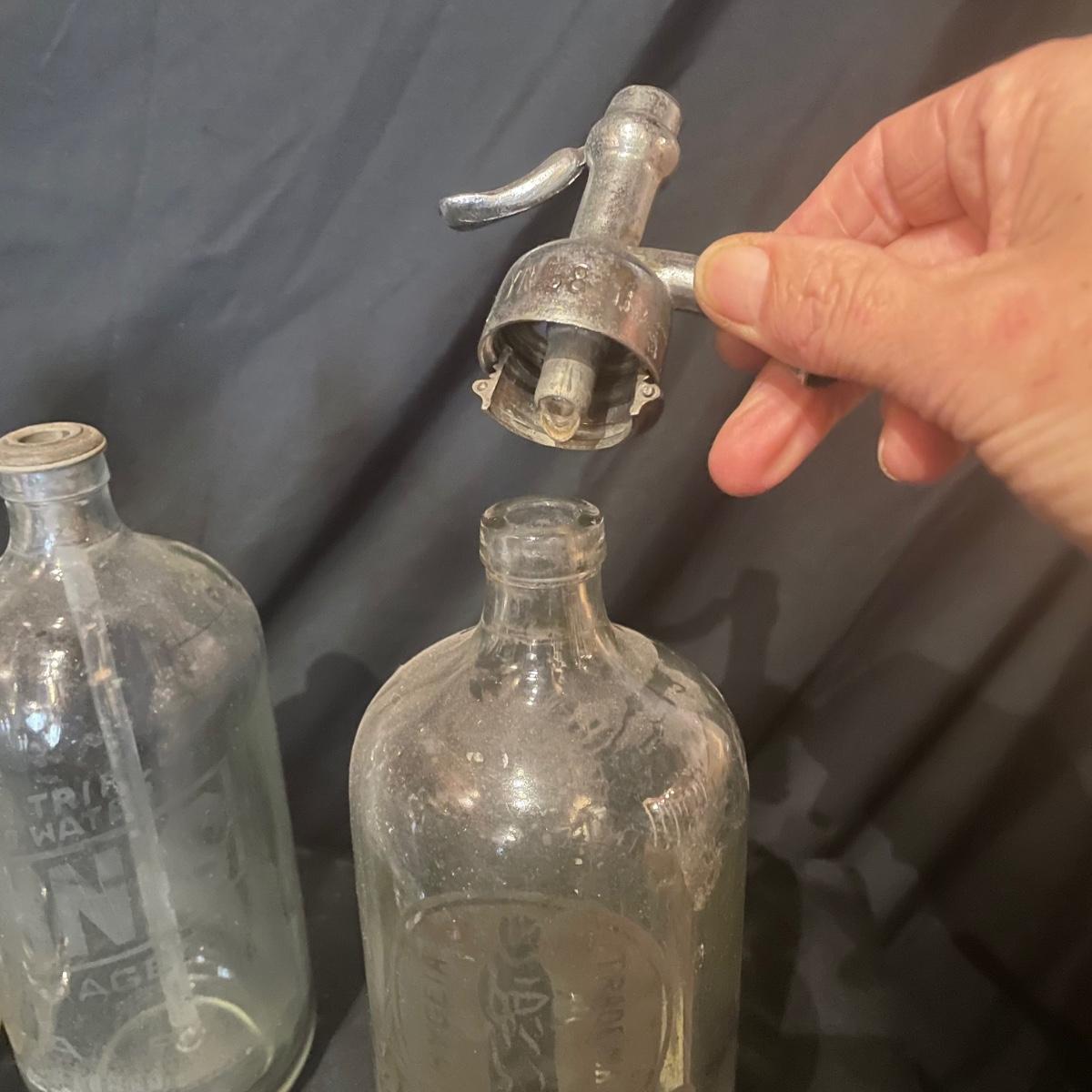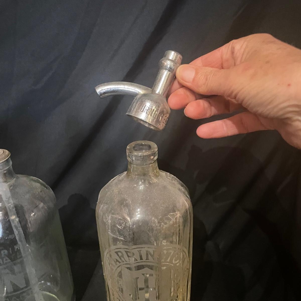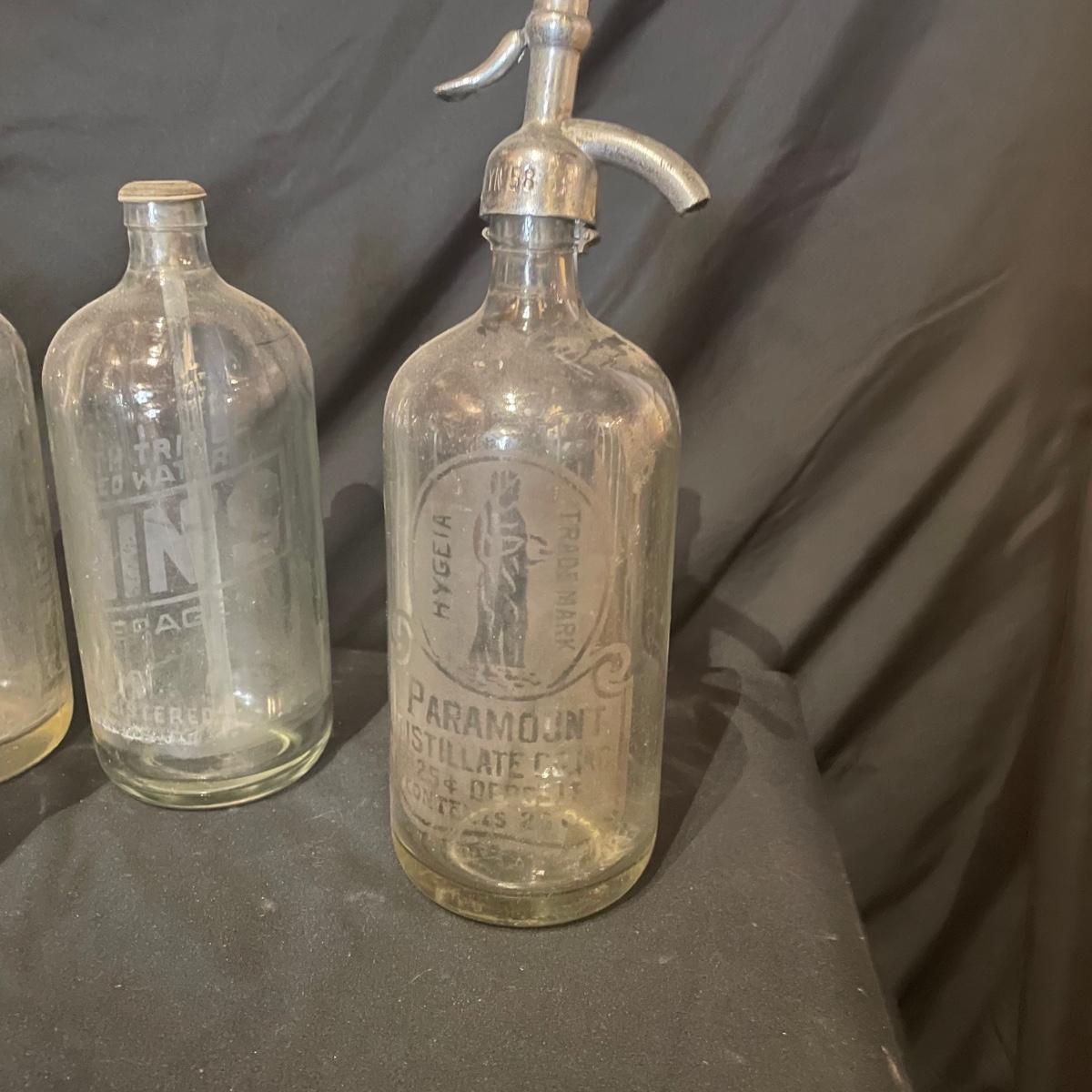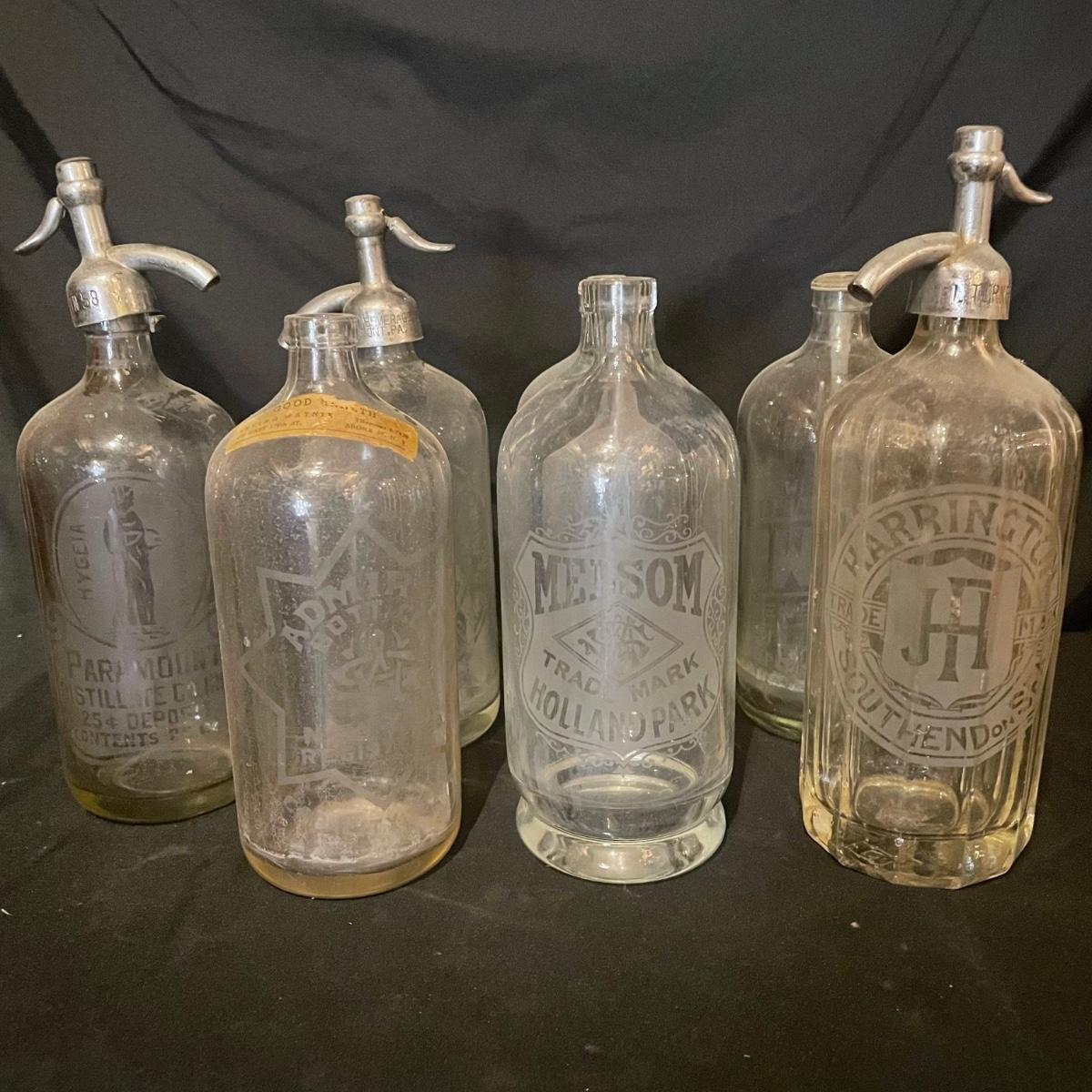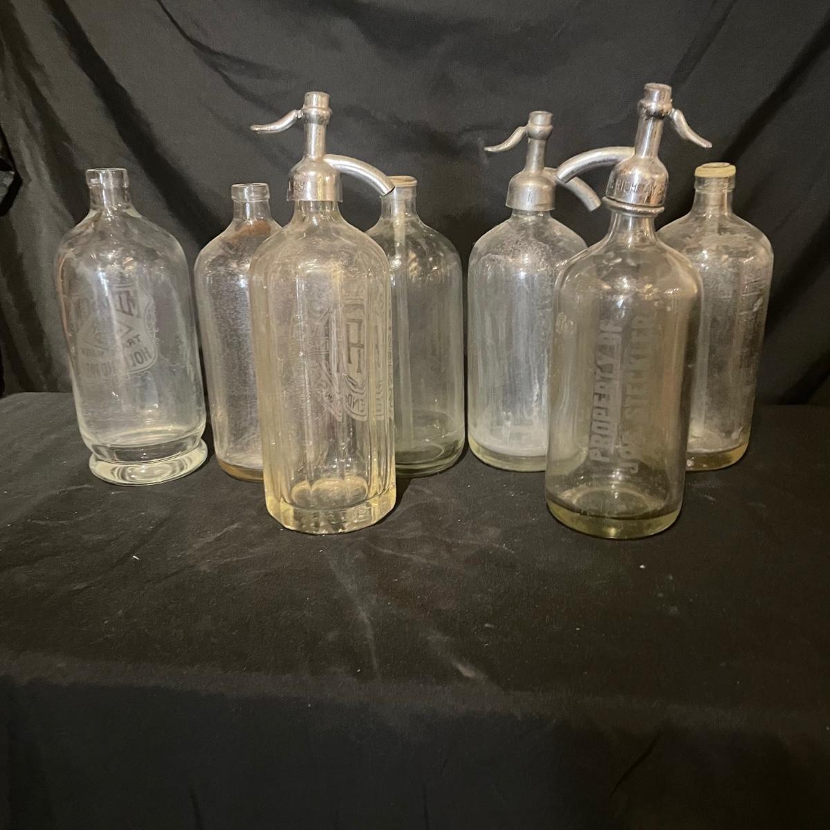 Of these seven vintage seltzer bottles three have tops and two have glass straws; one top appears to be broken. Some of the names include Irwins, Paramount and Harringtons distilleries.