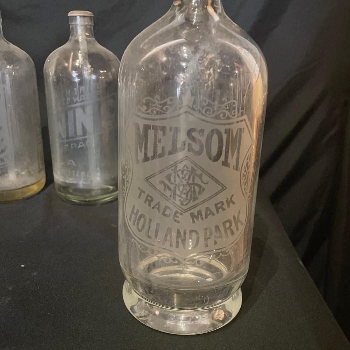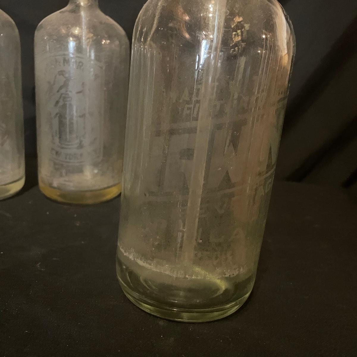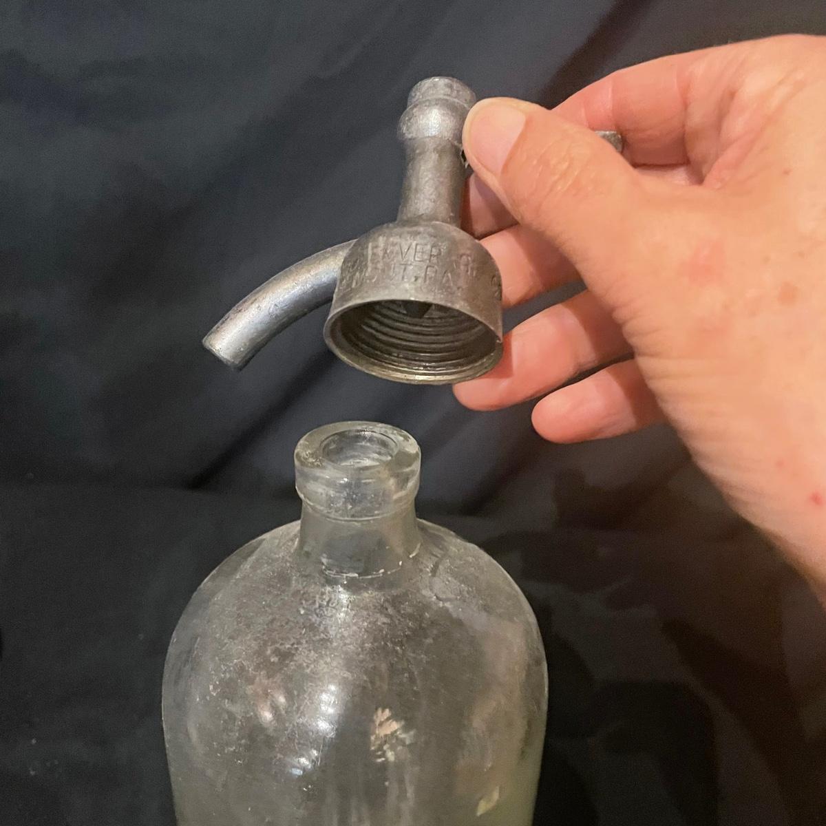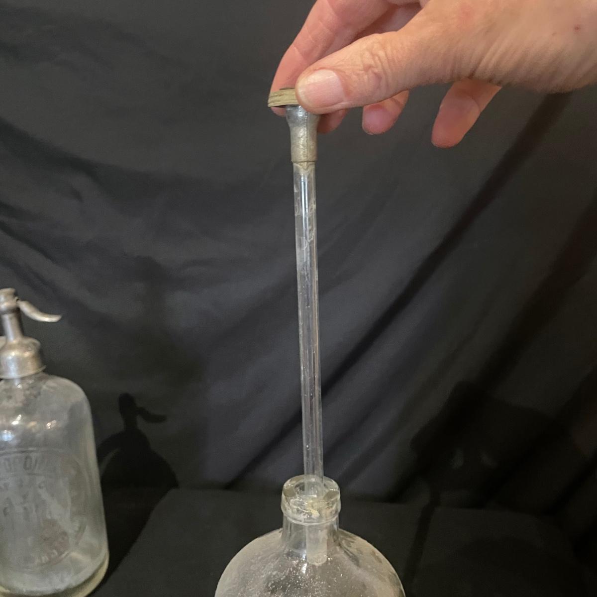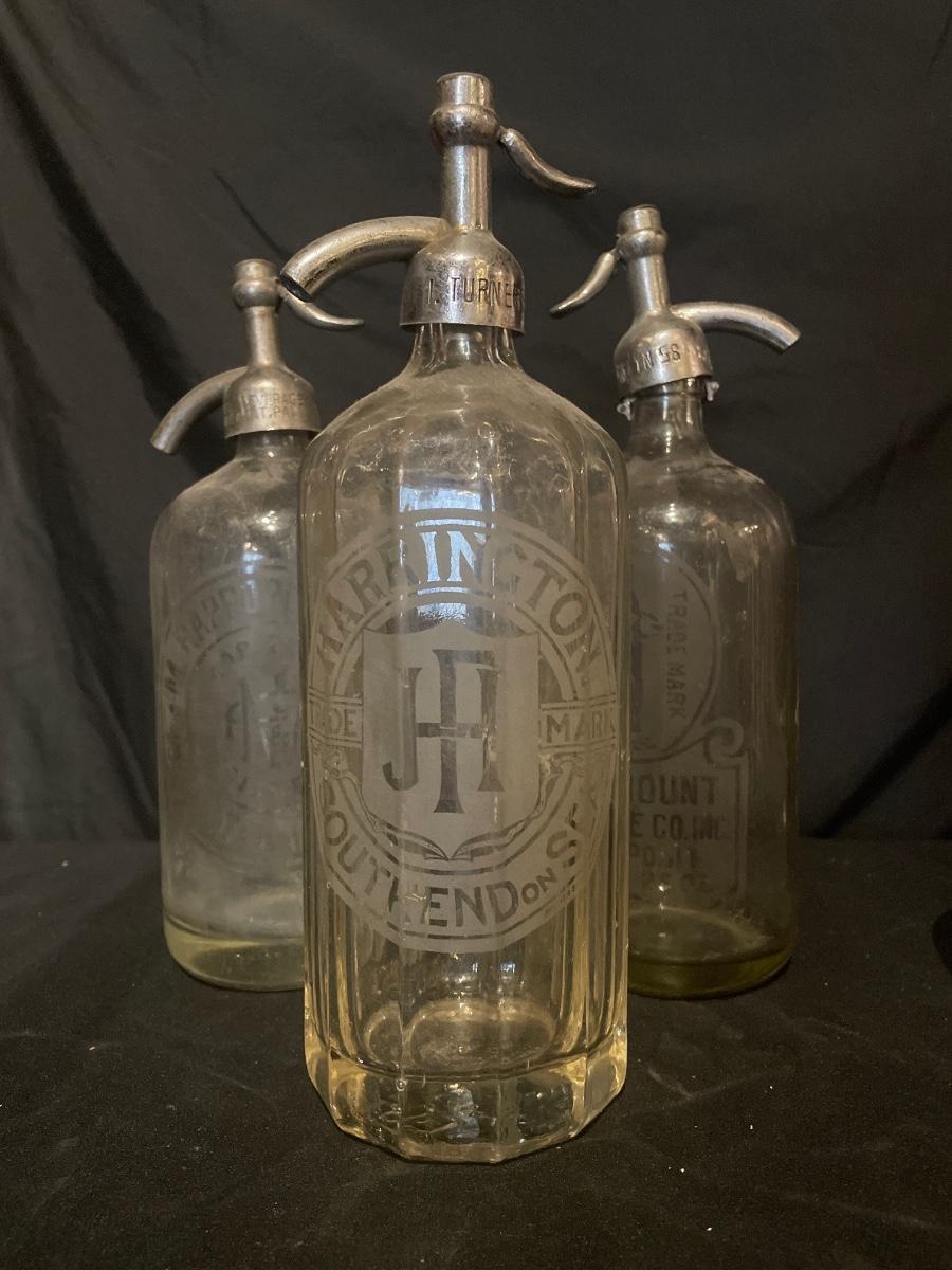 Of these seven vintage seltzer bottles three have tops and two have glass straws; one top appears to be broken. Some of the names include Irwins, Paramount and Harringtons distilleries.