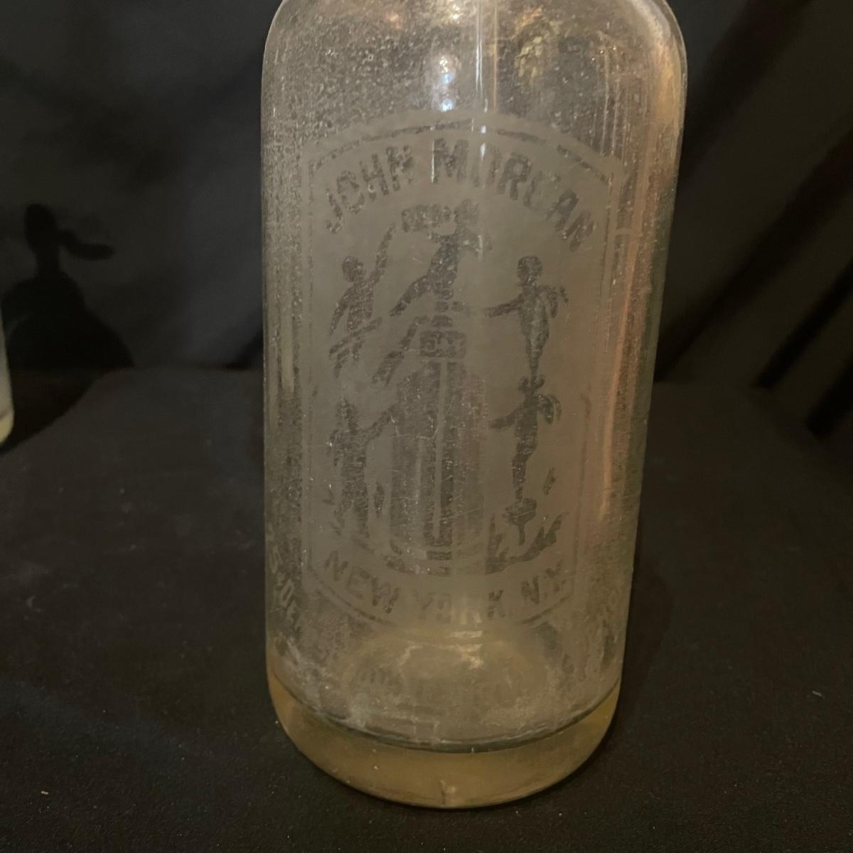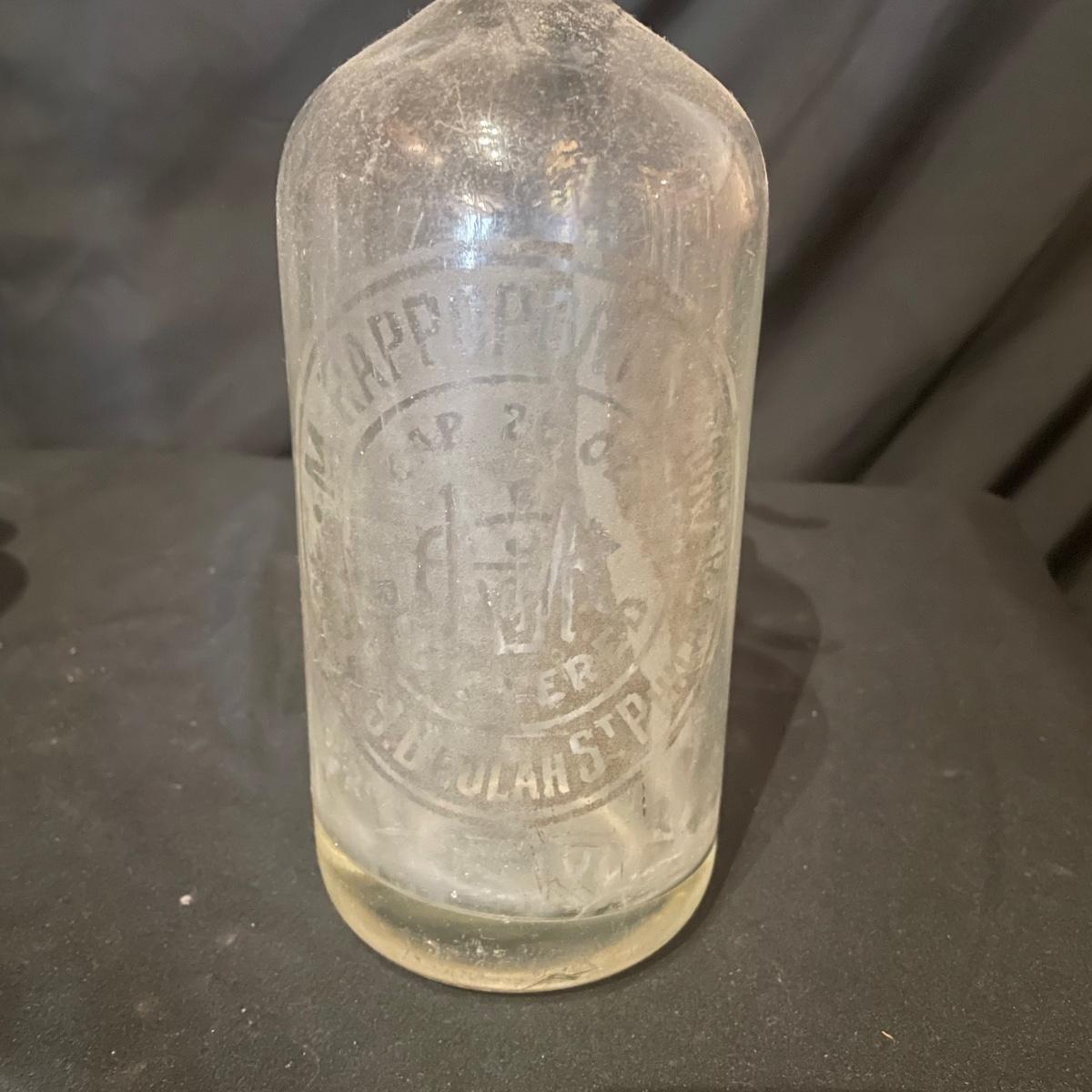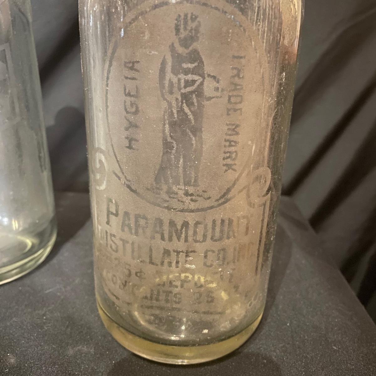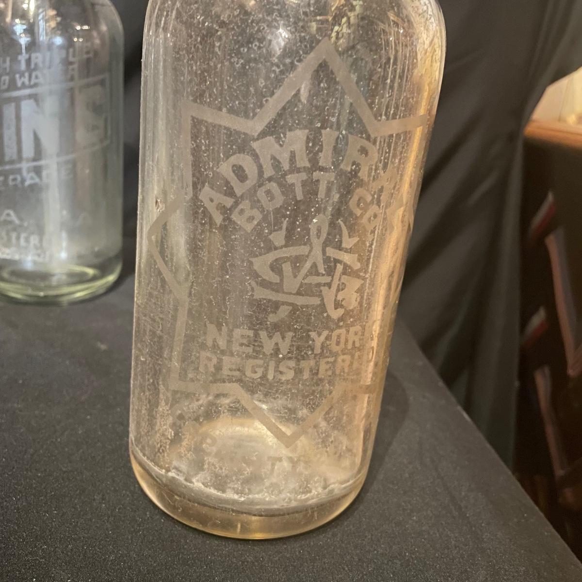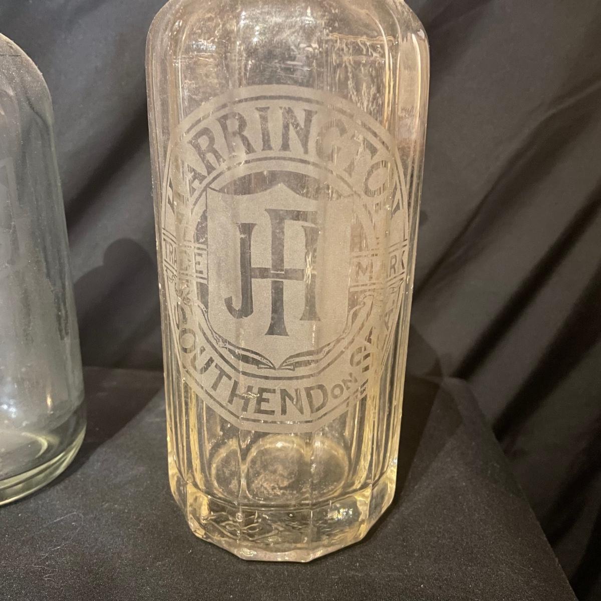 Of these seven vintage seltzer bottles three have tops and two have glass straws; one top appears to be broken. Some of the names include Irwins, Paramount and Harringtons distilleries.