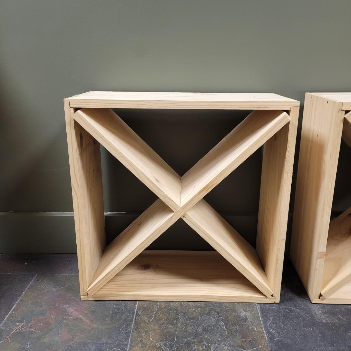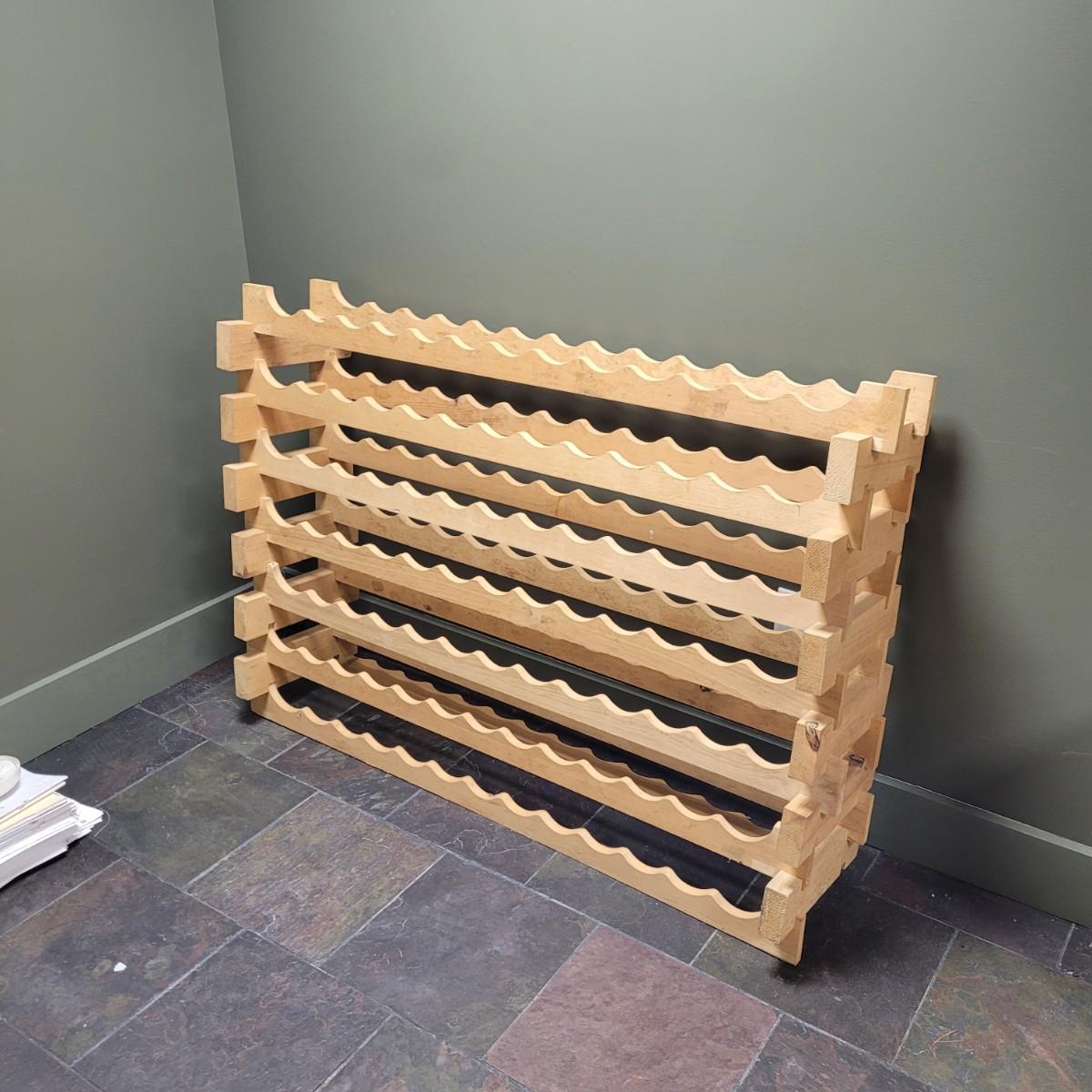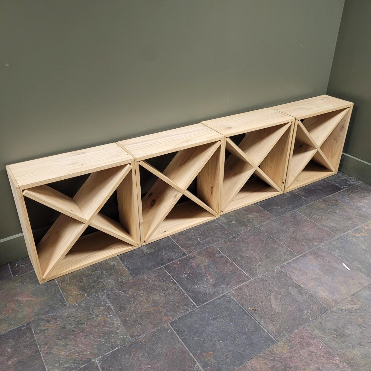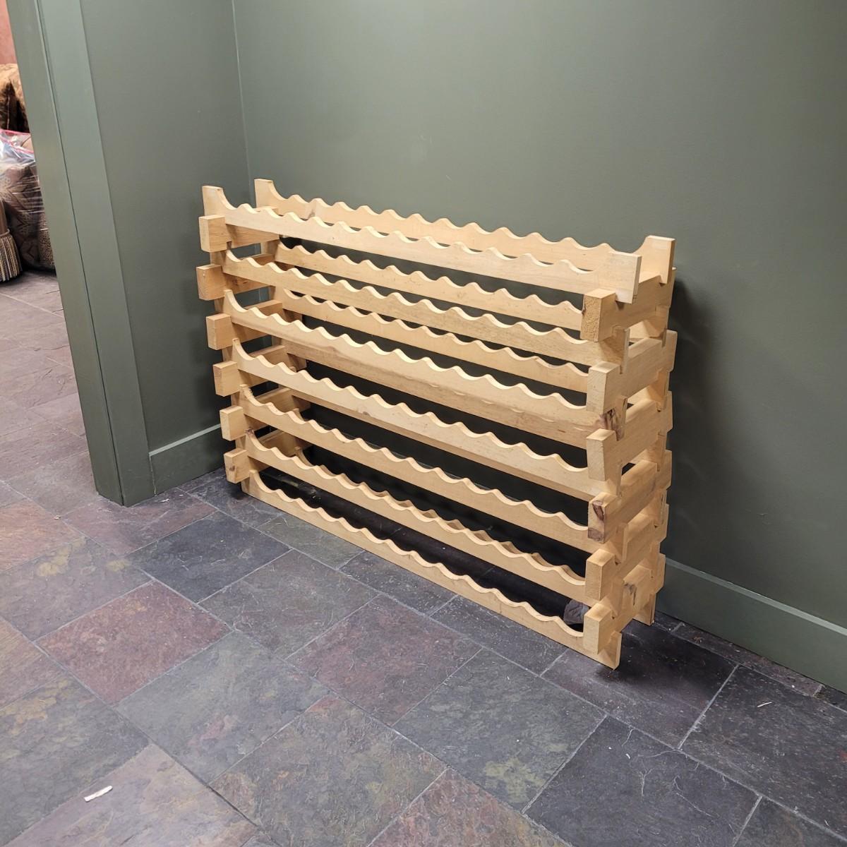 A total of seven wooden wine racks make up this lot. The three wide racks each hold 91 bottles (13 slots with 7 rows). Wide racks break down completely and use no hardware. The four squares are attached with hardware but the inserts are removable. Wood appears unfinished and untreated. Wide racks measure approximately 48" x 12" x 34"H. The squares measure 20"SQ. Local pickup only.