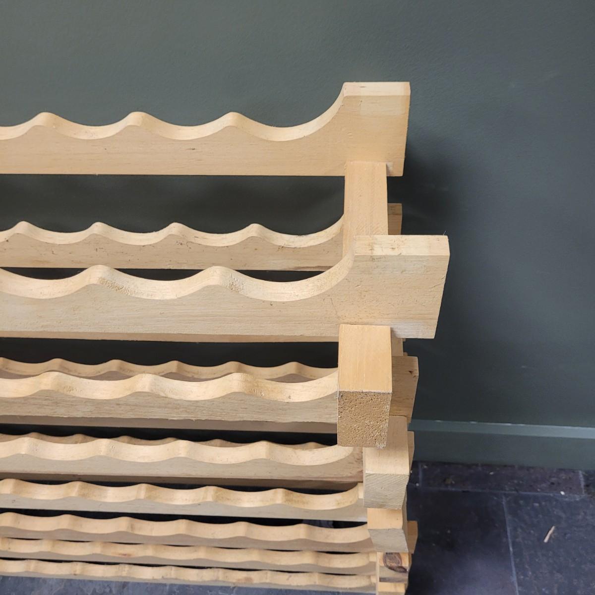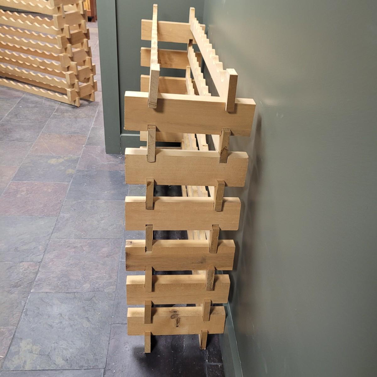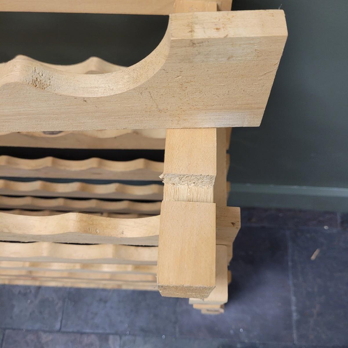 A total of seven wooden wine racks make up this lot. The three wide racks each hold 91 bottles (13 slots with 7 rows). Wide racks break down completely and use no hardware. The four squares are attached with hardware but the inserts are removable. Wood appears unfinished and untreated. Wide racks measure approximately 48" x 12" x 34"H. The squares measure 20"SQ. Local pickup only.