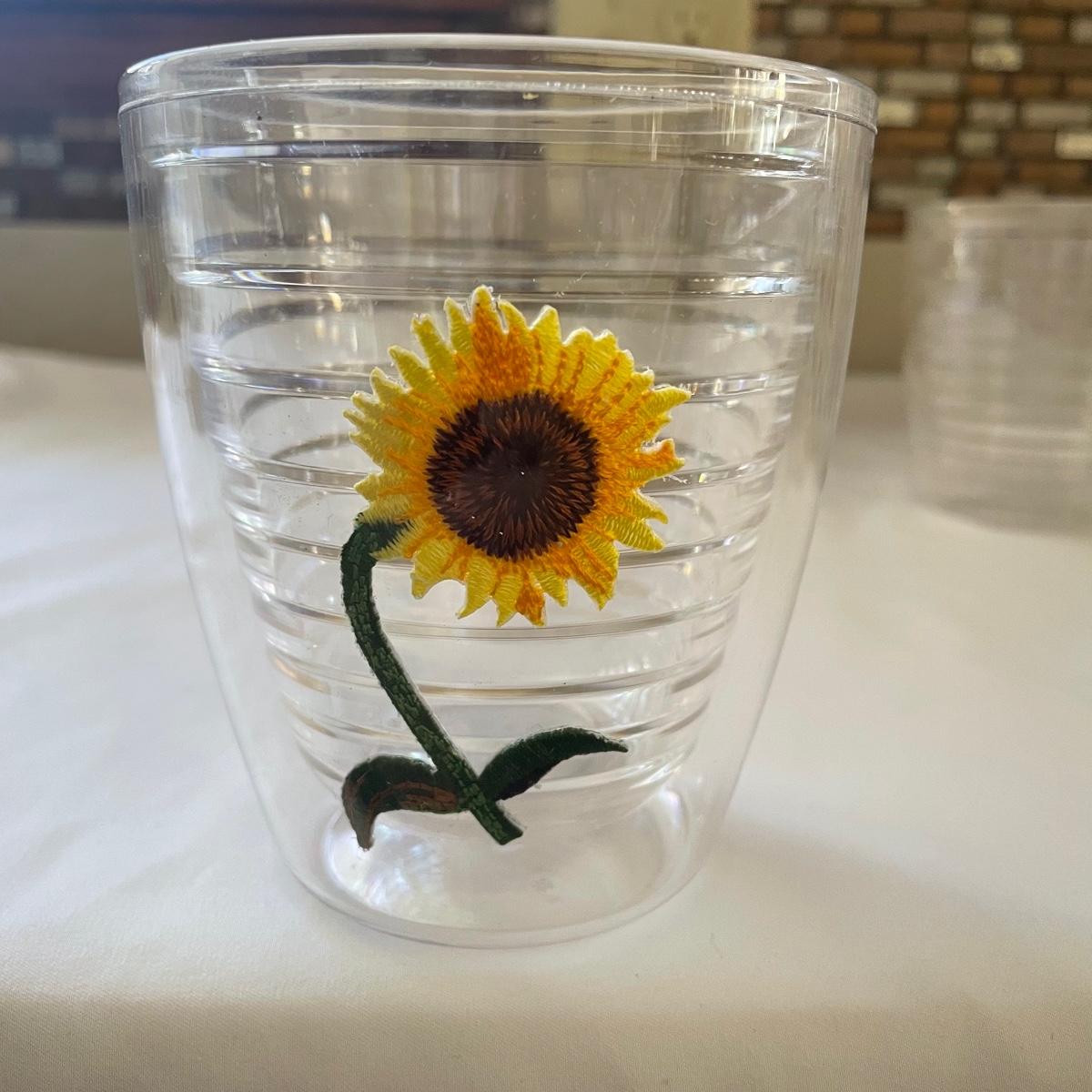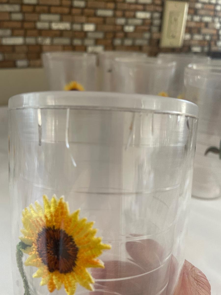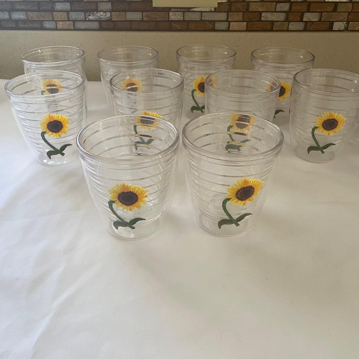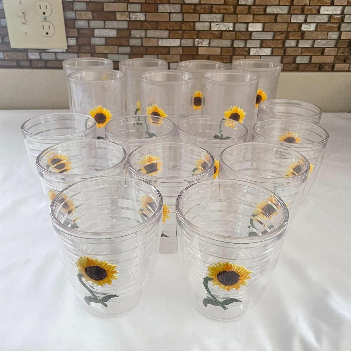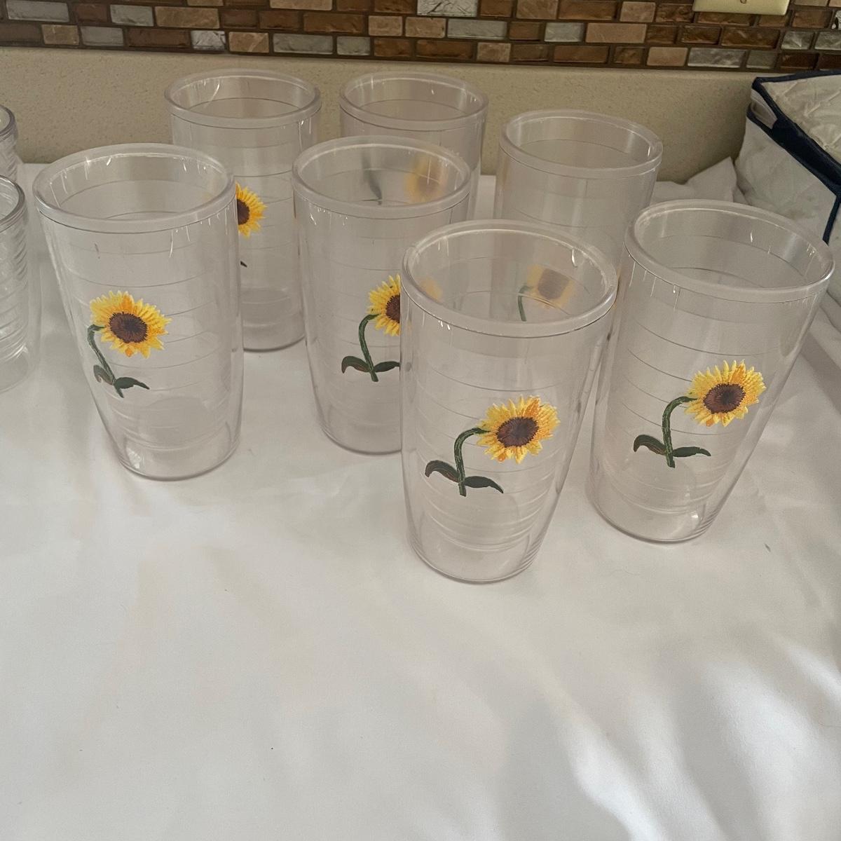 A total of seventeen Tervis tumblers with the sunflower motif. Ten are mid sized tumblers in excellent condition, the seven taller tumblers have seen a lot more use and are showing signs of wear, see images.