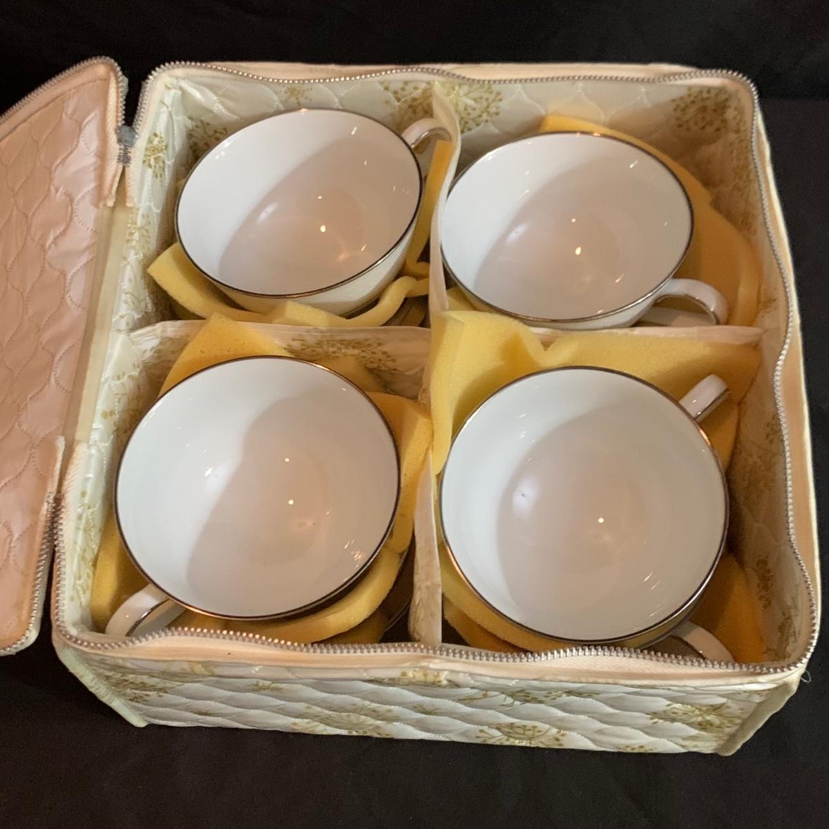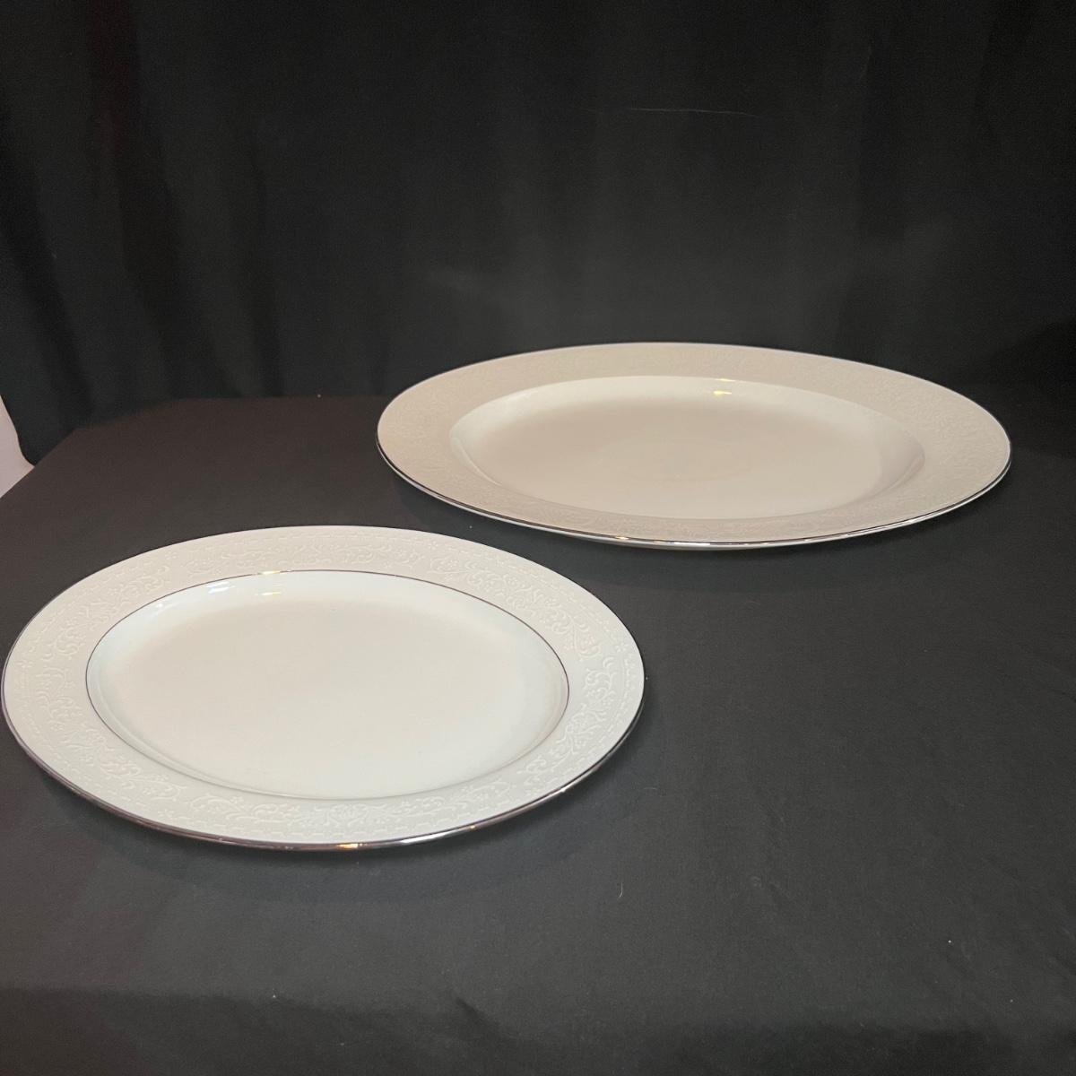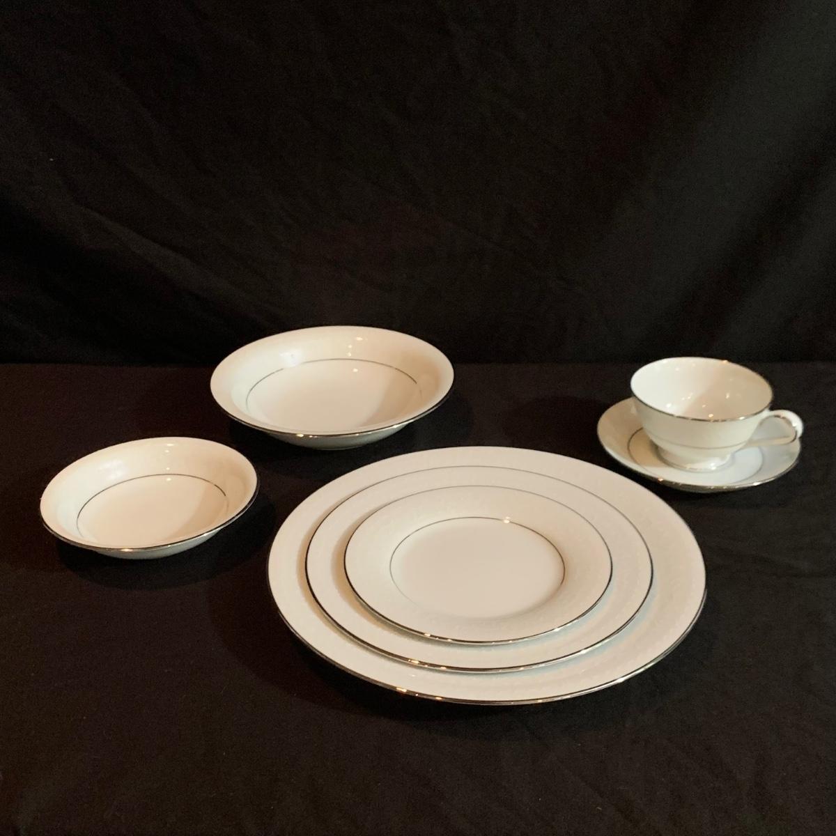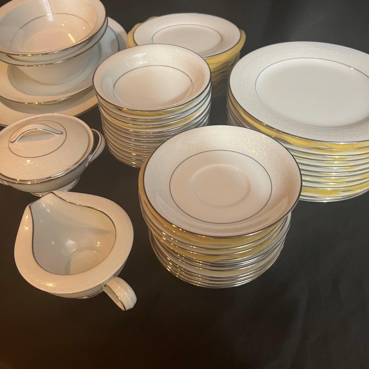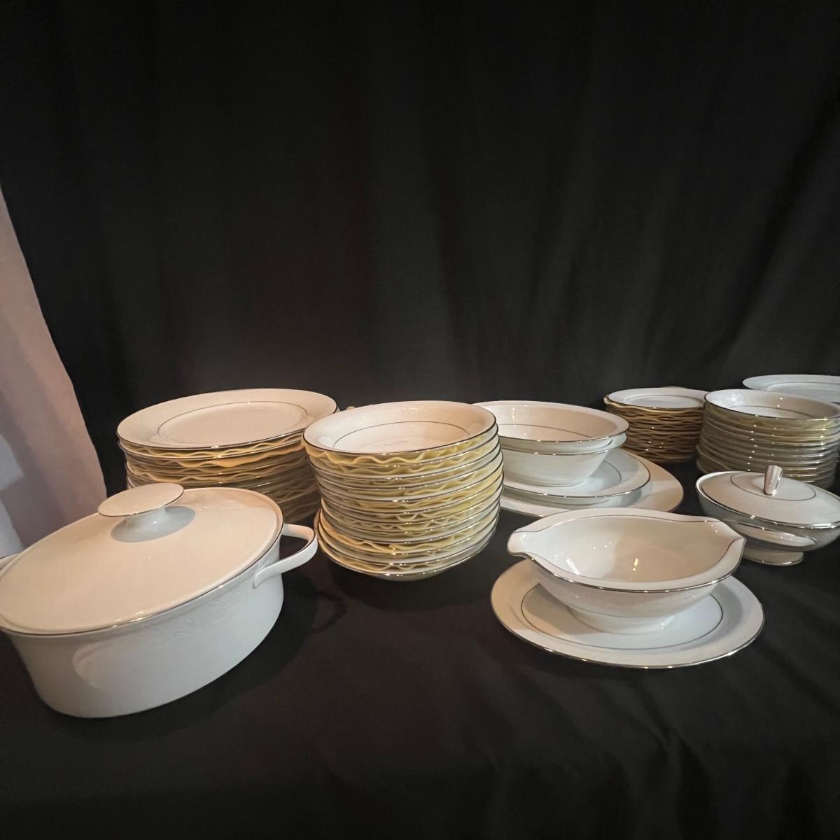 This lovingly cared for set includes a 12 person setting with bread, salad and dinner plates (10.25” D) plus saucers, cups, soup and dessert bowls, two serving bowls, two platters and a lidded bowl. Foam protectors are between the plates. Lot also includes seven storage bags. Please see photos to view the lovely delicate design that decorates the dishes.