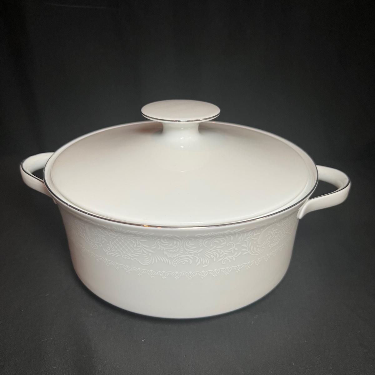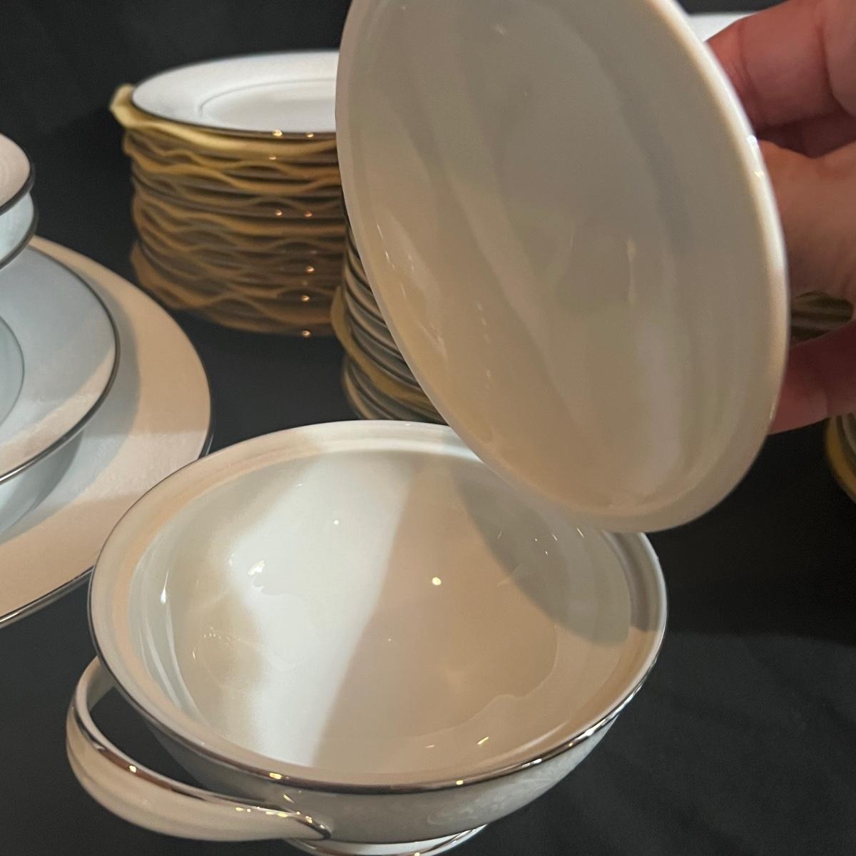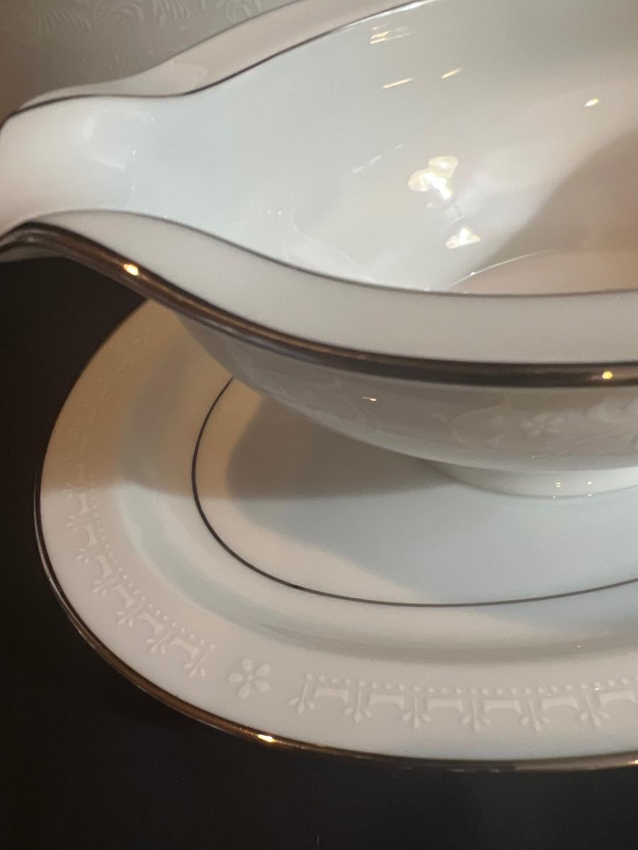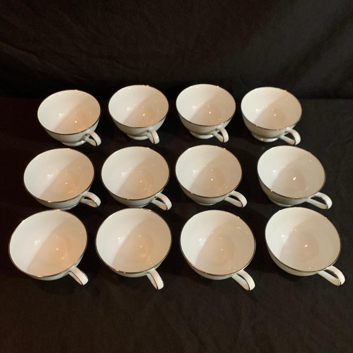 This lovingly cared for set includes a 12 person setting with bread, salad and dinner plates (10.25” D) plus saucers, cups, soup and dessert bowls, two serving bowls, two platters and a lidded bowl. Foam protectors are between the plates. Lot also includes seven storage bags. Please see photos to view the lovely delicate design that decorates the dishes.