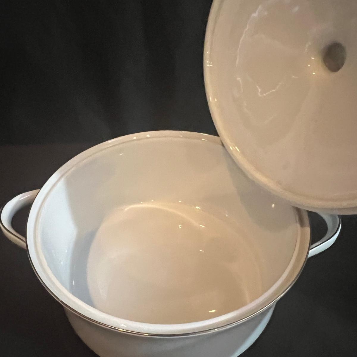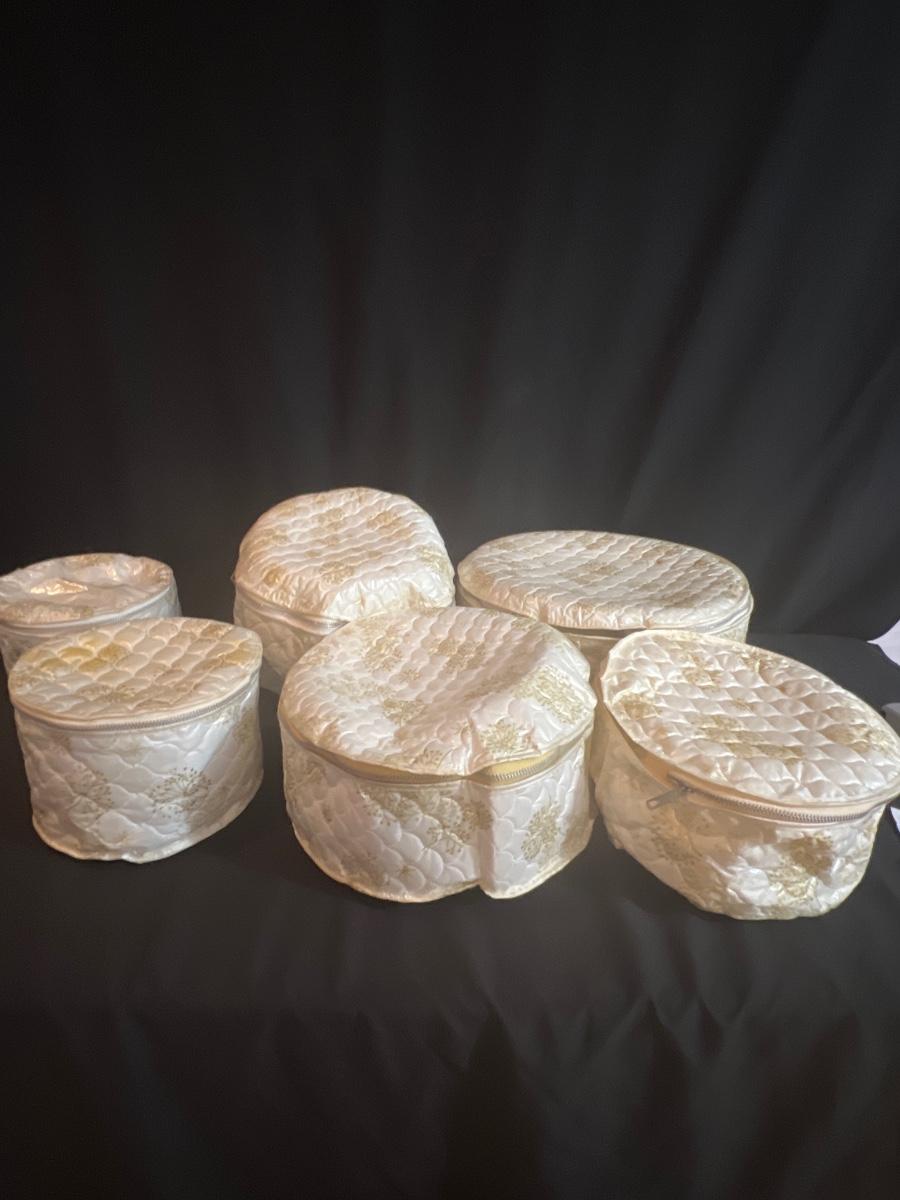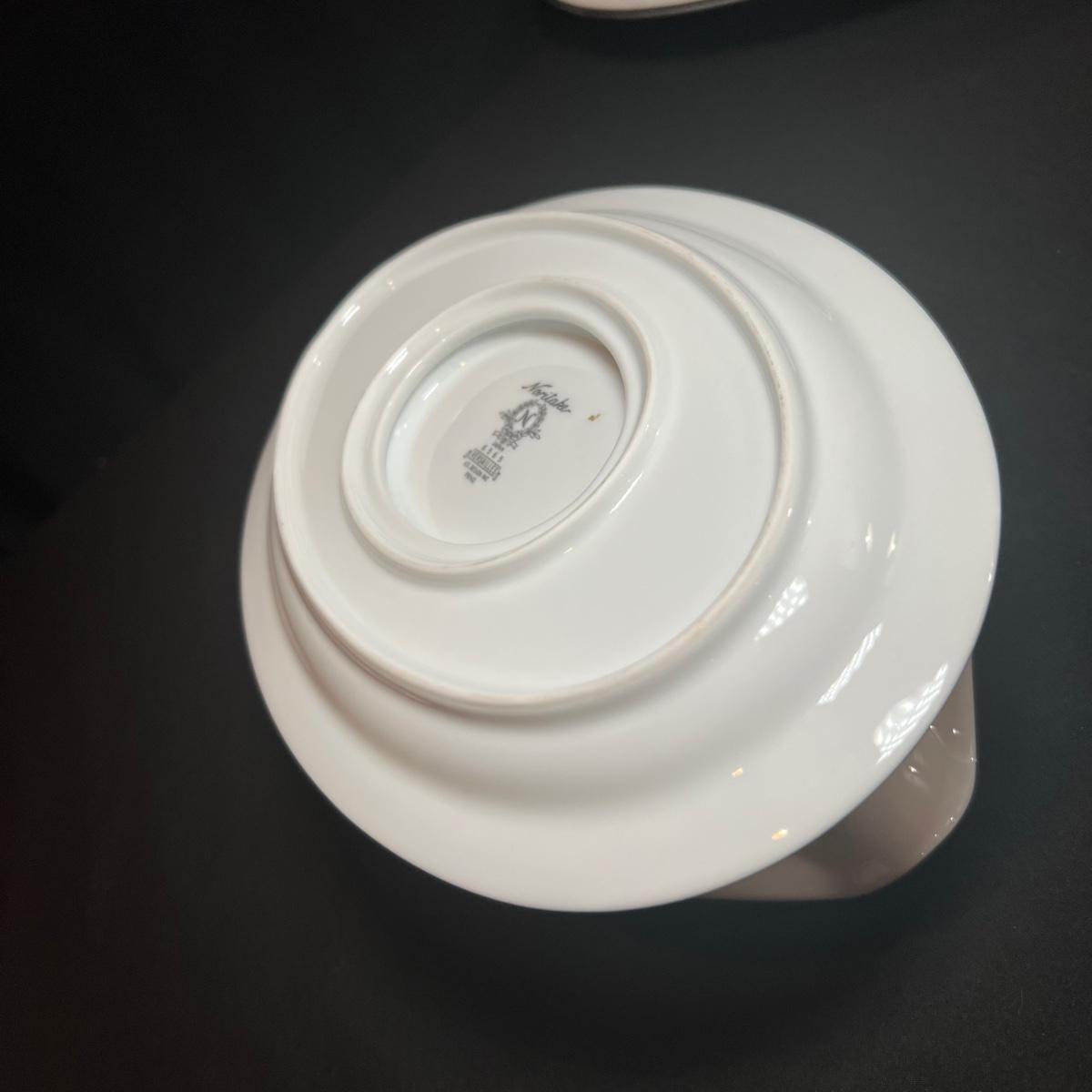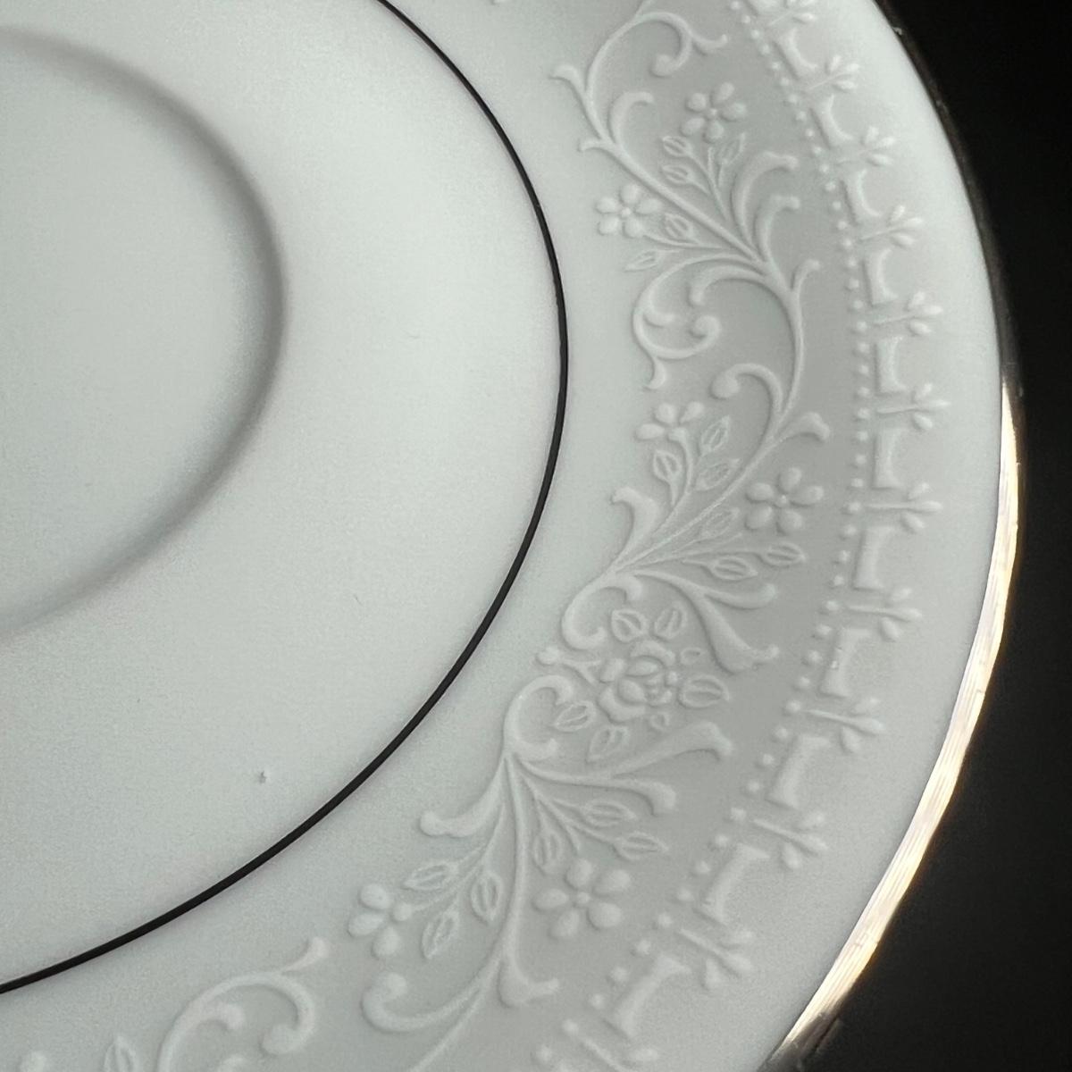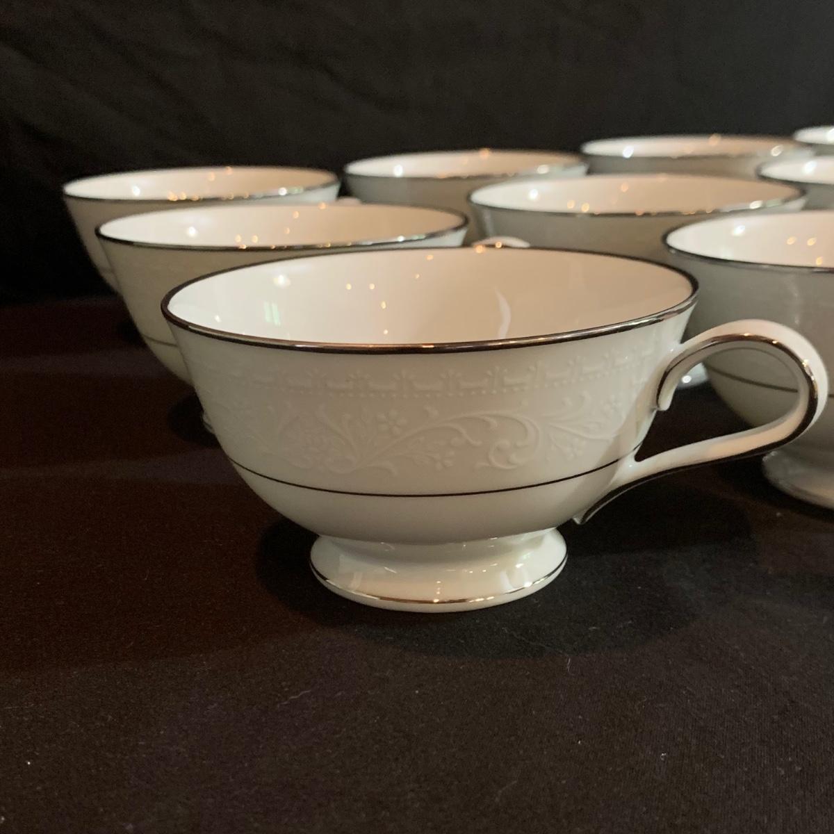 This lovingly cared for set includes a 12 person setting with bread, salad and dinner plates (10.25” D) plus saucers, cups, soup and dessert bowls, two serving bowls, two platters and a lidded bowl. Foam protectors are between the plates. Lot also includes seven storage bags. Please see photos to view the lovely delicate design that decorates the dishes.