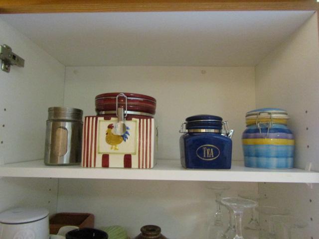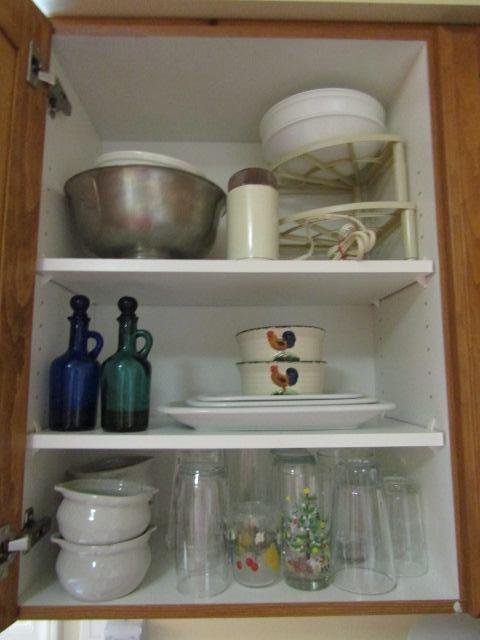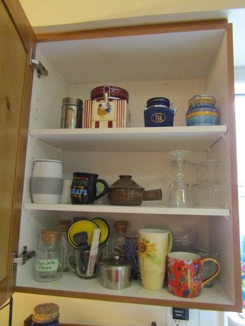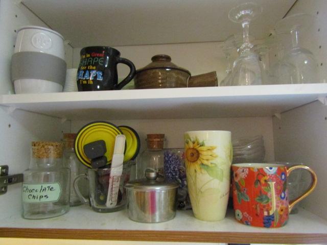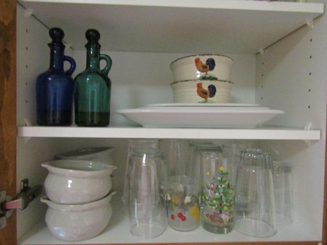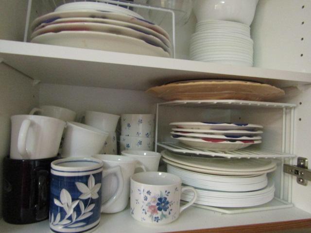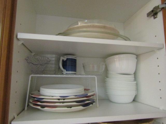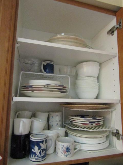 Several Cabinets of Misc Kitchen Goods- Glasses, Mugs, Corelle Dishes, Etc.