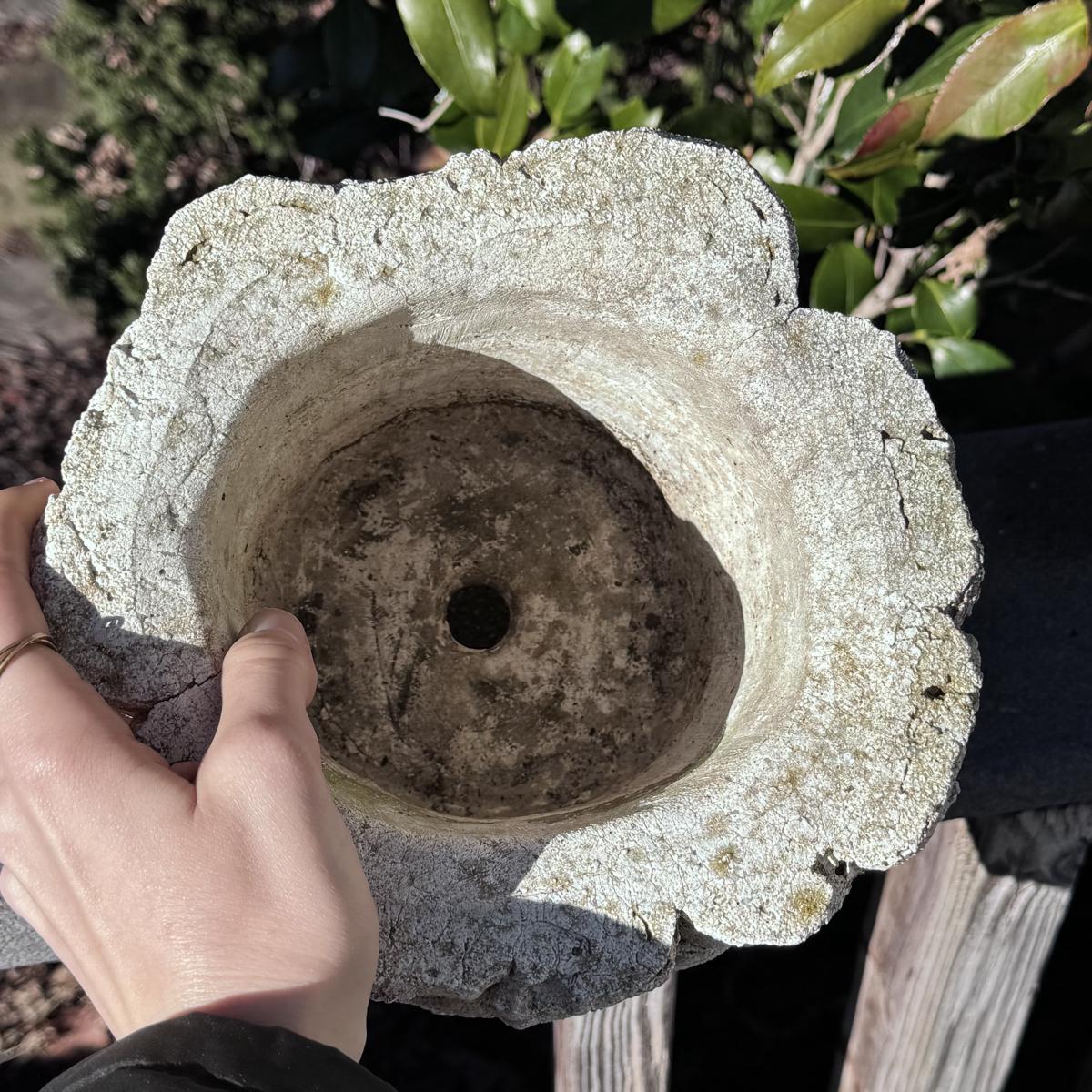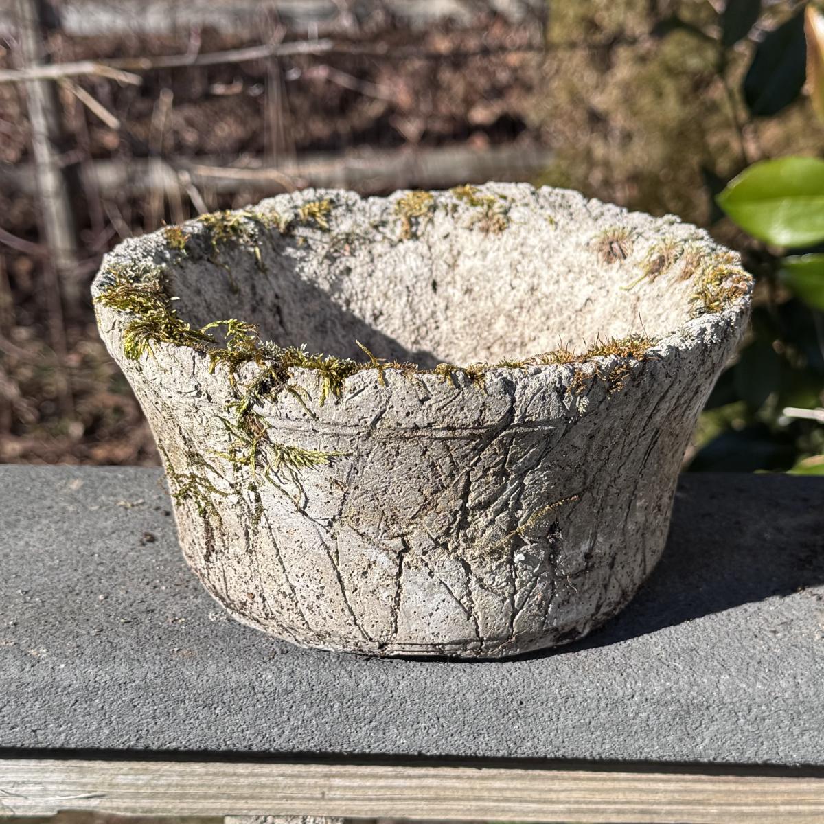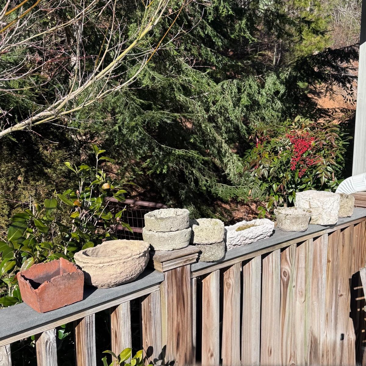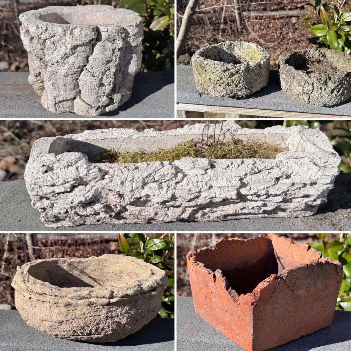 This lot includes ten variously shaped and sized cement planters. Every single planter has a drainage hole. A few of the planters have dirt or moss in them - buyer can dump if desired. The largest pot is the last one pictured that measures 8.5”D x 6”H. Local pickup only.