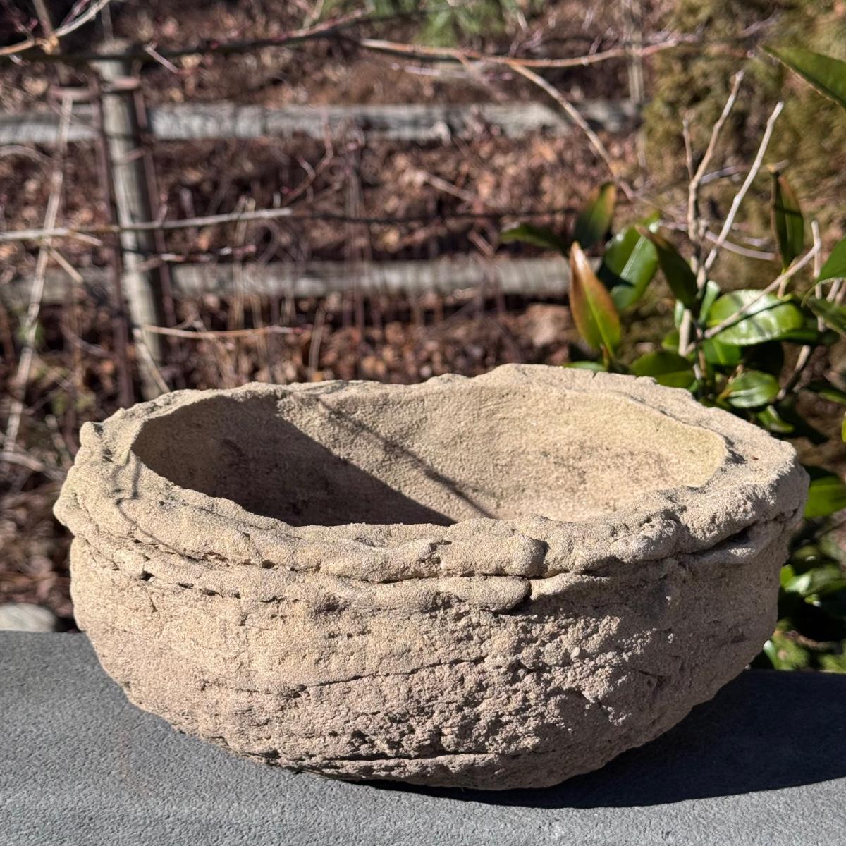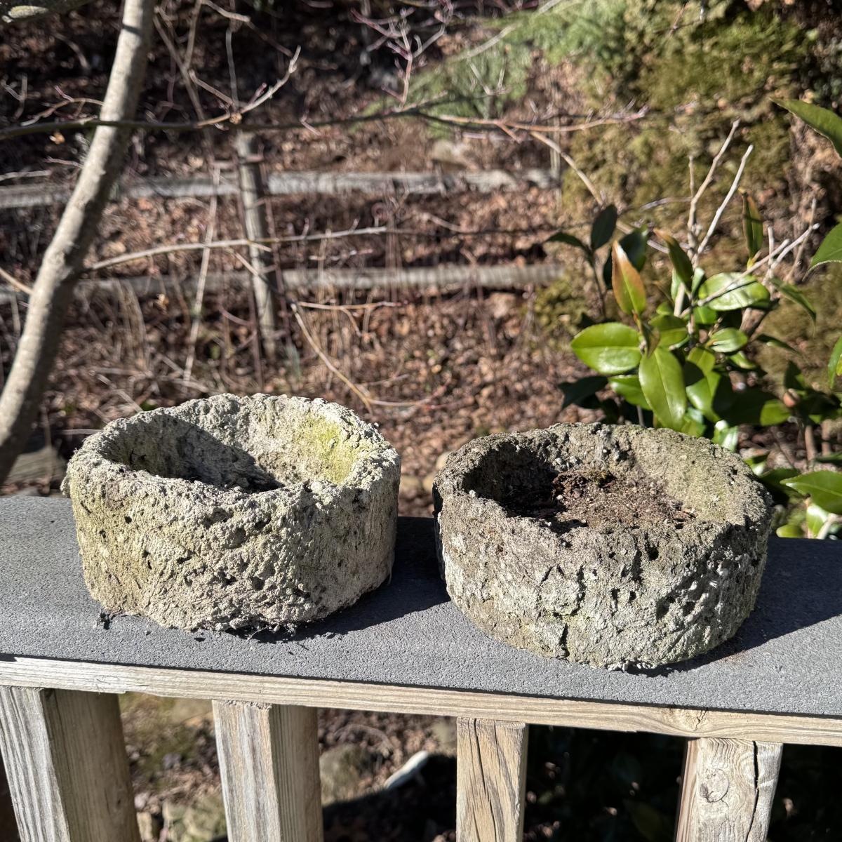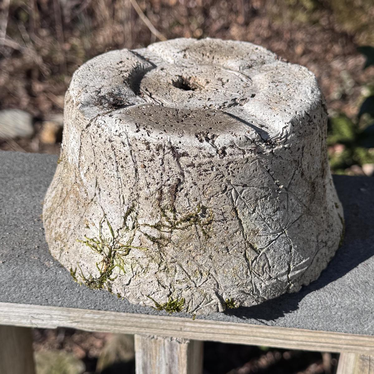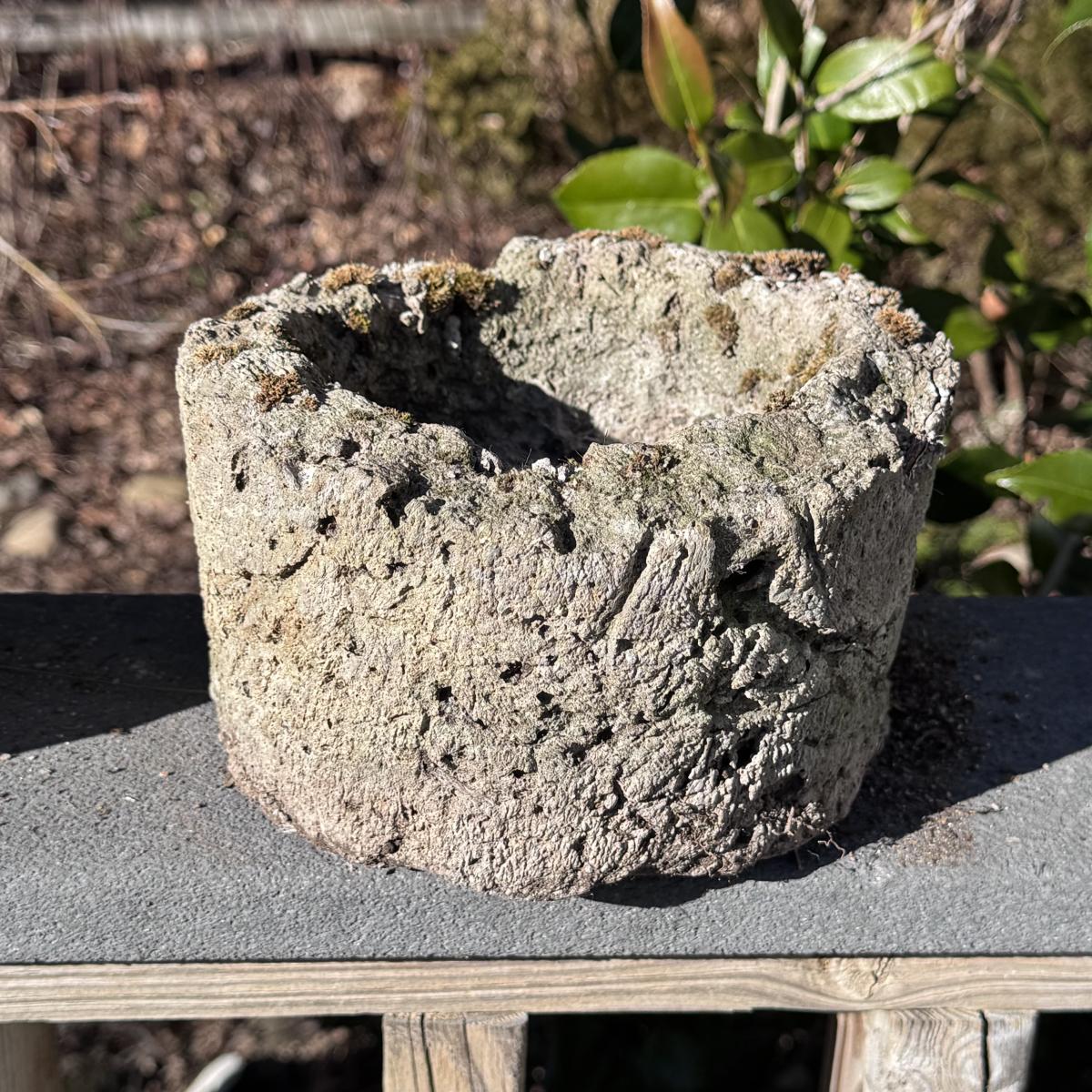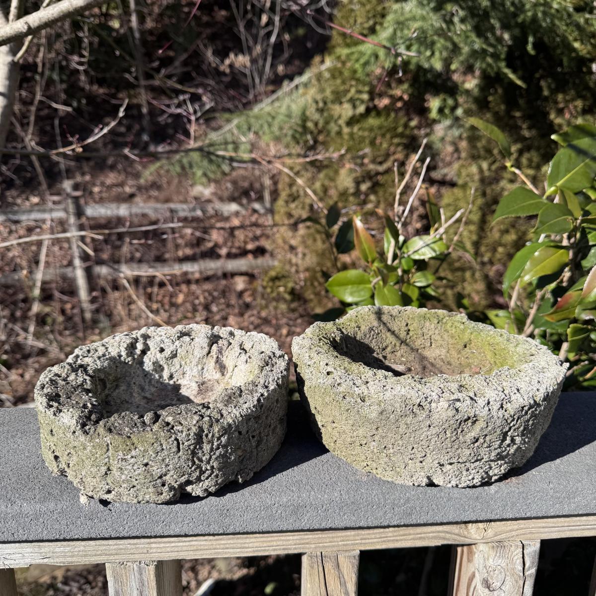 This lot includes ten variously shaped and sized cement planters. Every single planter has a drainage hole. A few of the planters have dirt or moss in them - buyer can dump if desired. The largest pot is the last one pictured that measures 8.5”D x 6”H. Local pickup only.
