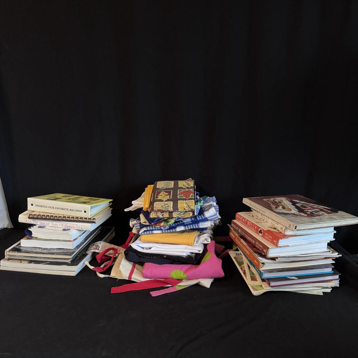 Several Cookbooks, Tea Towels, and Aprons (LR-DZ)