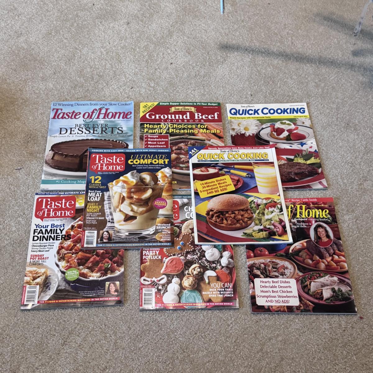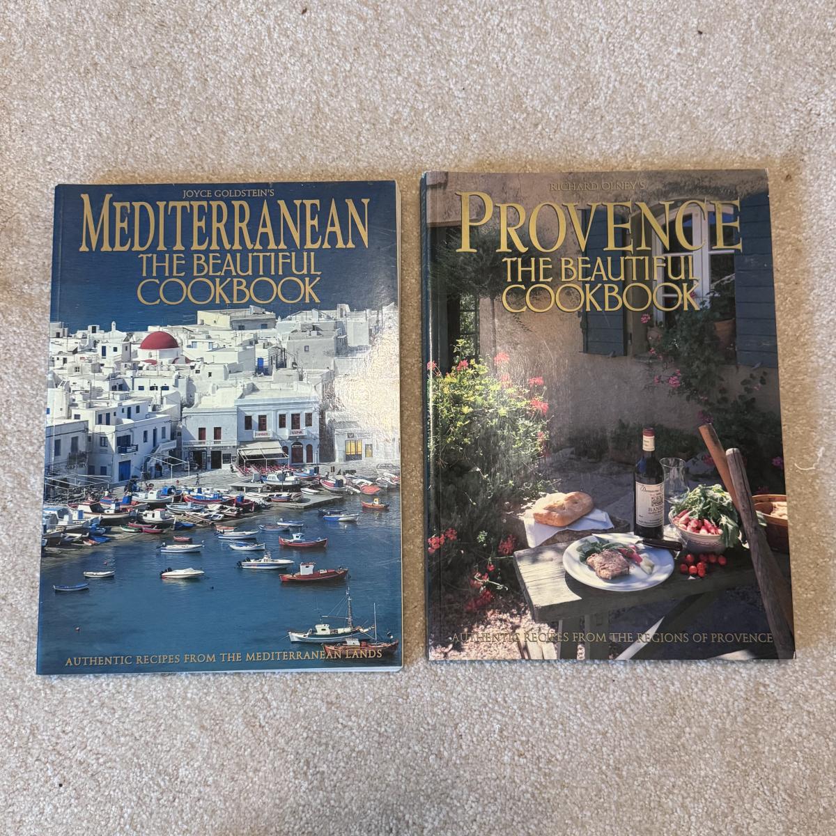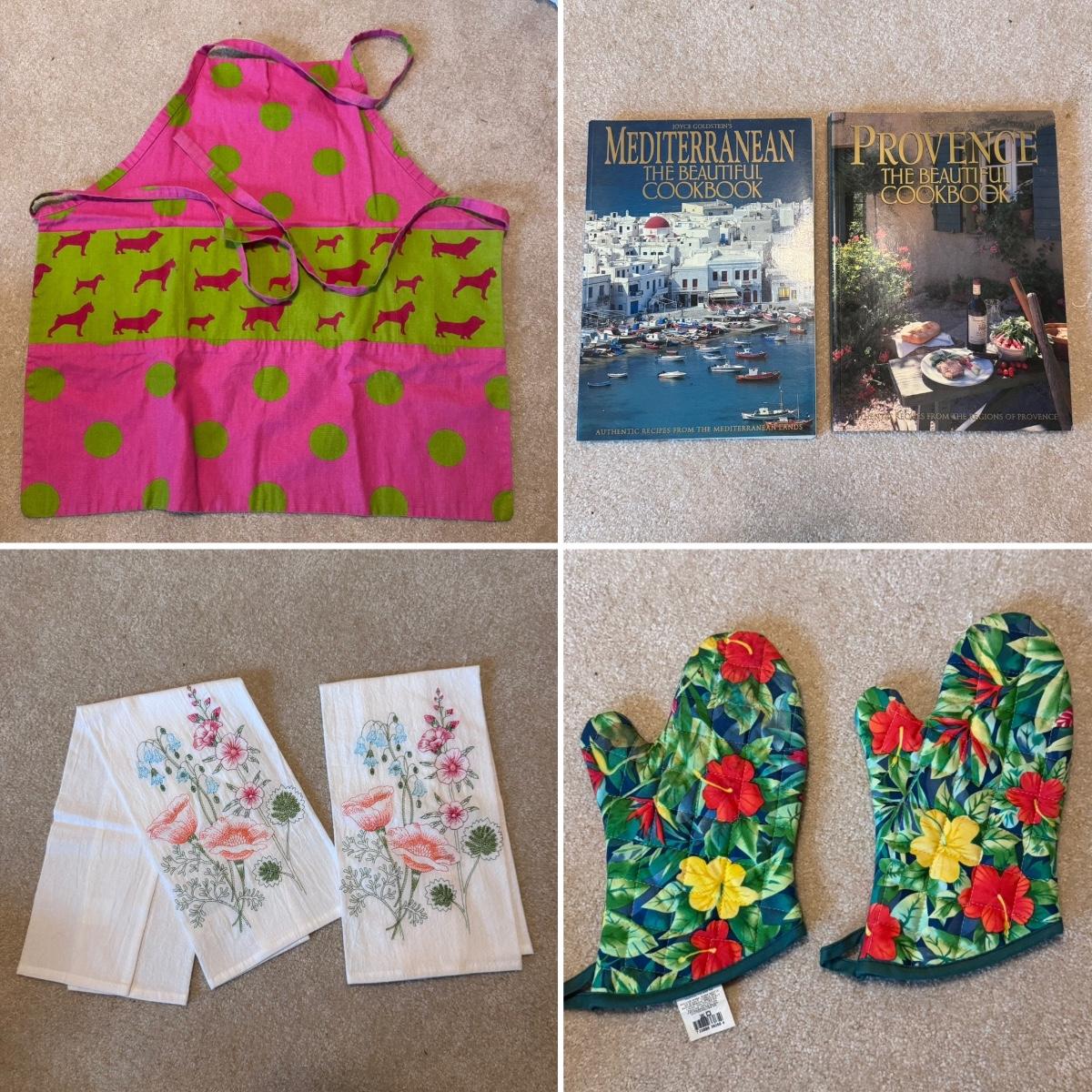 This lot includes sixteen cookbooks from all over the world, over ten magazines on cooking, over fifteen tea towels, and three aprons. See photos for details. The aprons are a one size fits most. Shipping available.