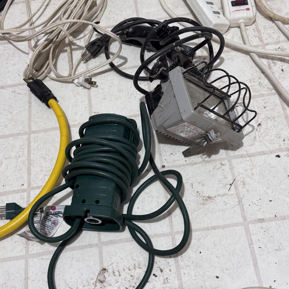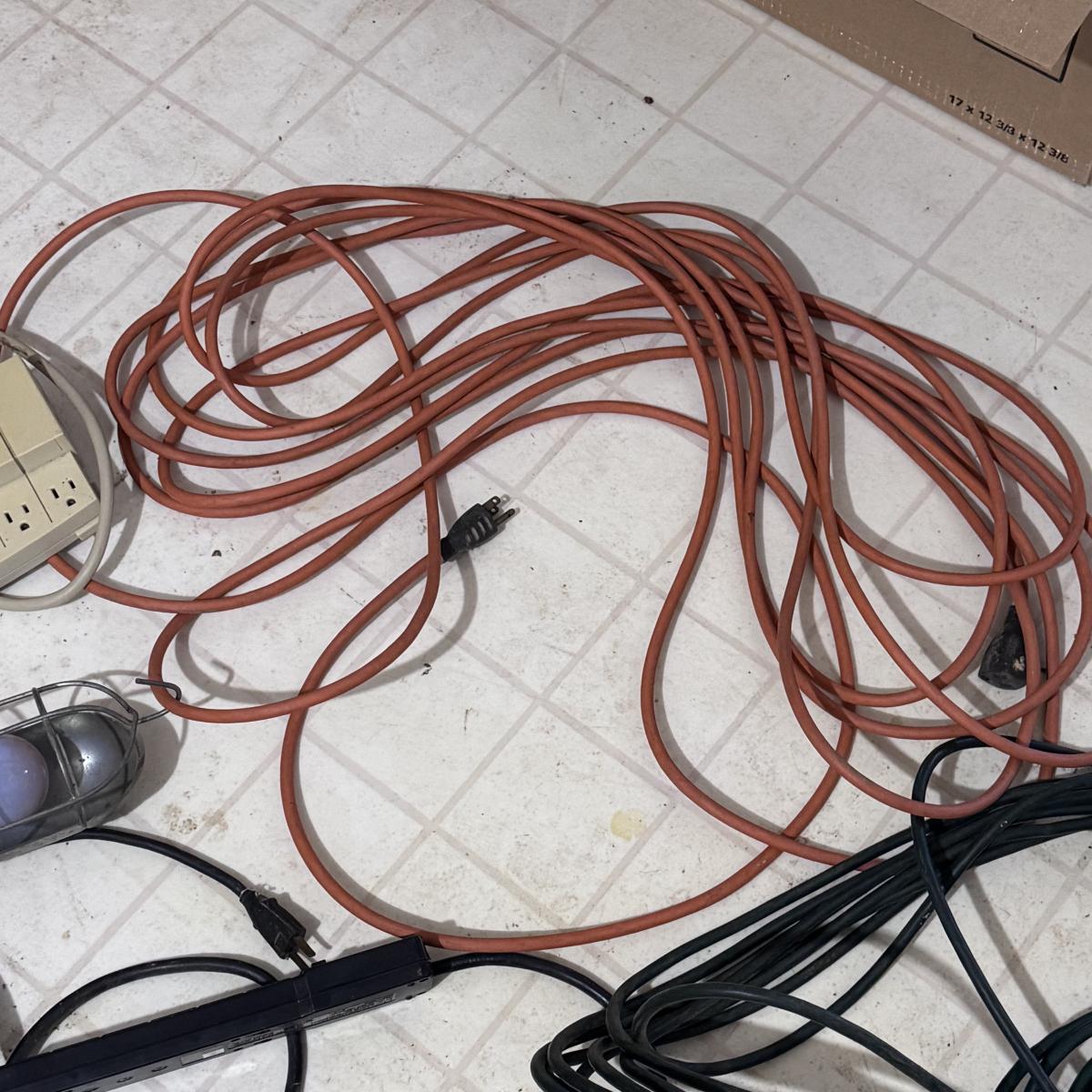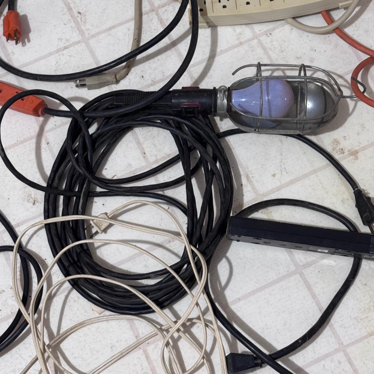 This lot includes over fifteen extension chords of different types and sizes. See pictures for more details. They cords are not tested, although both shop lights power on when plugged in. The largest one is 30ft long. Local pickup only.
