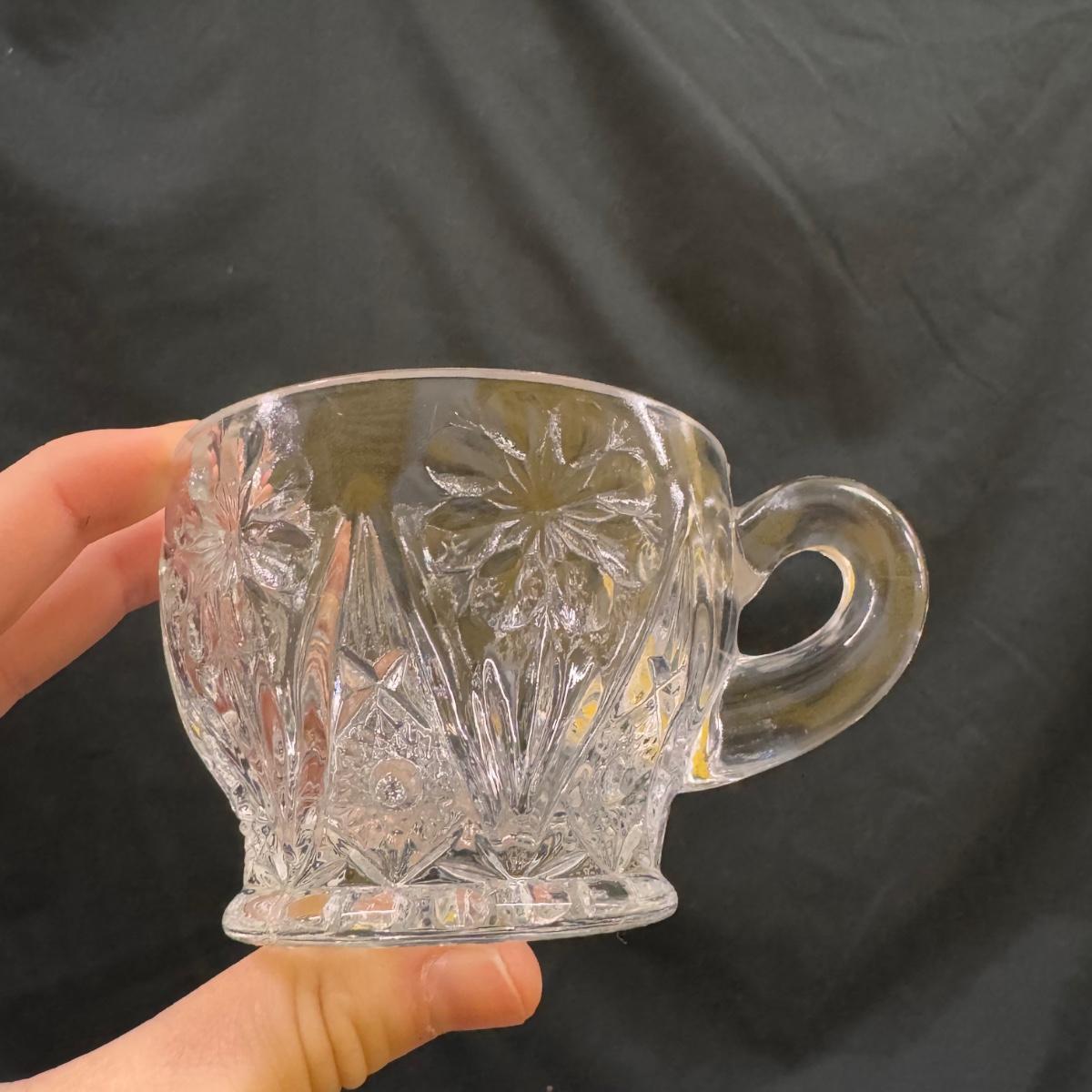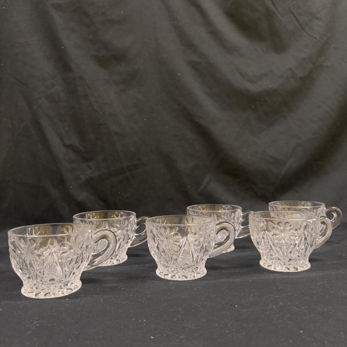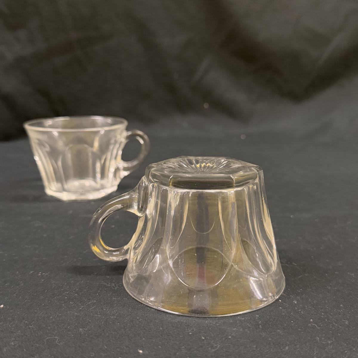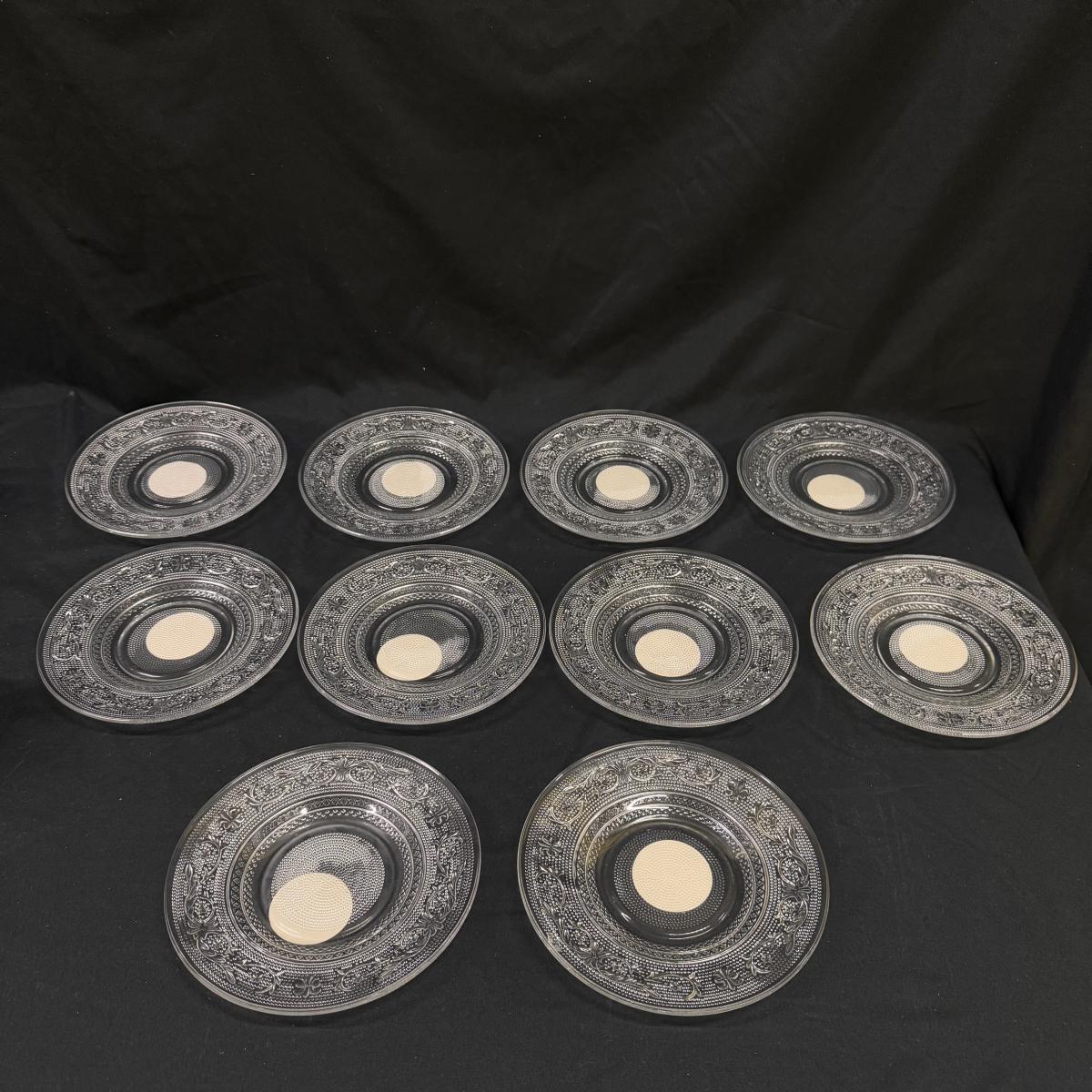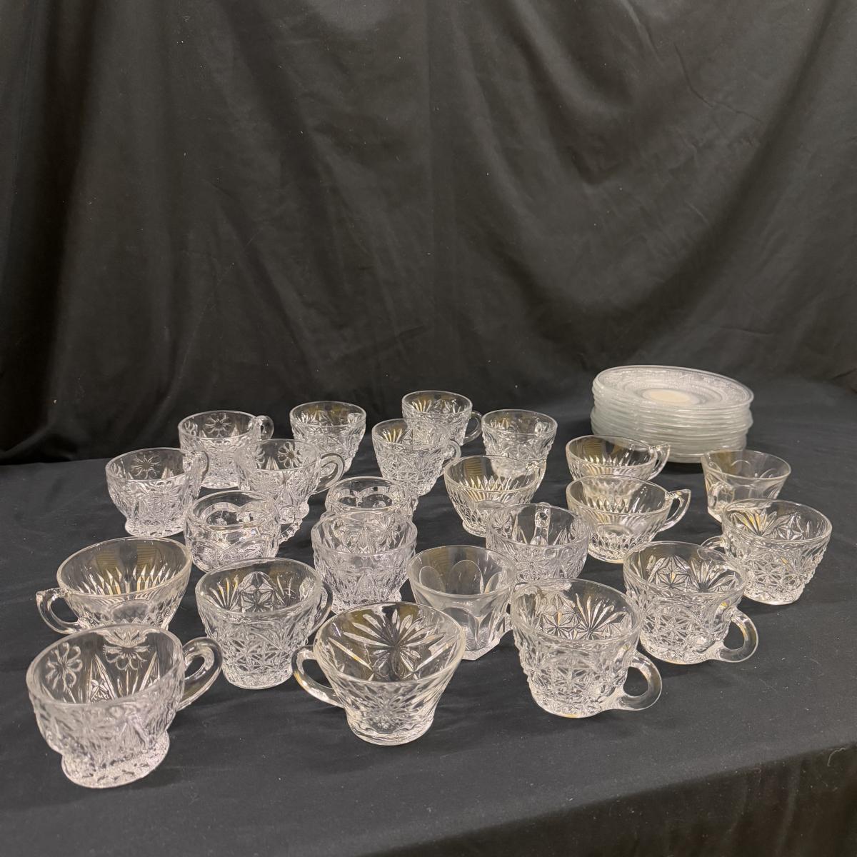 Lot includes 23 variations of glass tea cups and ten glass plates that could be used as saucers or appetizer plates. The plates measure 7”D x .95”H. Shipping available.