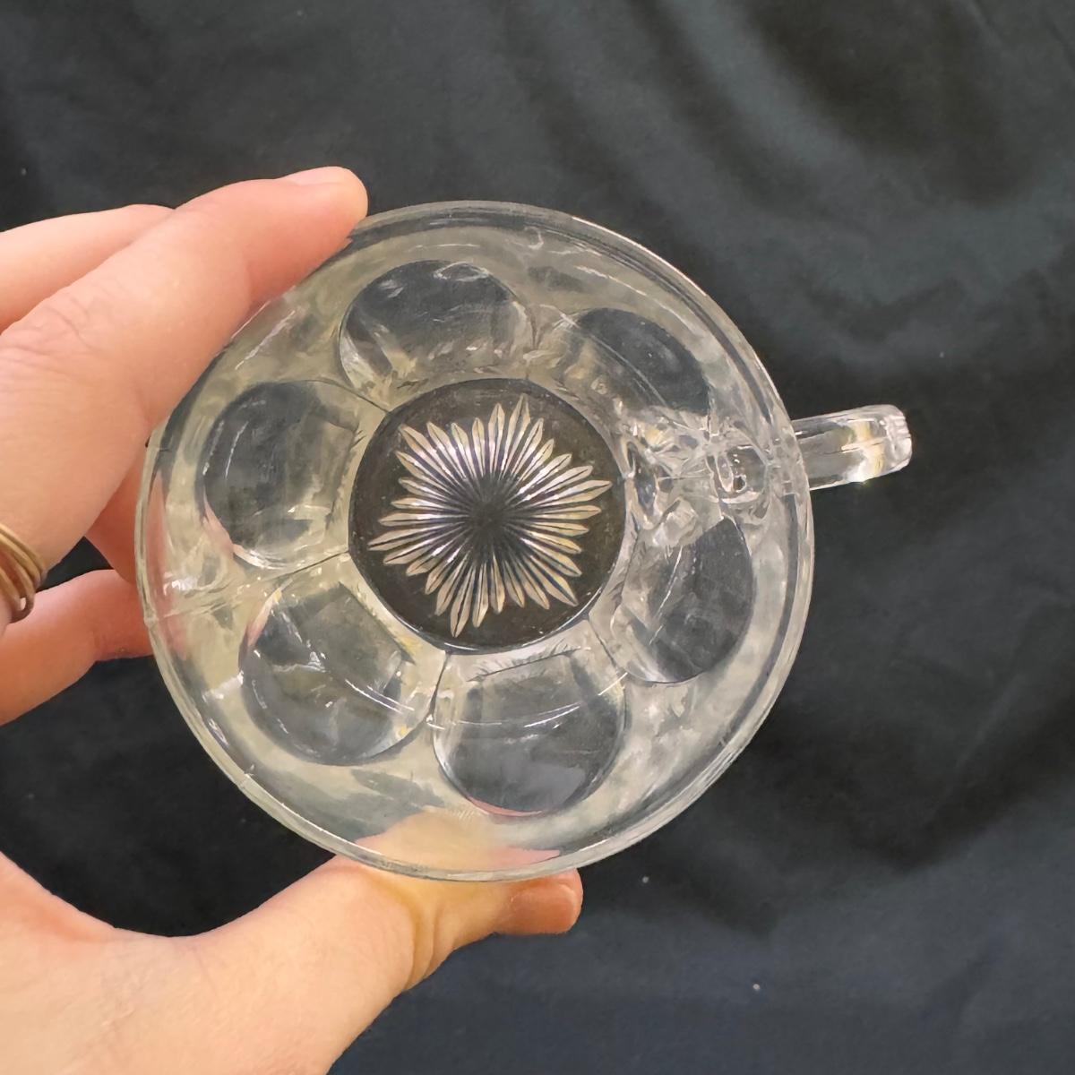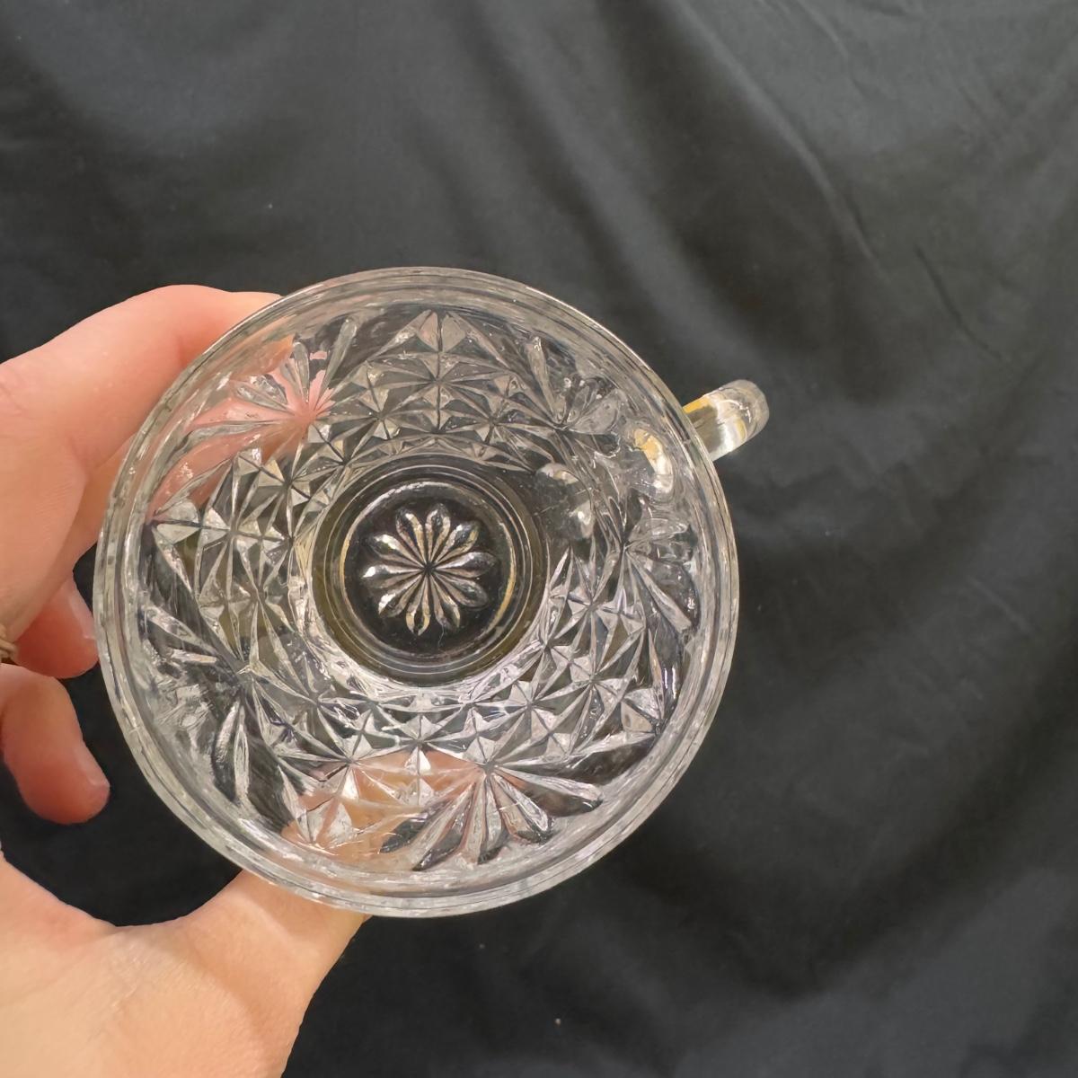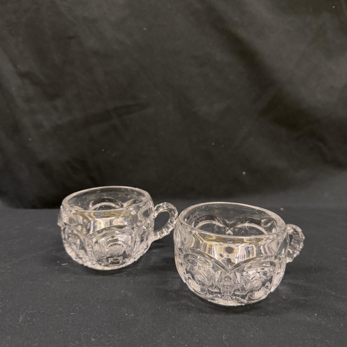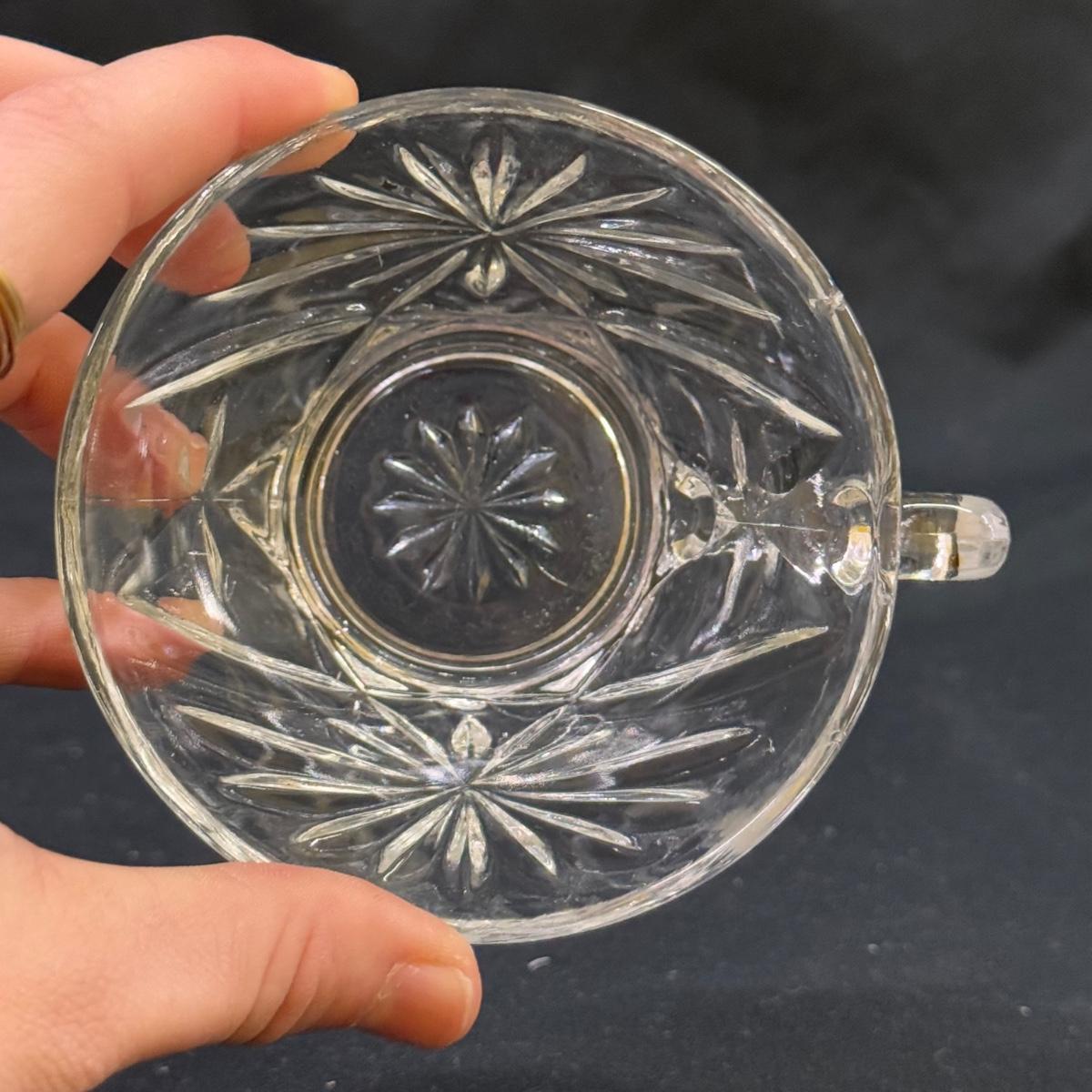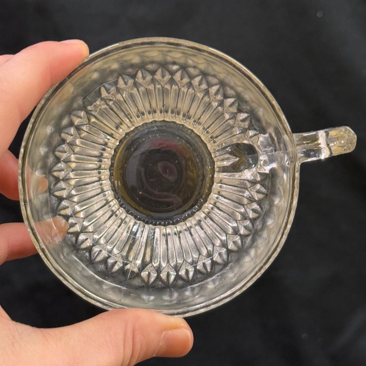 Lot includes 23 variations of glass tea cups and ten glass plates that could be used as saucers or appetizer plates. The plates measure 7”D x .95”H. Shipping available.