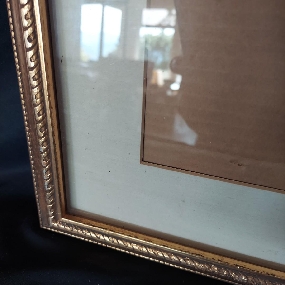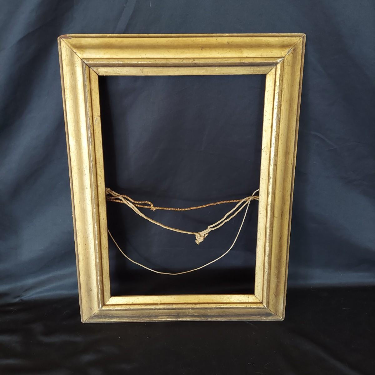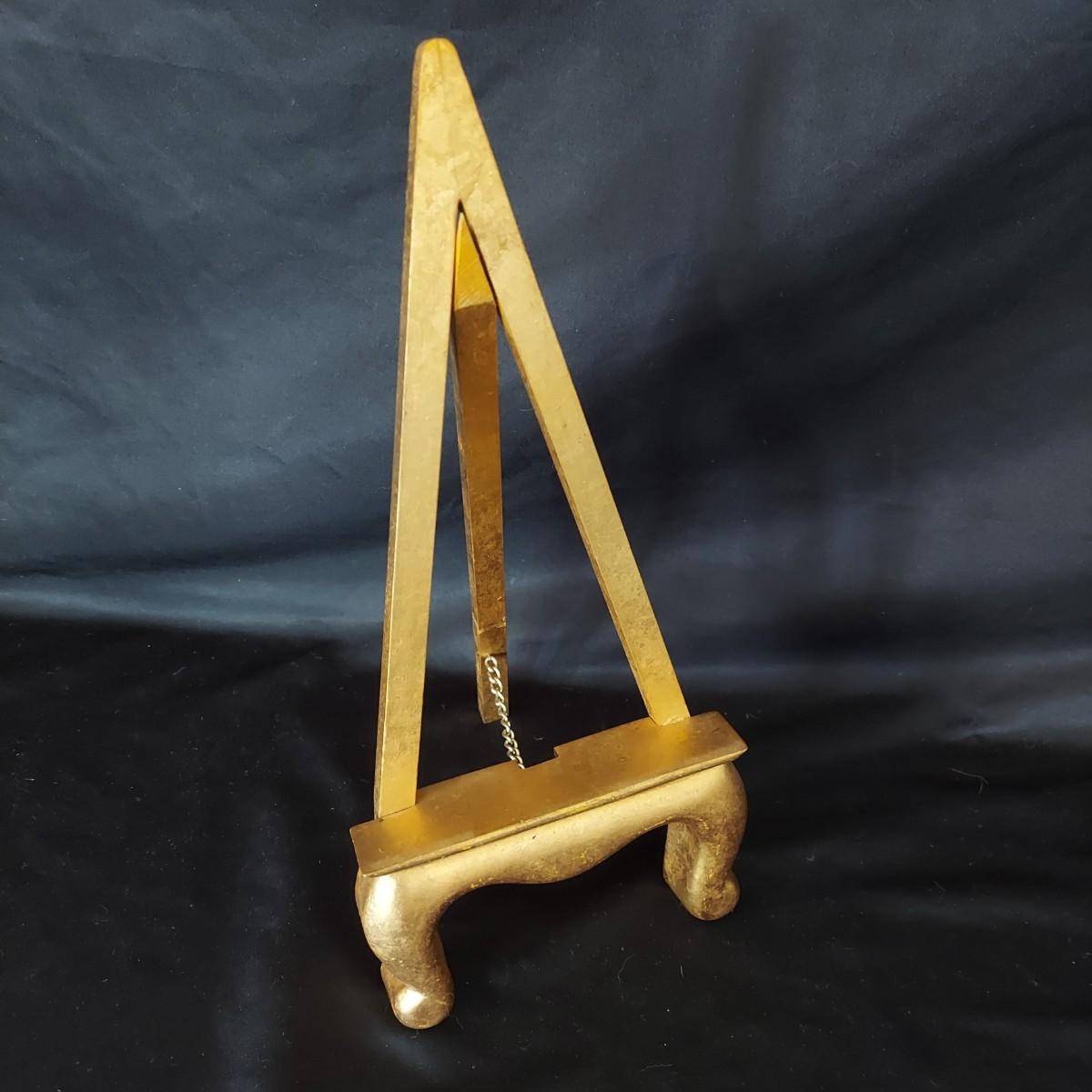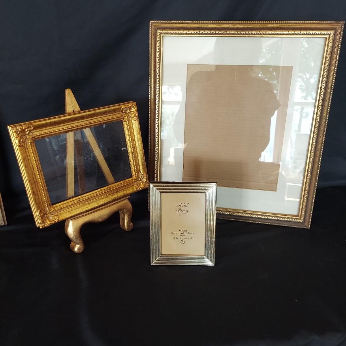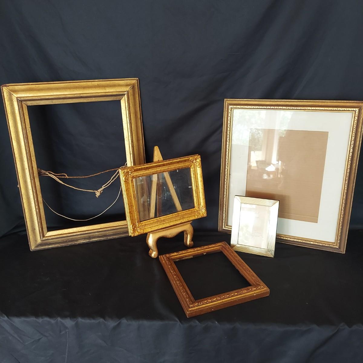 Lot includes five gold frames and a display easel. Four appear to be wooden and one is metal. Three have glass, two do not. The large frame with glass measures 14” x 16"H. Please see photos. Shipping available