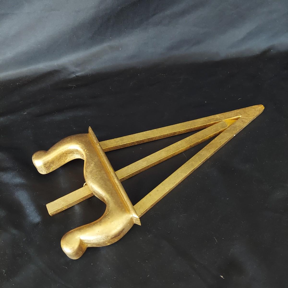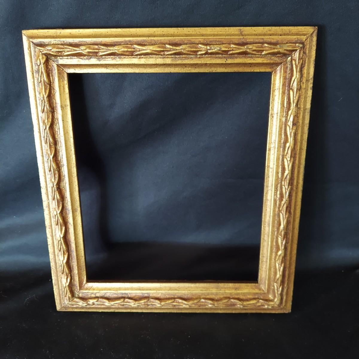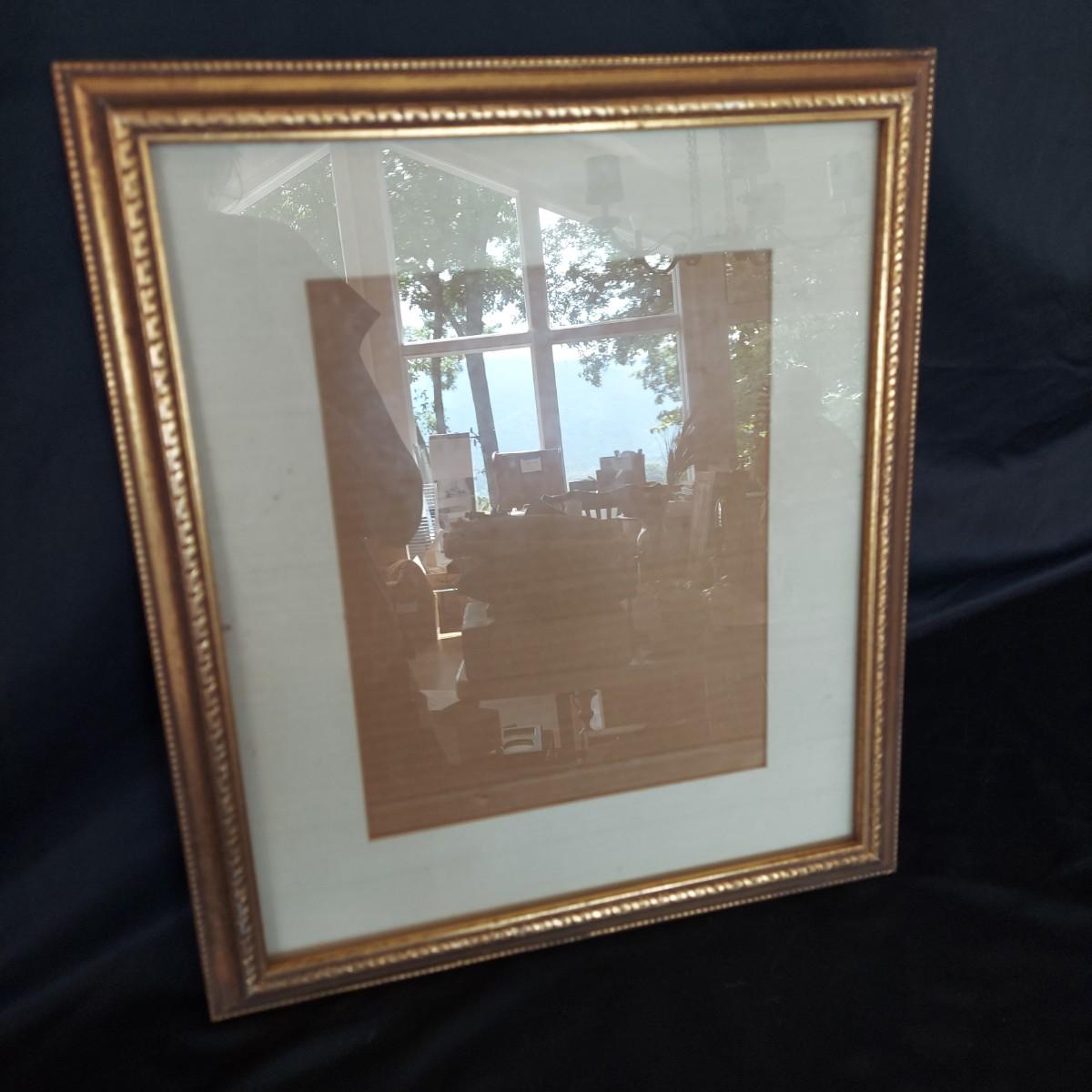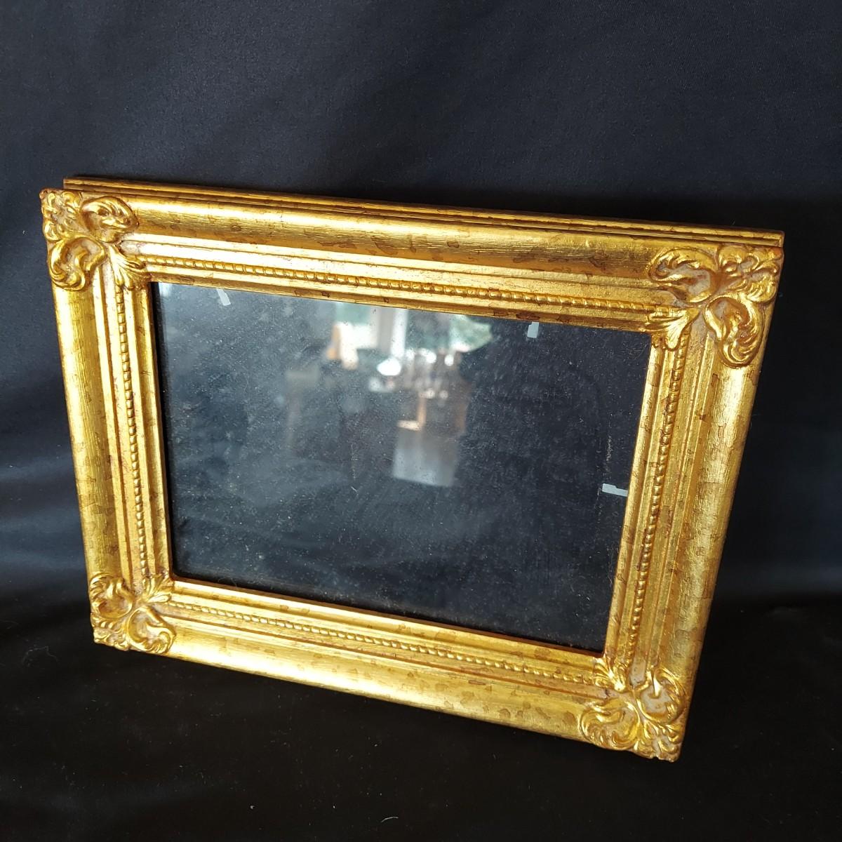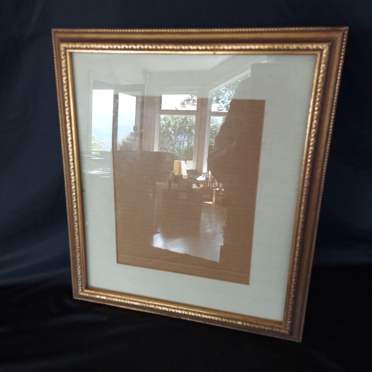 Lot includes five gold frames and a display easel. Four appear to be wooden and one is metal. Three have glass, two do not. The large frame with glass measures 14” x 16"H. Please see photos. Shipping available