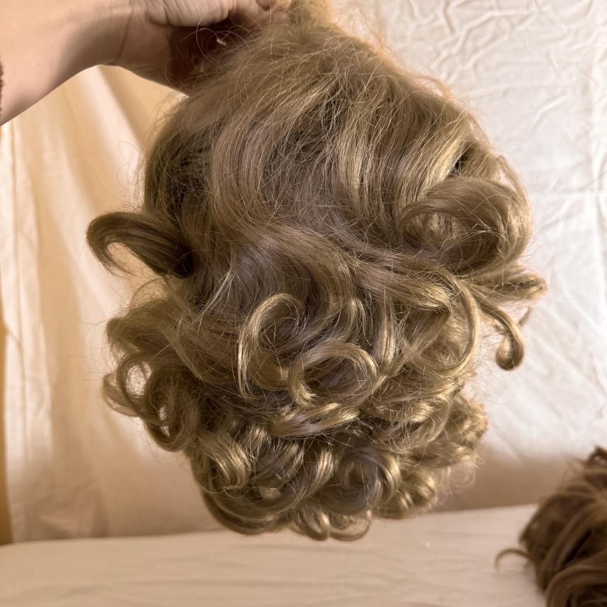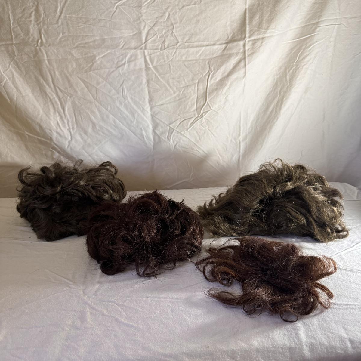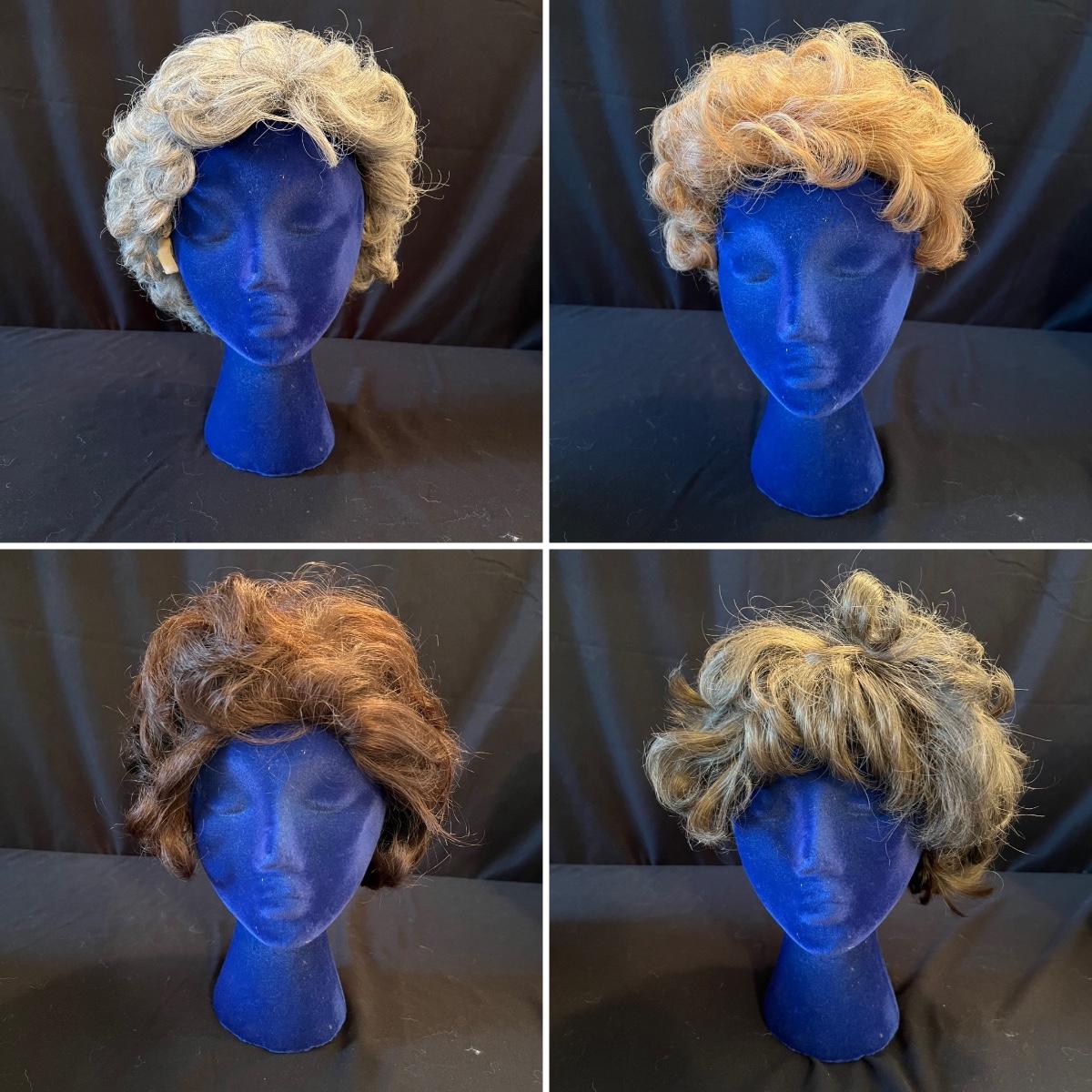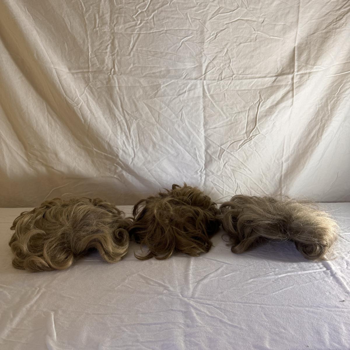 Lot includes four grey/silver wigs and nine wigs in various shades of brown and blonde. There is one small hair piece with a clip that has a label that says '100% human hair'. There are no sizes listed on the wigs. Shipping available.