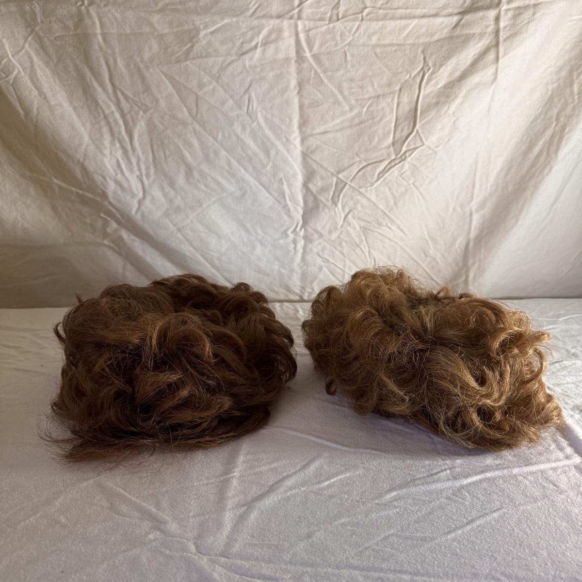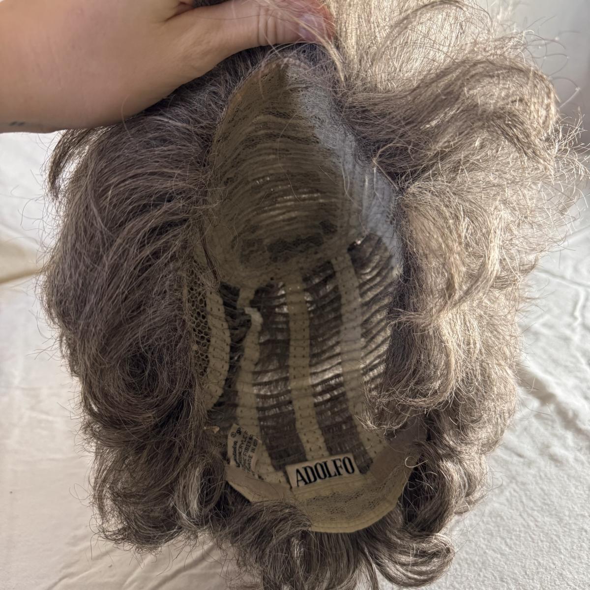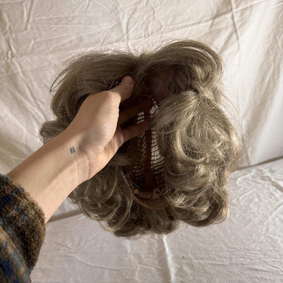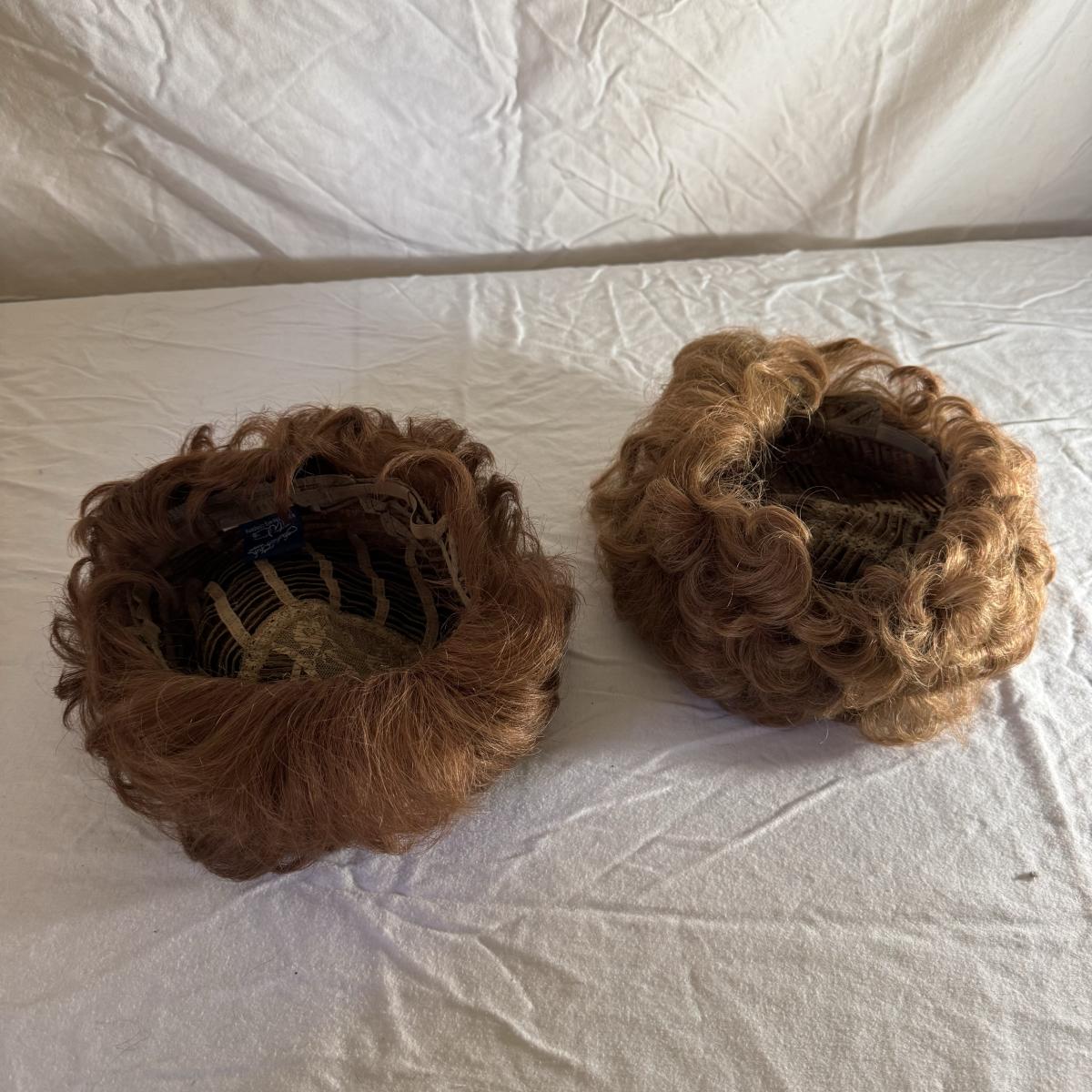 Lot includes four grey/silver wigs and nine wigs in various shades of brown and blonde. There is one small hair piece with a clip that has a label that says '100% human hair'. There are no sizes listed on the wigs. Shipping available.