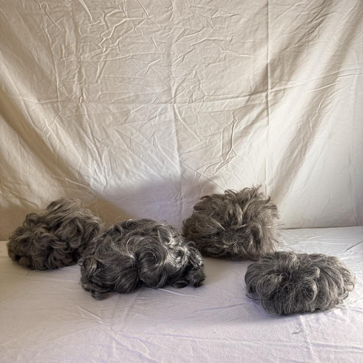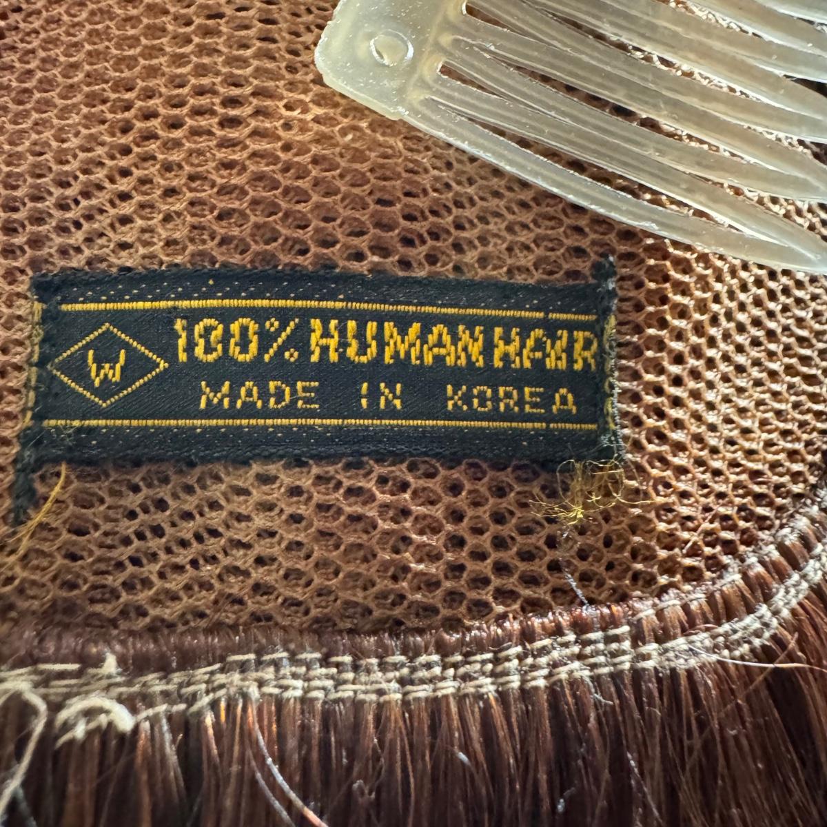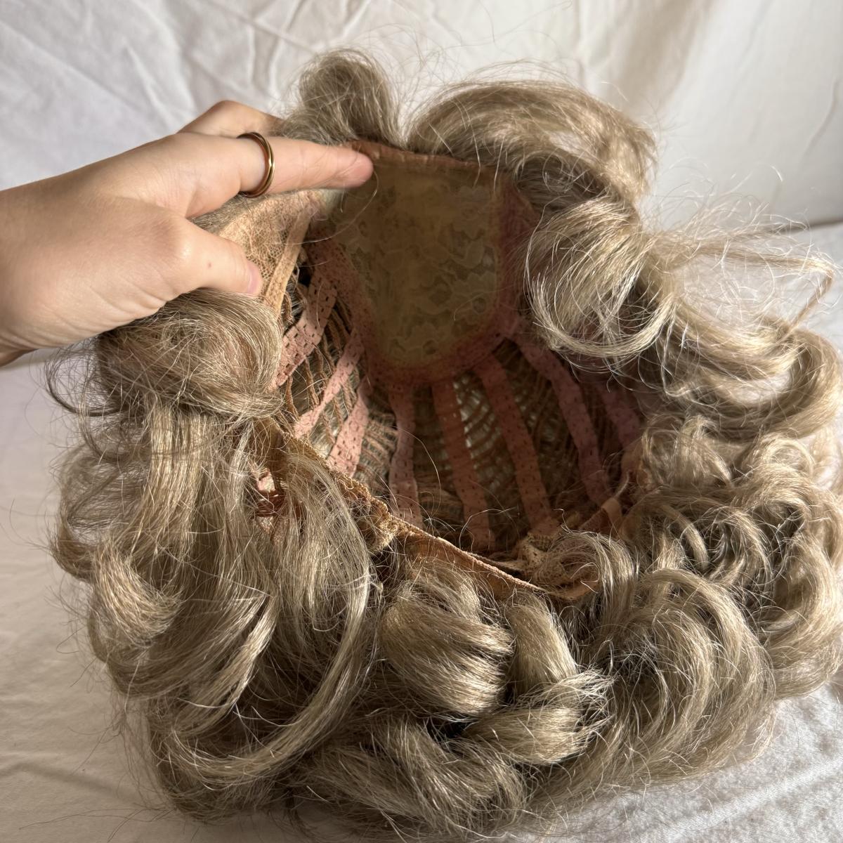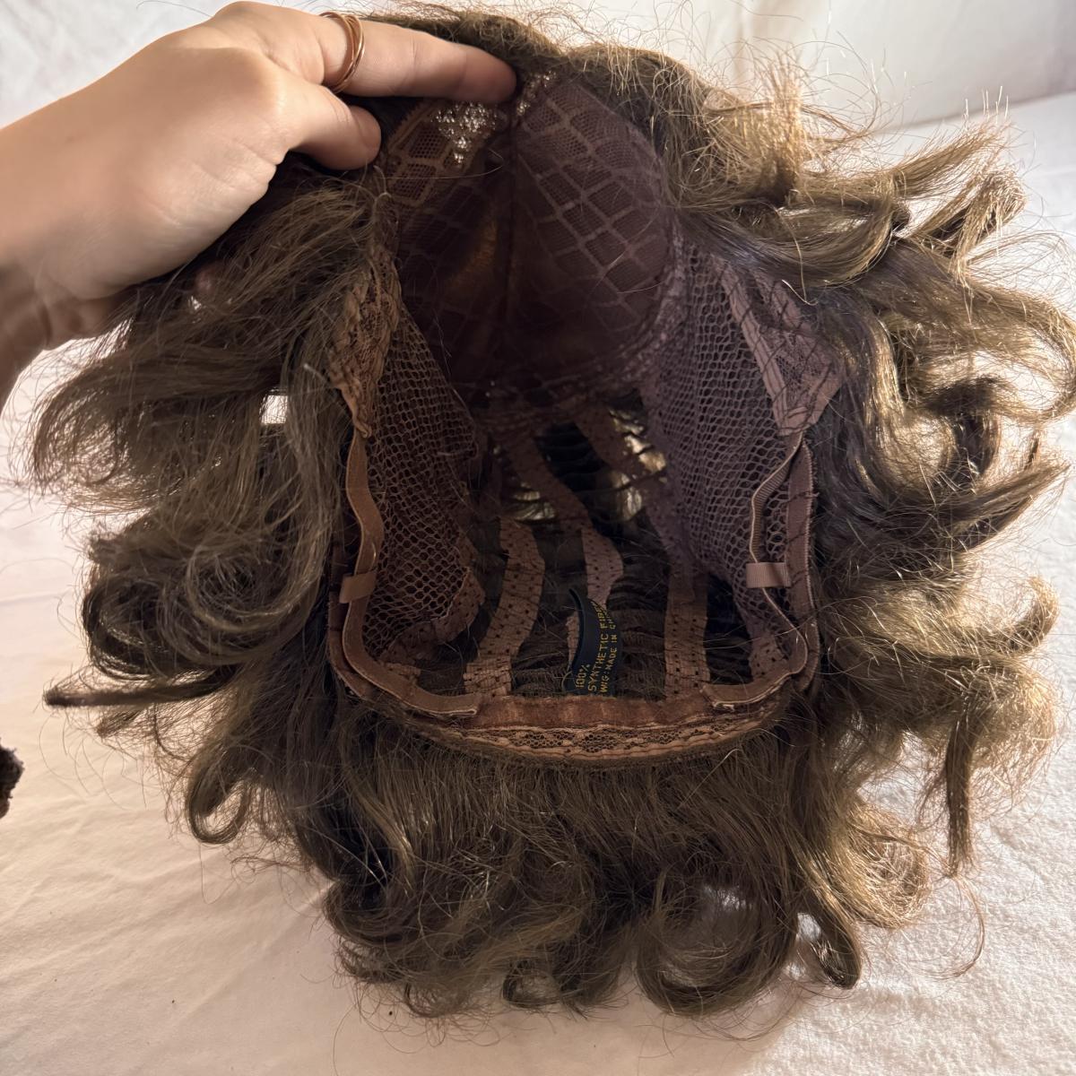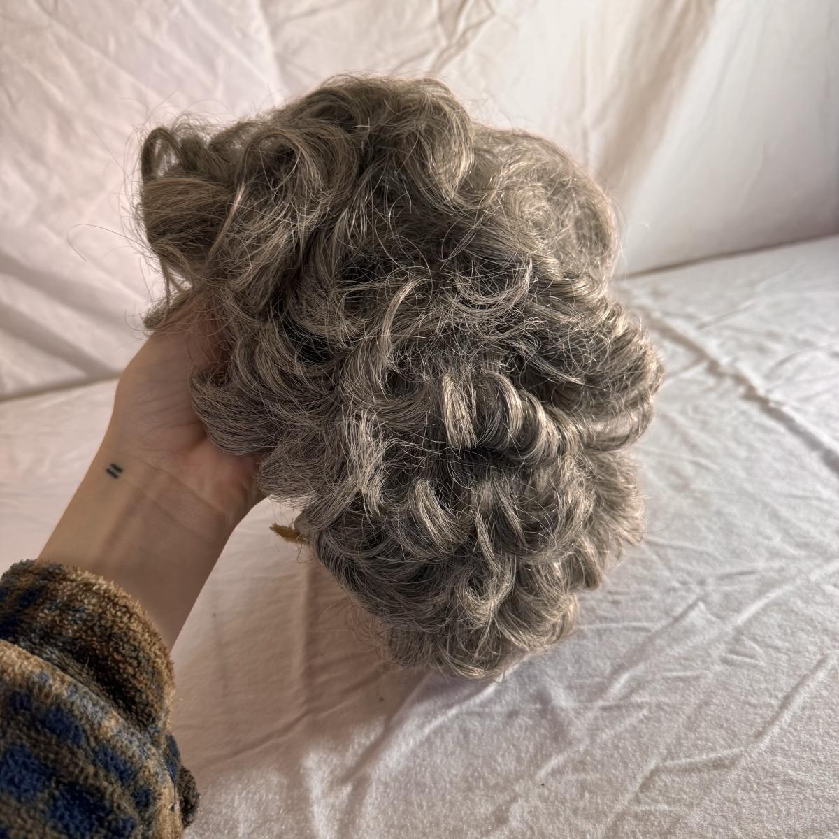 Lot includes four grey/silver wigs and nine wigs in various shades of brown and blonde. There is one small hair piece with a clip that has a label that says '100% human hair'. There are no sizes listed on the wigs. Shipping available.