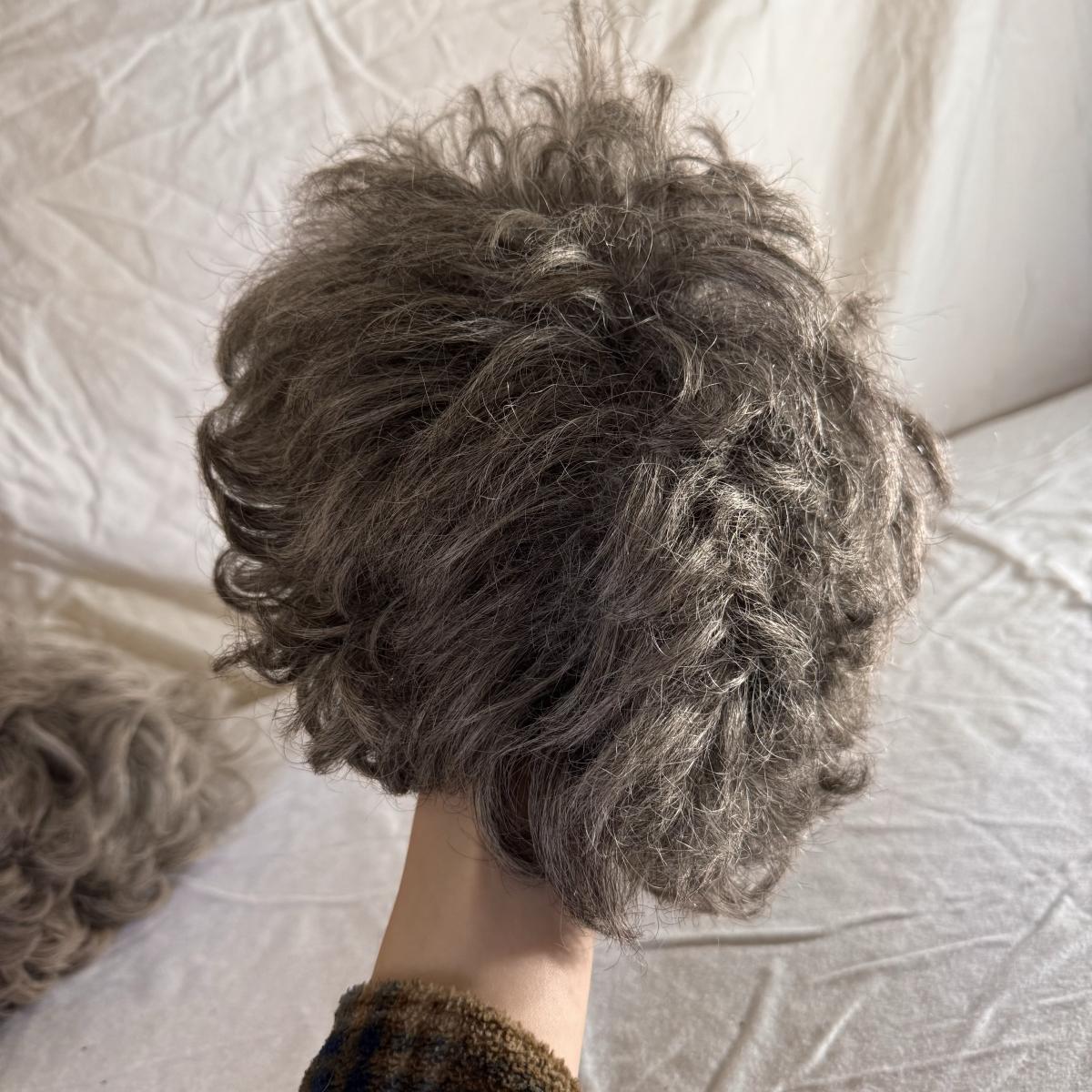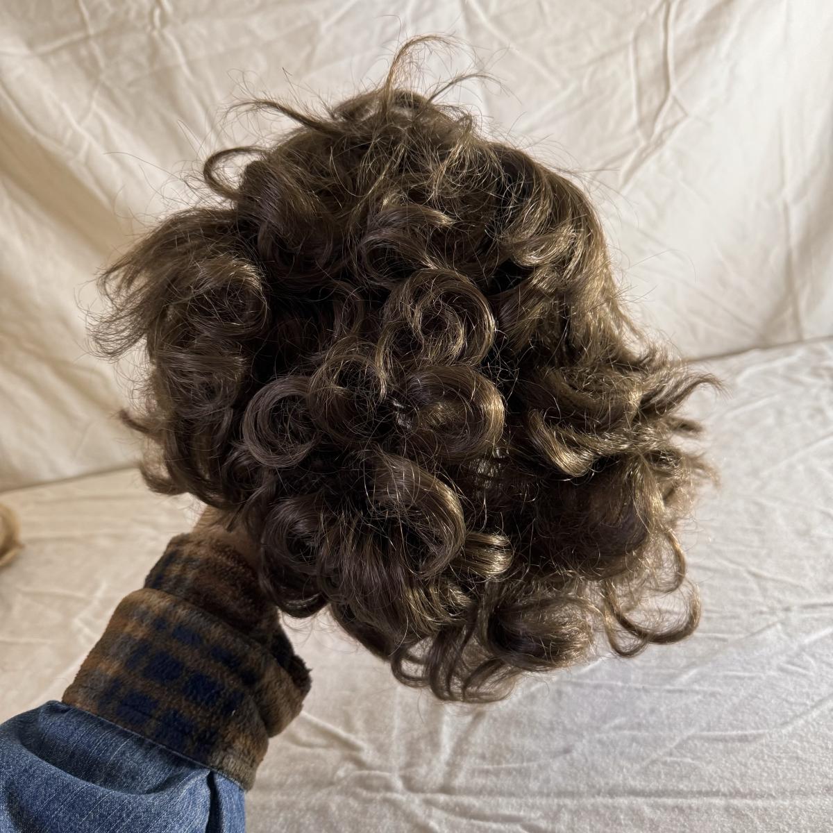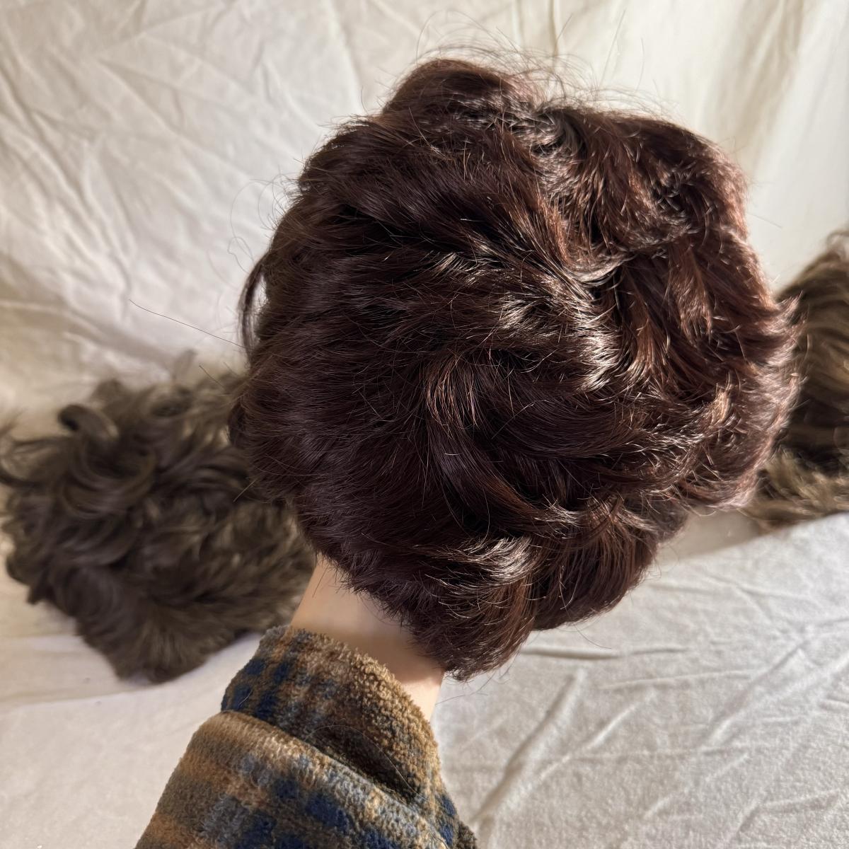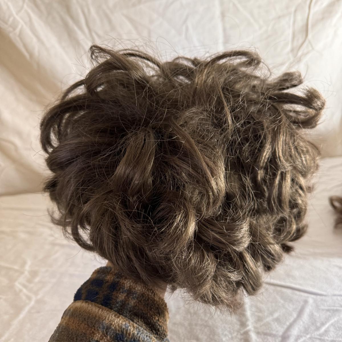 Lot includes four grey/silver wigs and nine wigs in various shades of brown and blonde. There is one small hair piece with a clip that has a label that says '100% human hair'. There are no sizes listed on the wigs. Shipping available.