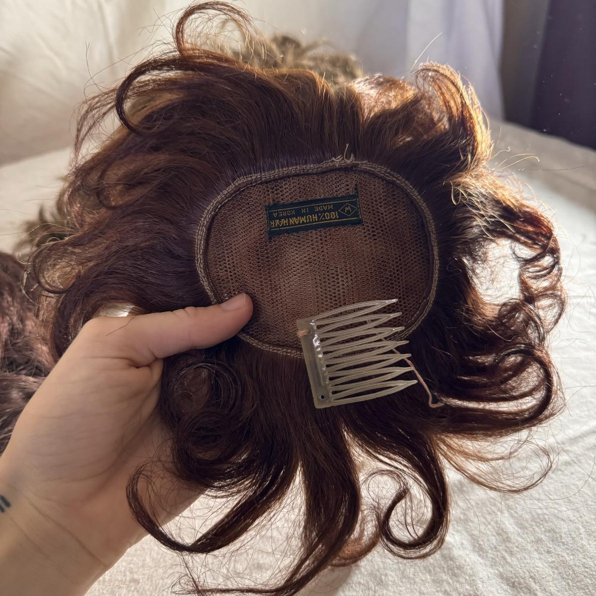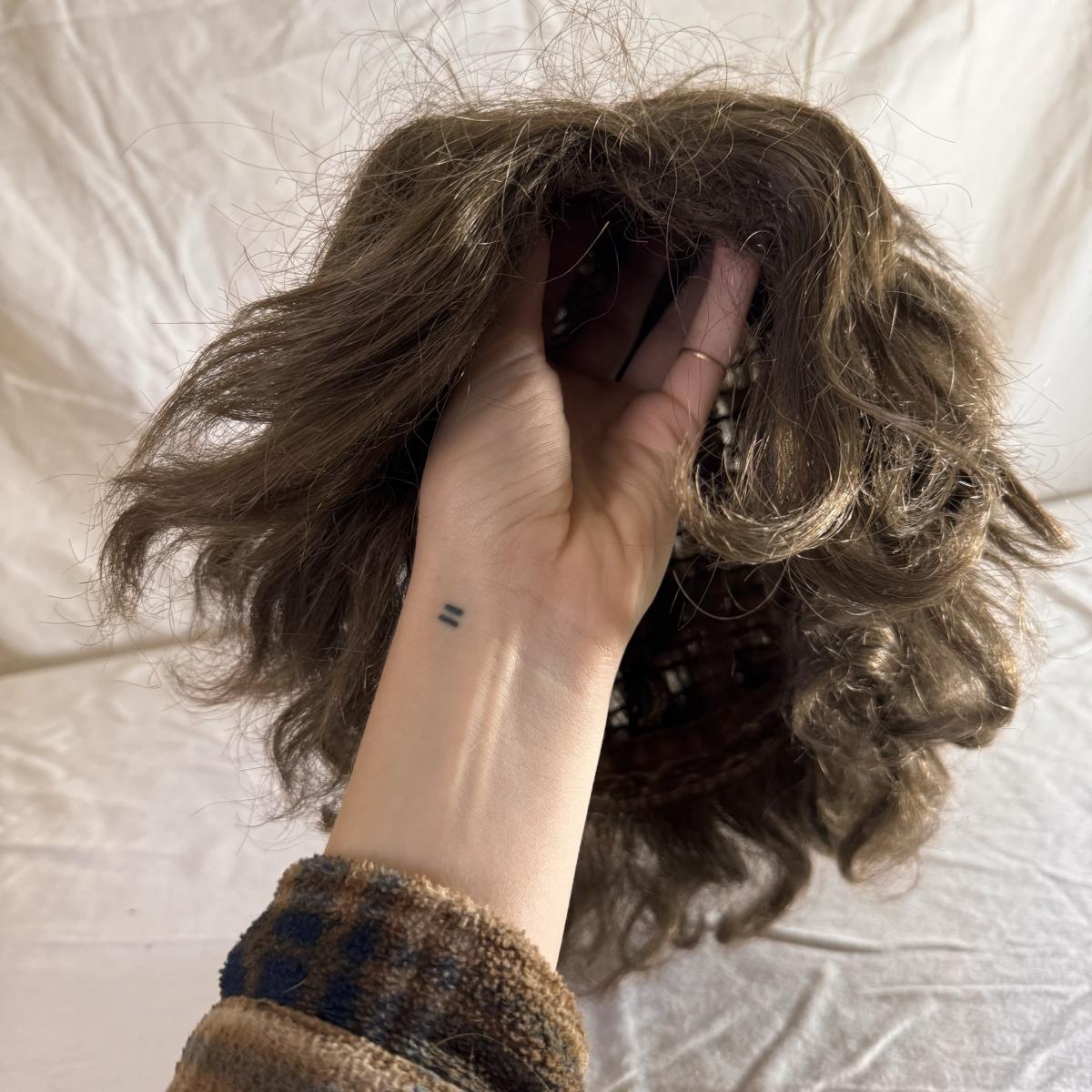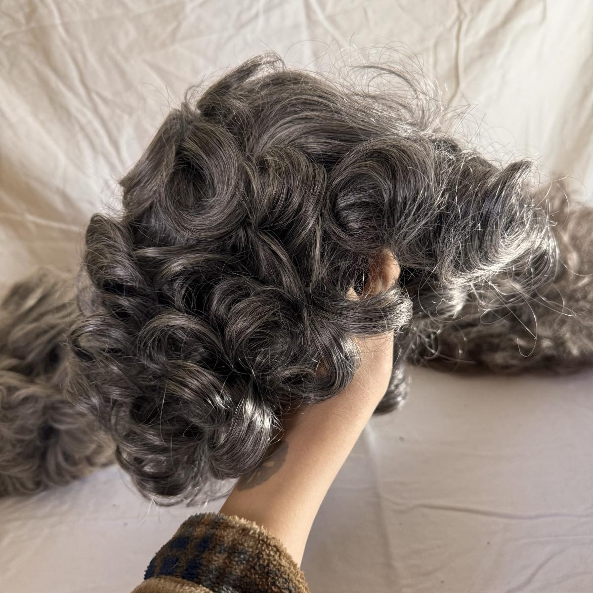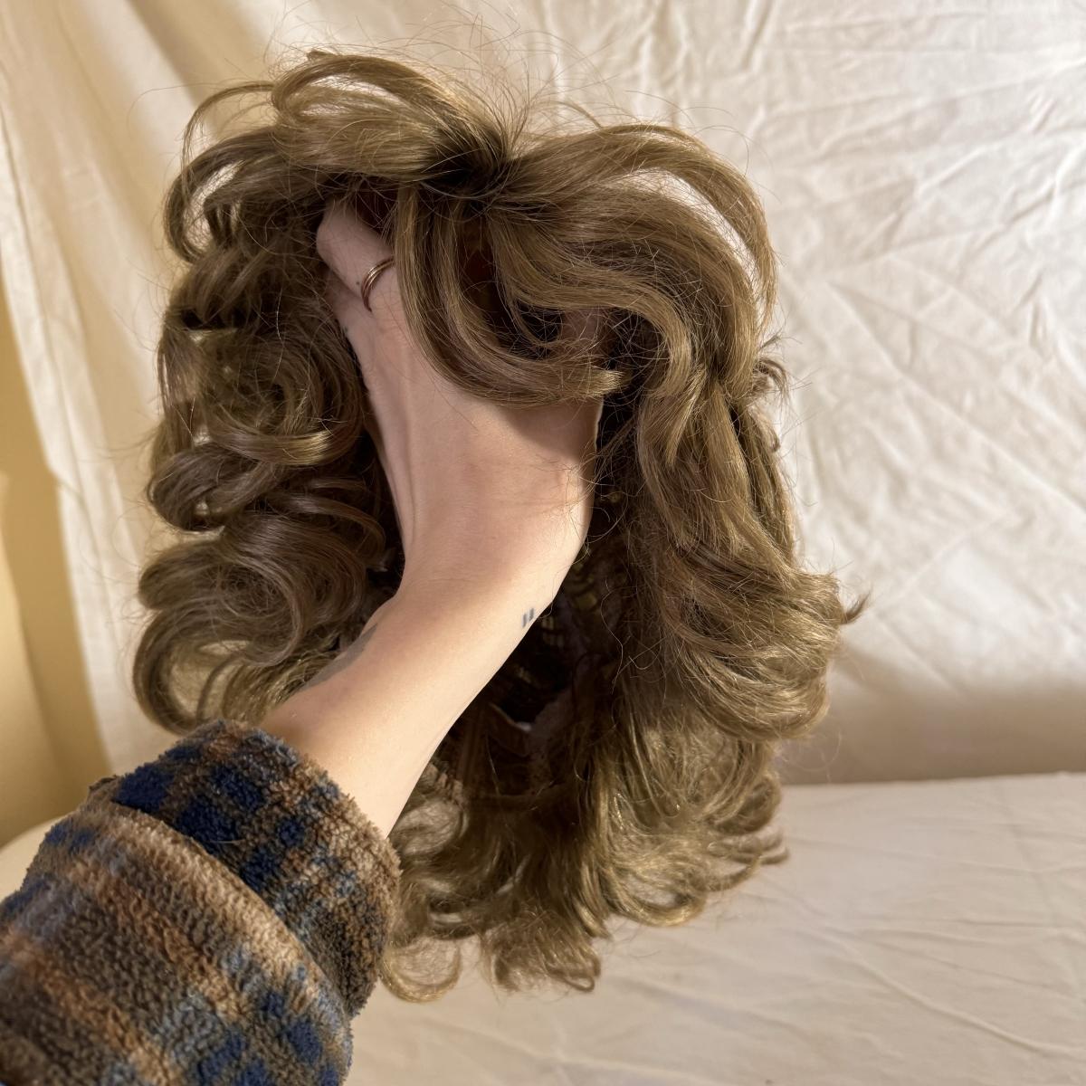 Lot includes four grey/silver wigs and nine wigs in various shades of brown and blonde. There is one small hair piece with a clip that has a label that says '100% human hair'. There are no sizes listed on the wigs. Shipping available.