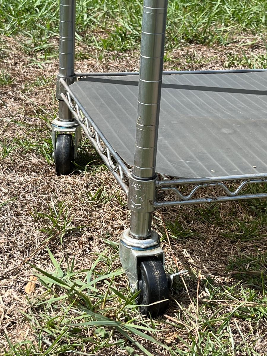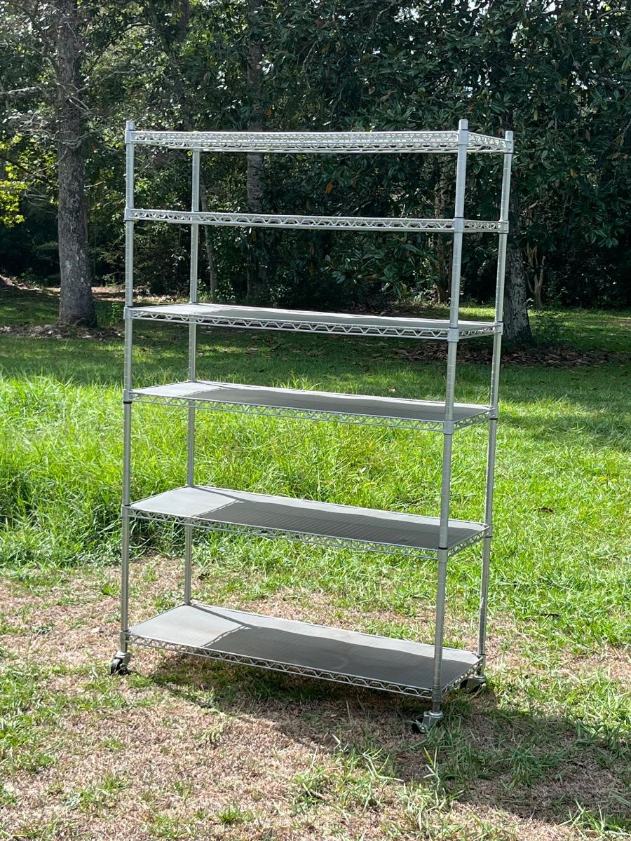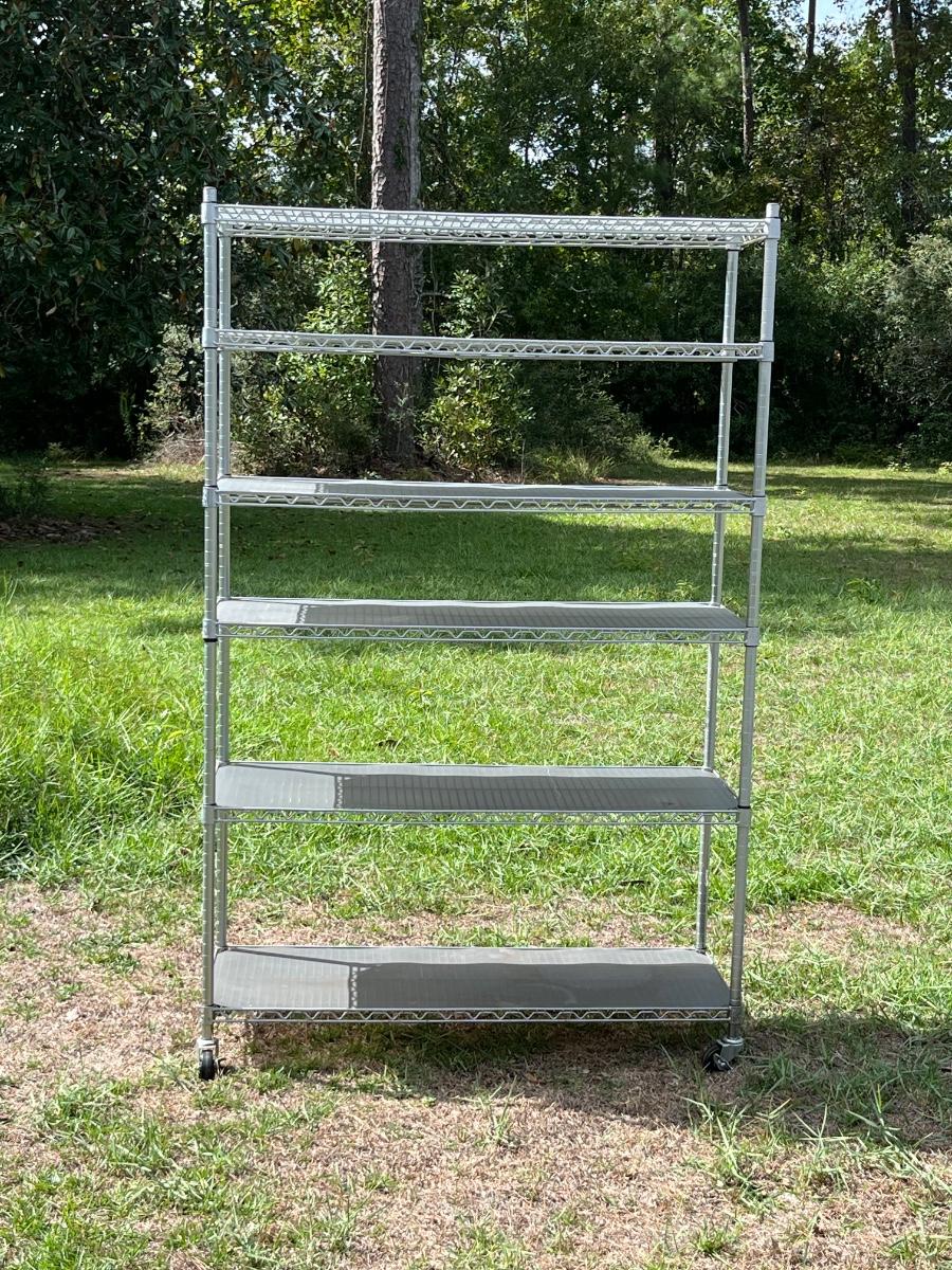 Includes locking casters ~ Six height adjustable shelves with polypropylene shelf inlays ~ 75” H x 48” W x 18” D ~ Garage kept, we just took it outside for photos