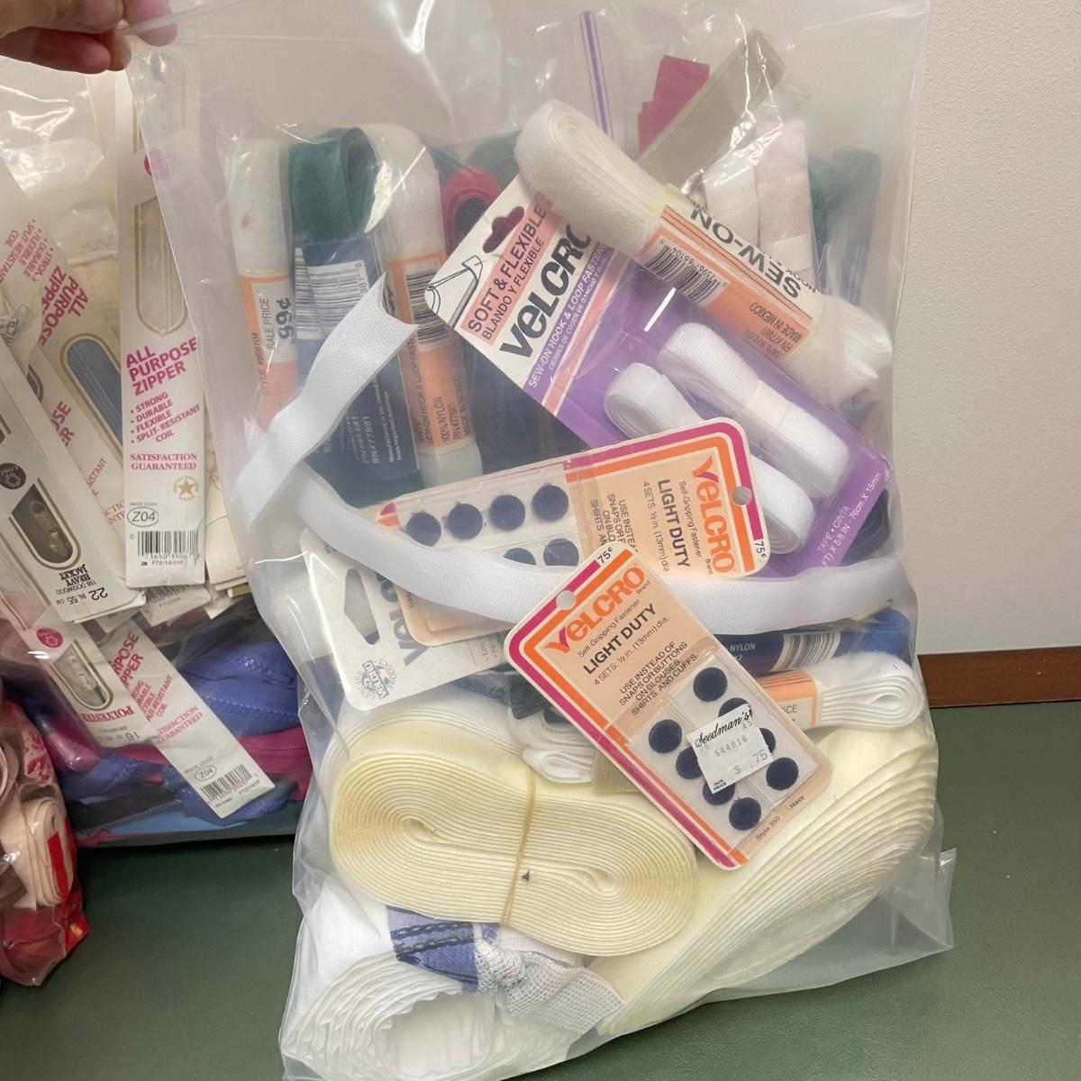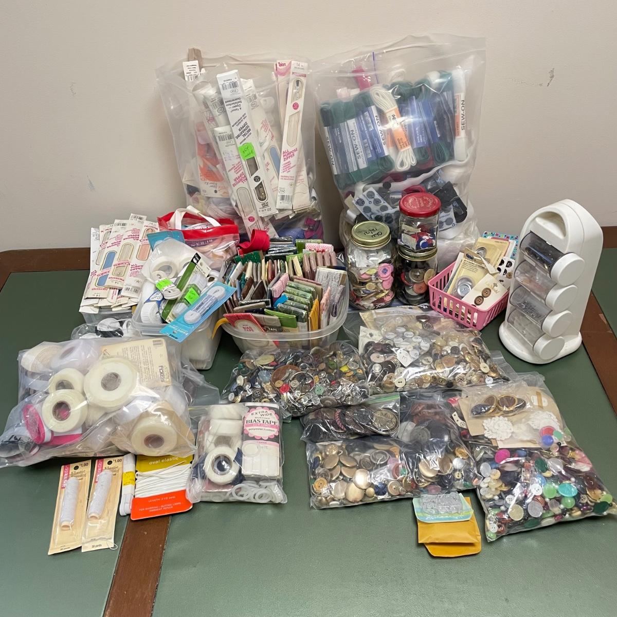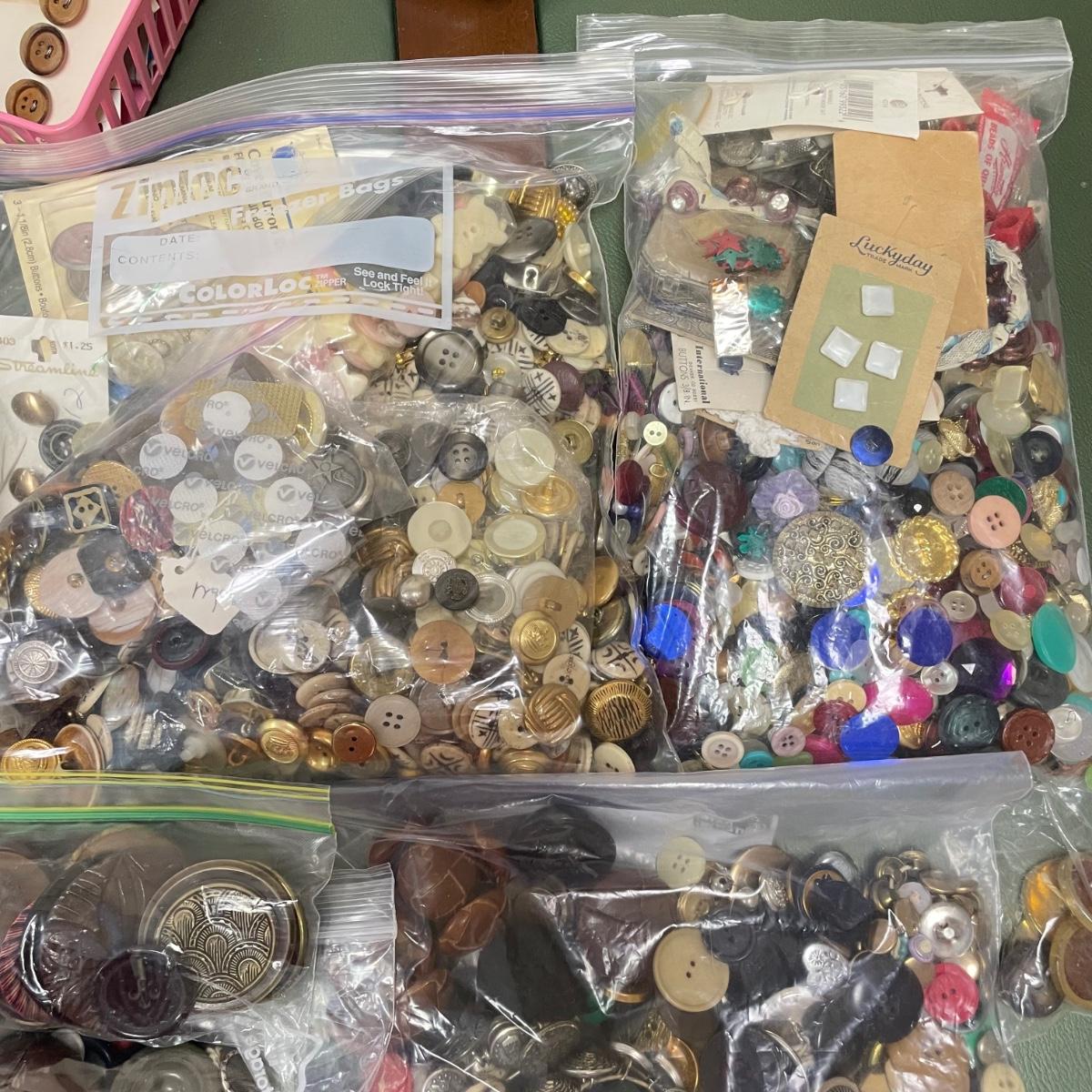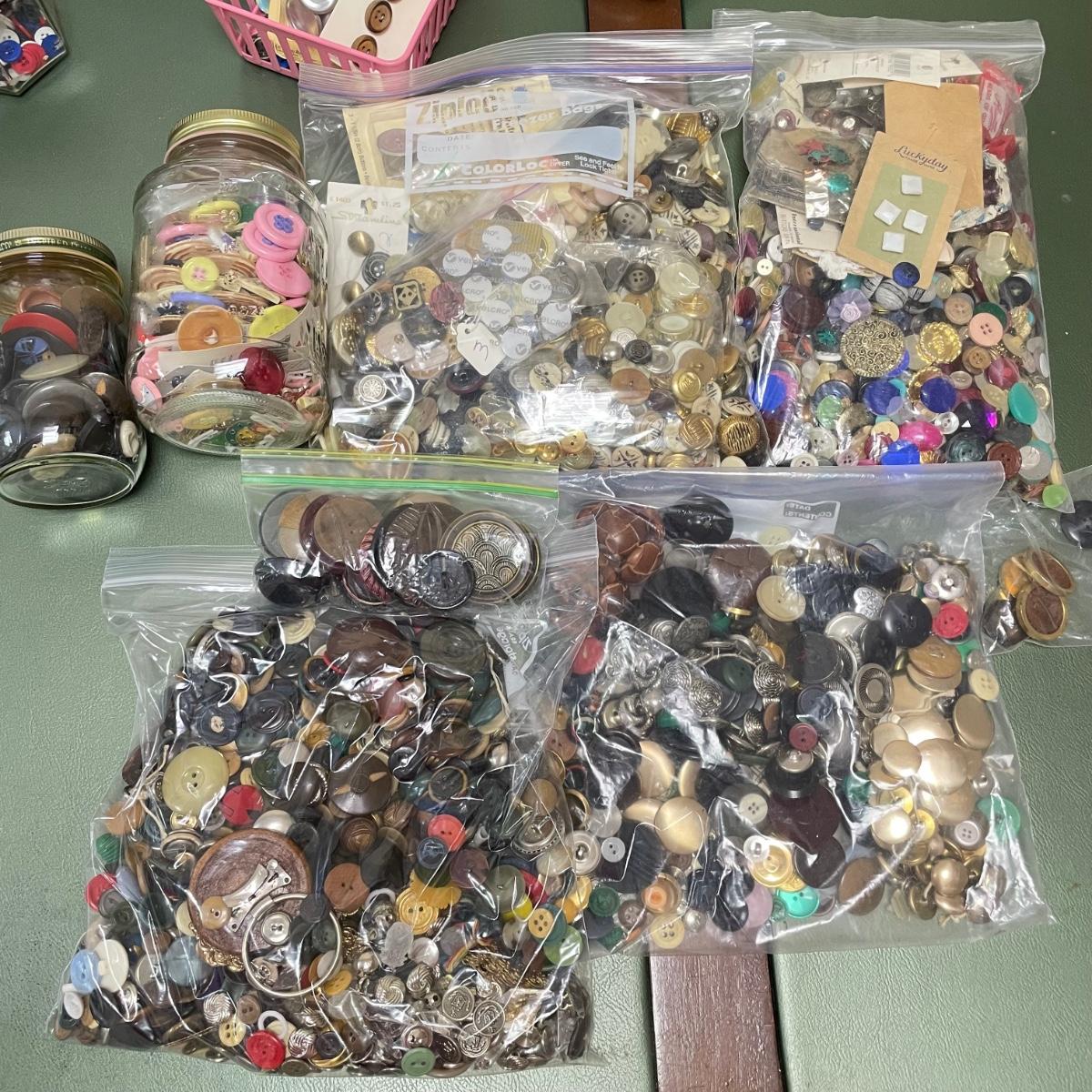 Huge selection of buttons, zippers, Velcro, ribbons, fasteners and more! Lot contains a plastic turntable caddy with eight plastic jars. Tall ziplock bags with Velcro and zippers are two-gallon sized bags. See images. Shipping available.