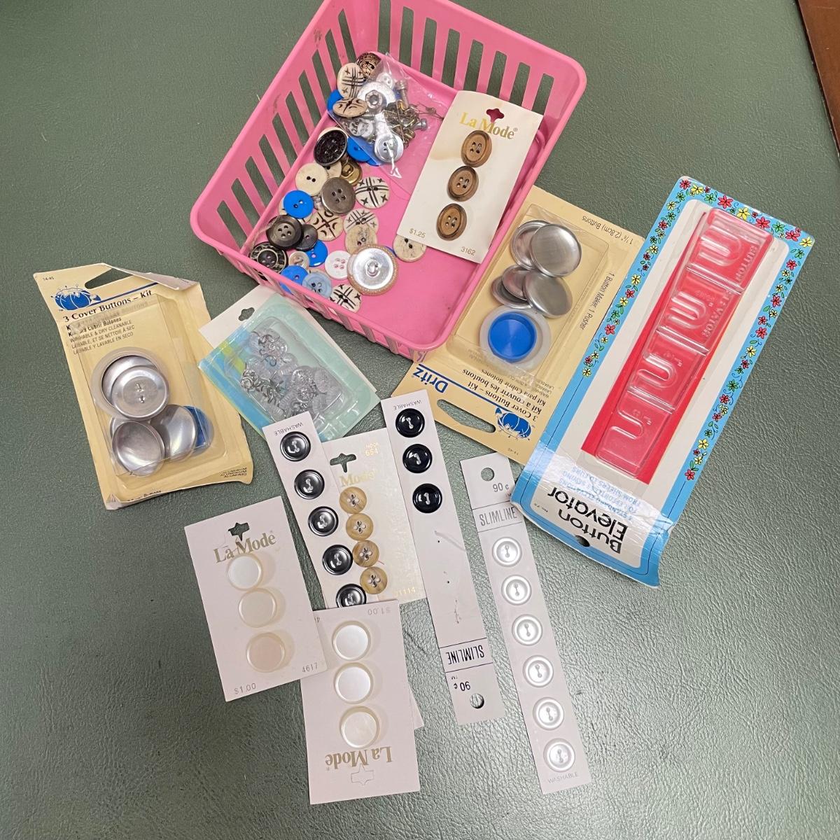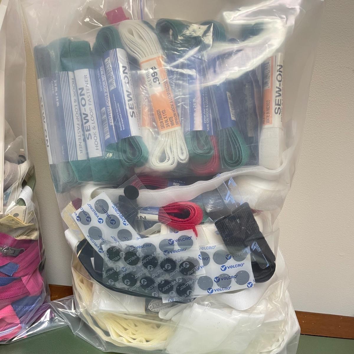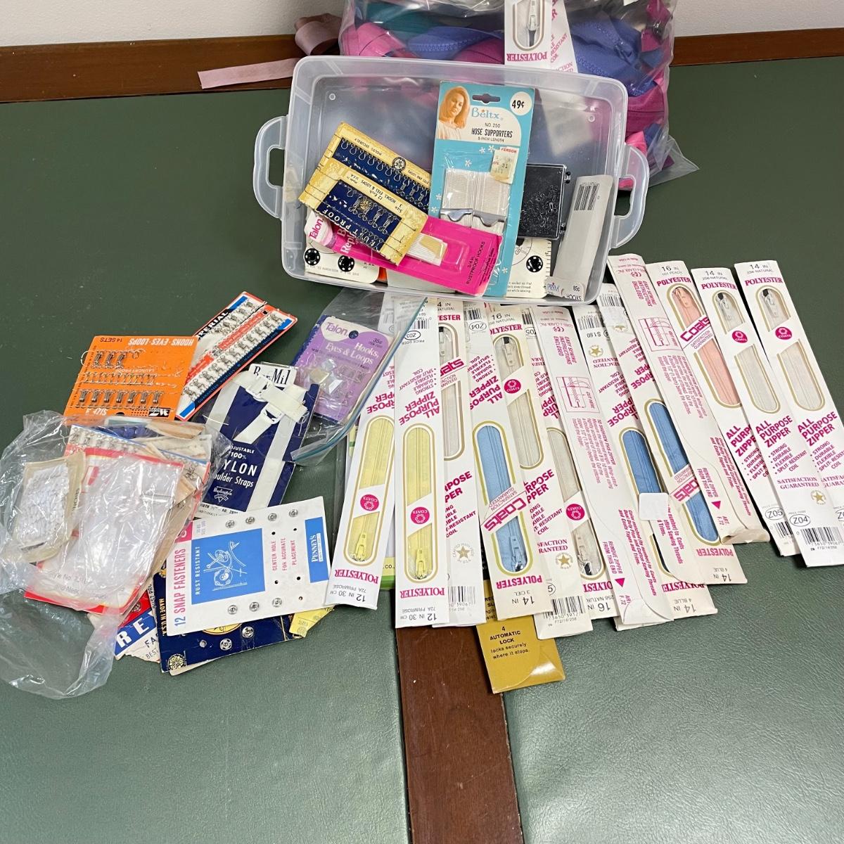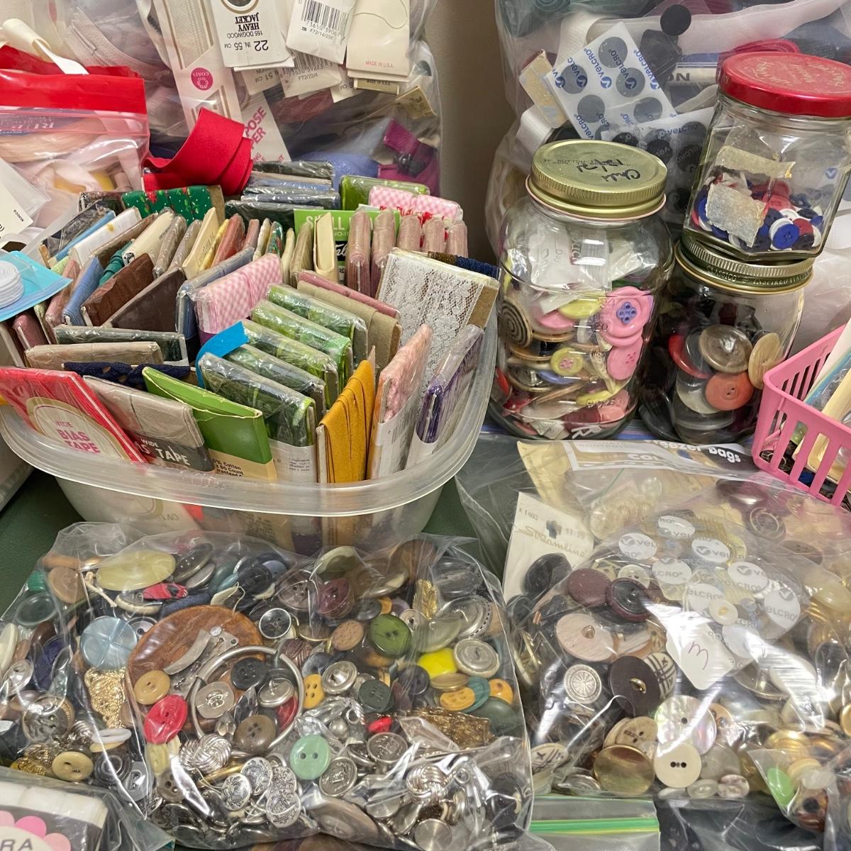 Huge selection of buttons, zippers, Velcro, ribbons, fasteners and more! Lot contains a plastic turntable caddy with eight plastic jars. Tall ziplock bags with Velcro and zippers are two-gallon sized bags. See images. Shipping available.