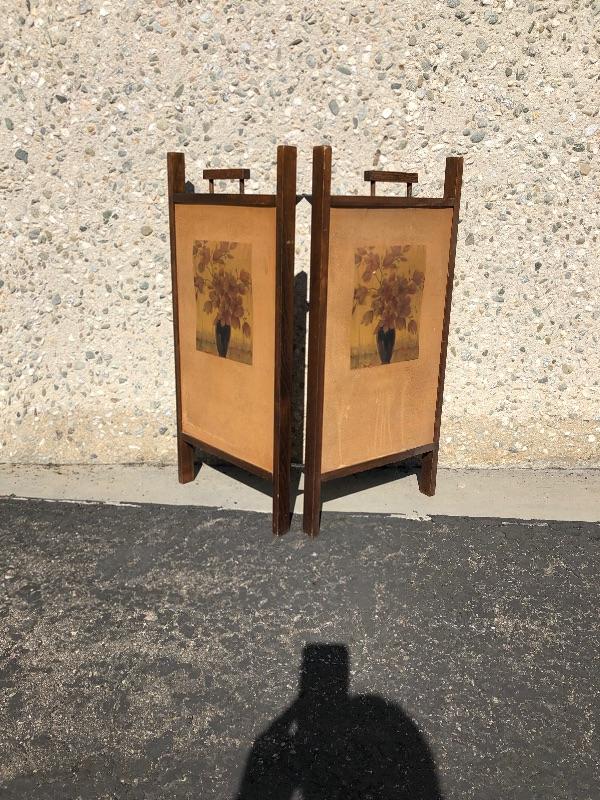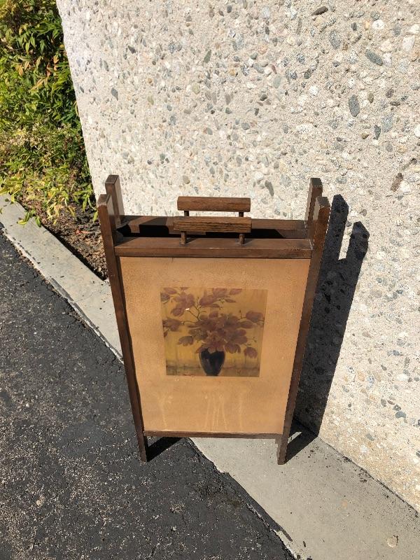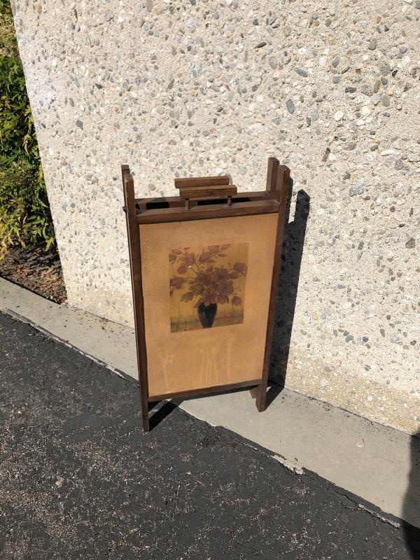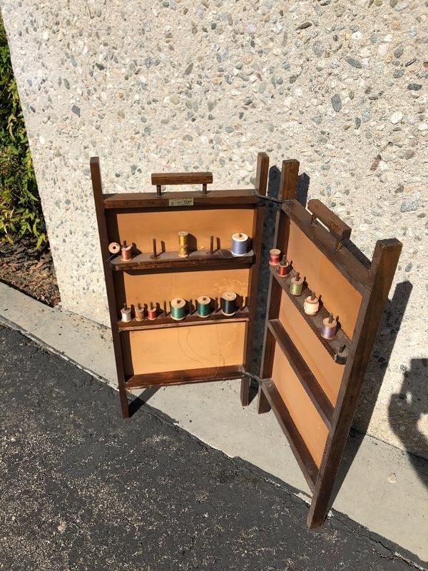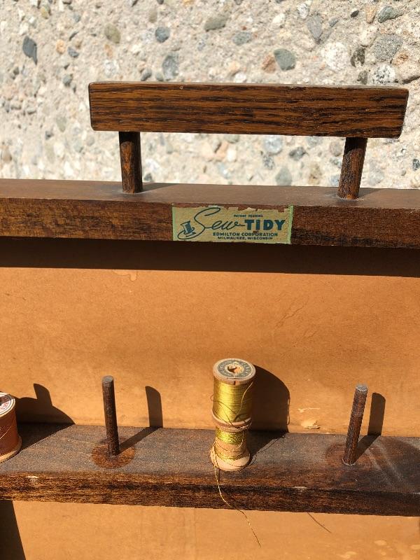 Cute vintage thread holder, Sew-Tidy from The Edmilton Corporation. Fold up caddy. Flower picture on the outside. Has a couple rows for spools, would have had a hangbag inside. Used.