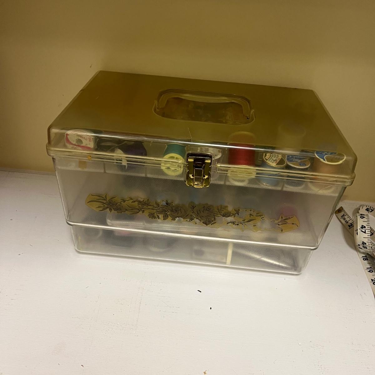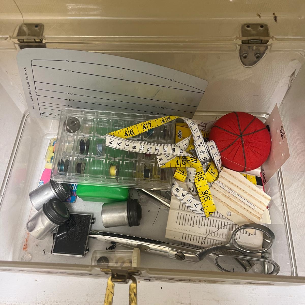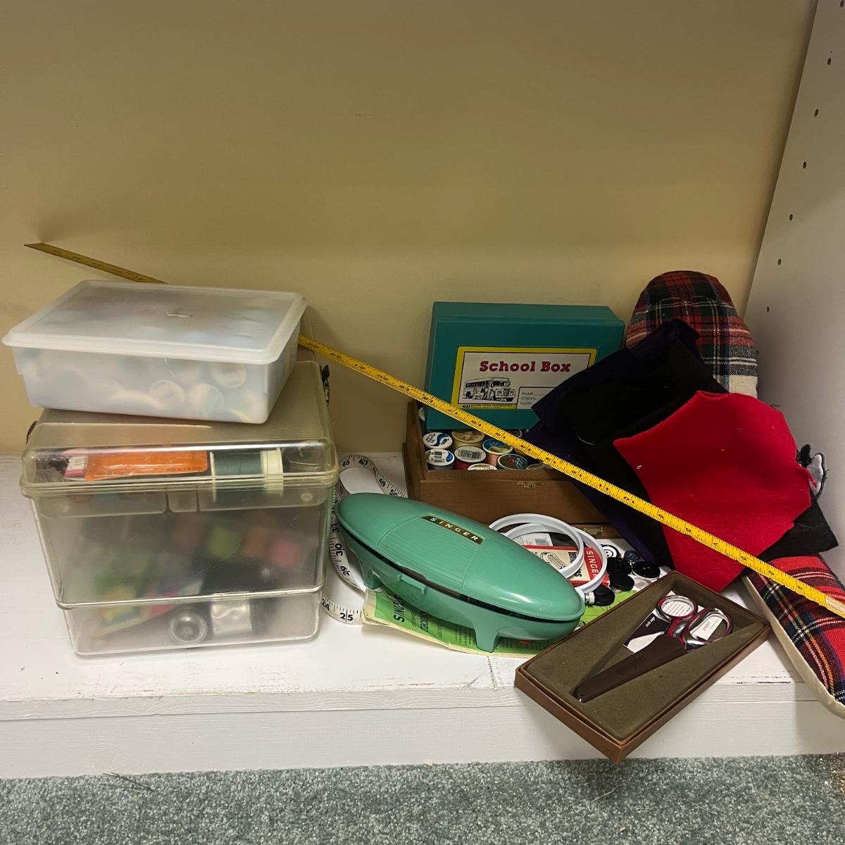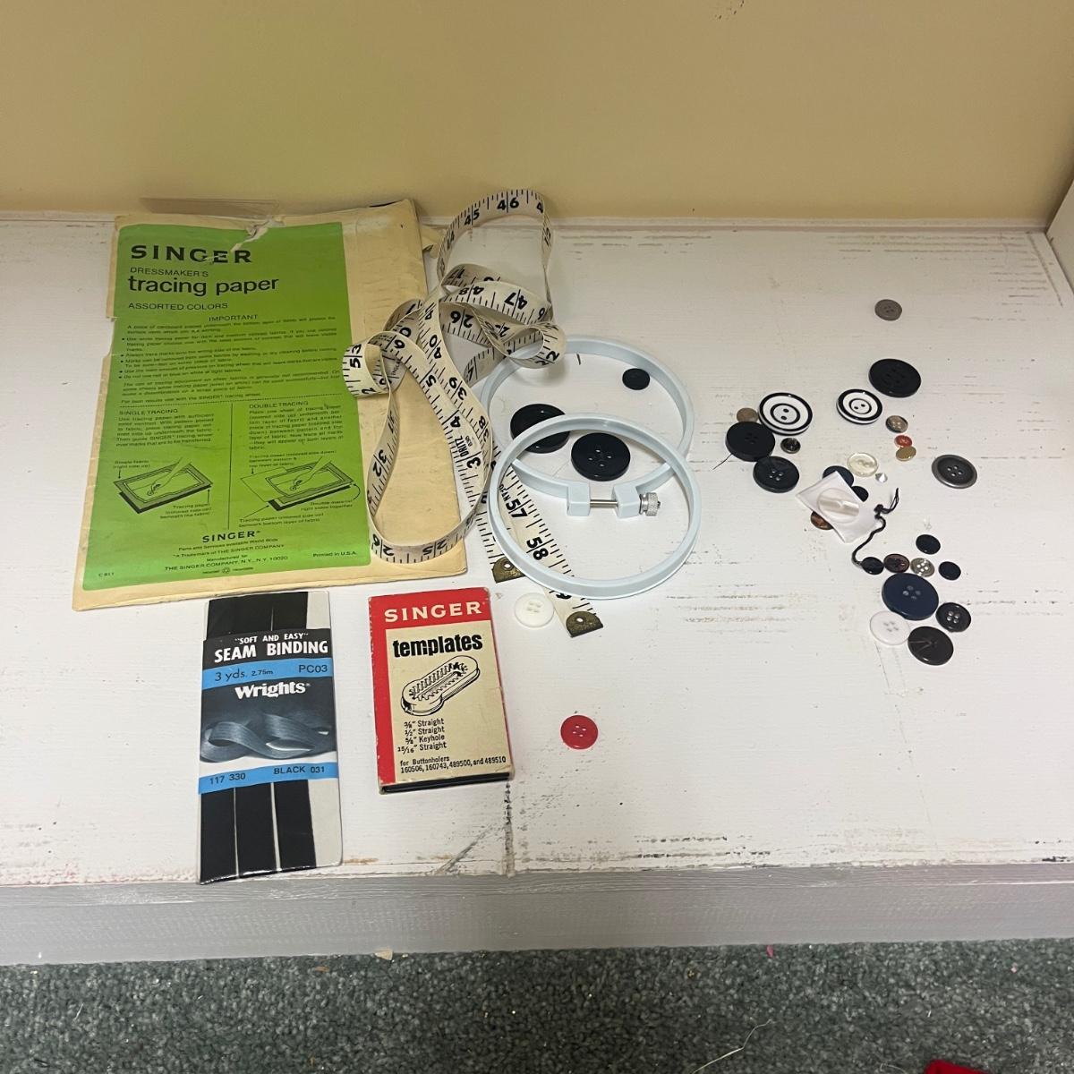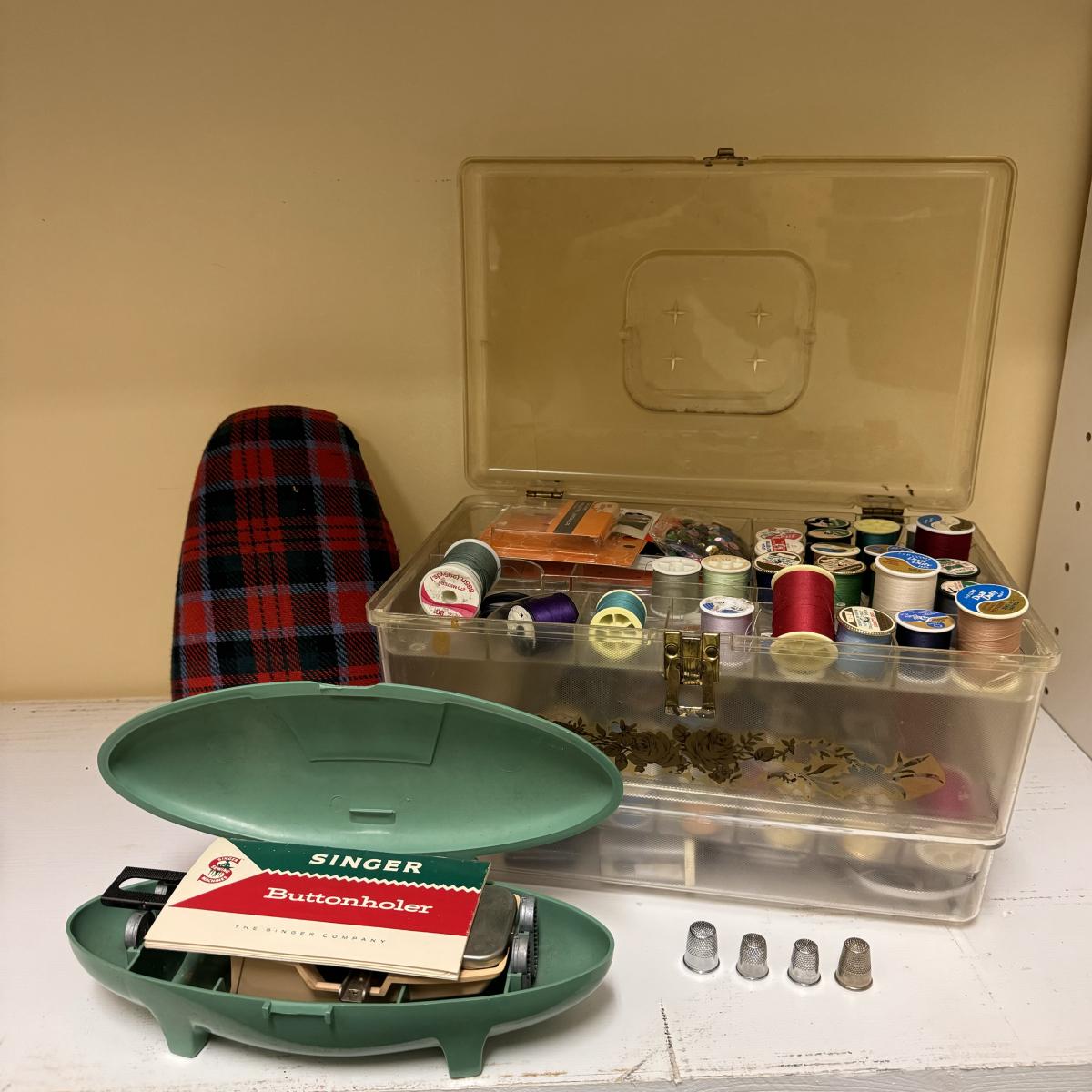 Lot includes Ginger scissors, Dritz Ham and seam roll, Singer buttonholer, plastic sewing box, selection of thread, buttons and more. Sewing box measures 14” x 9” x 8”H.