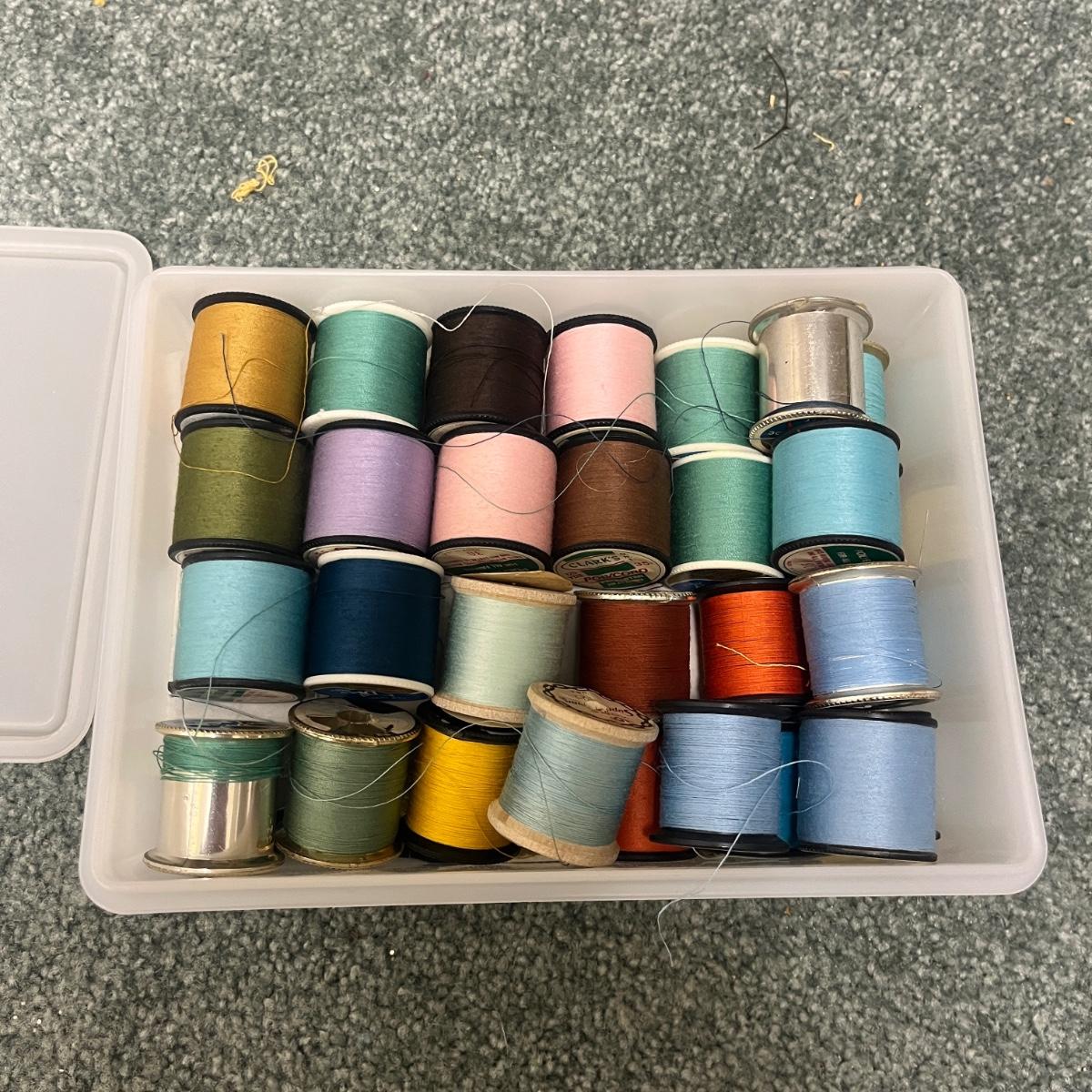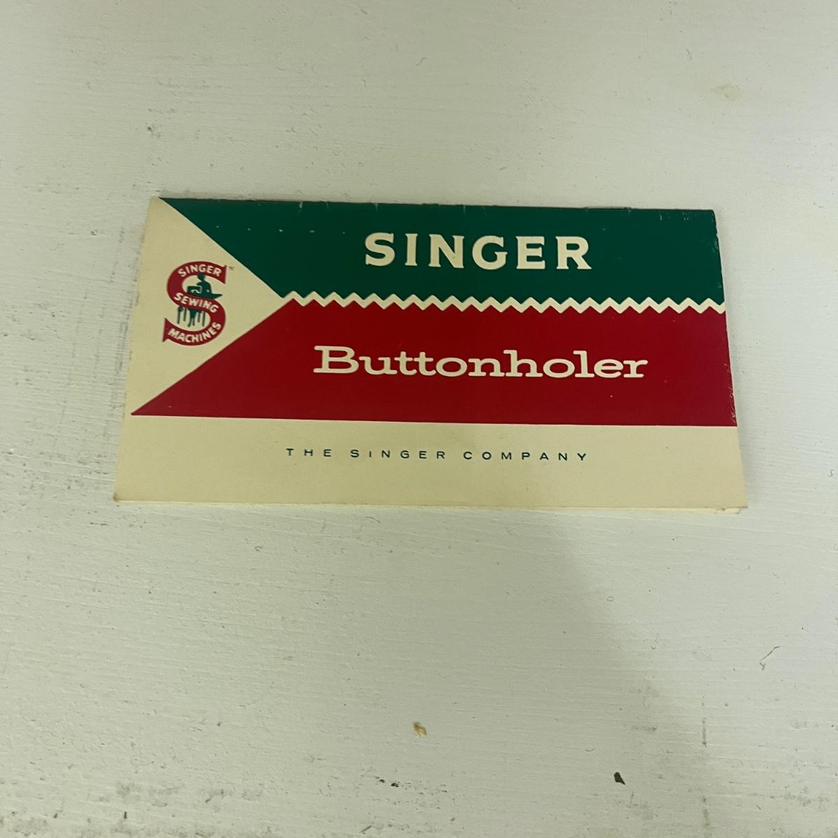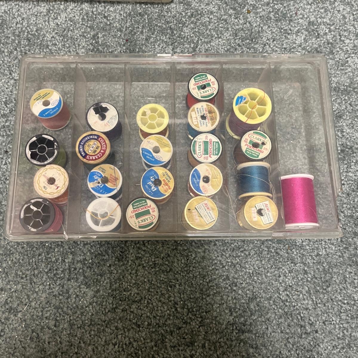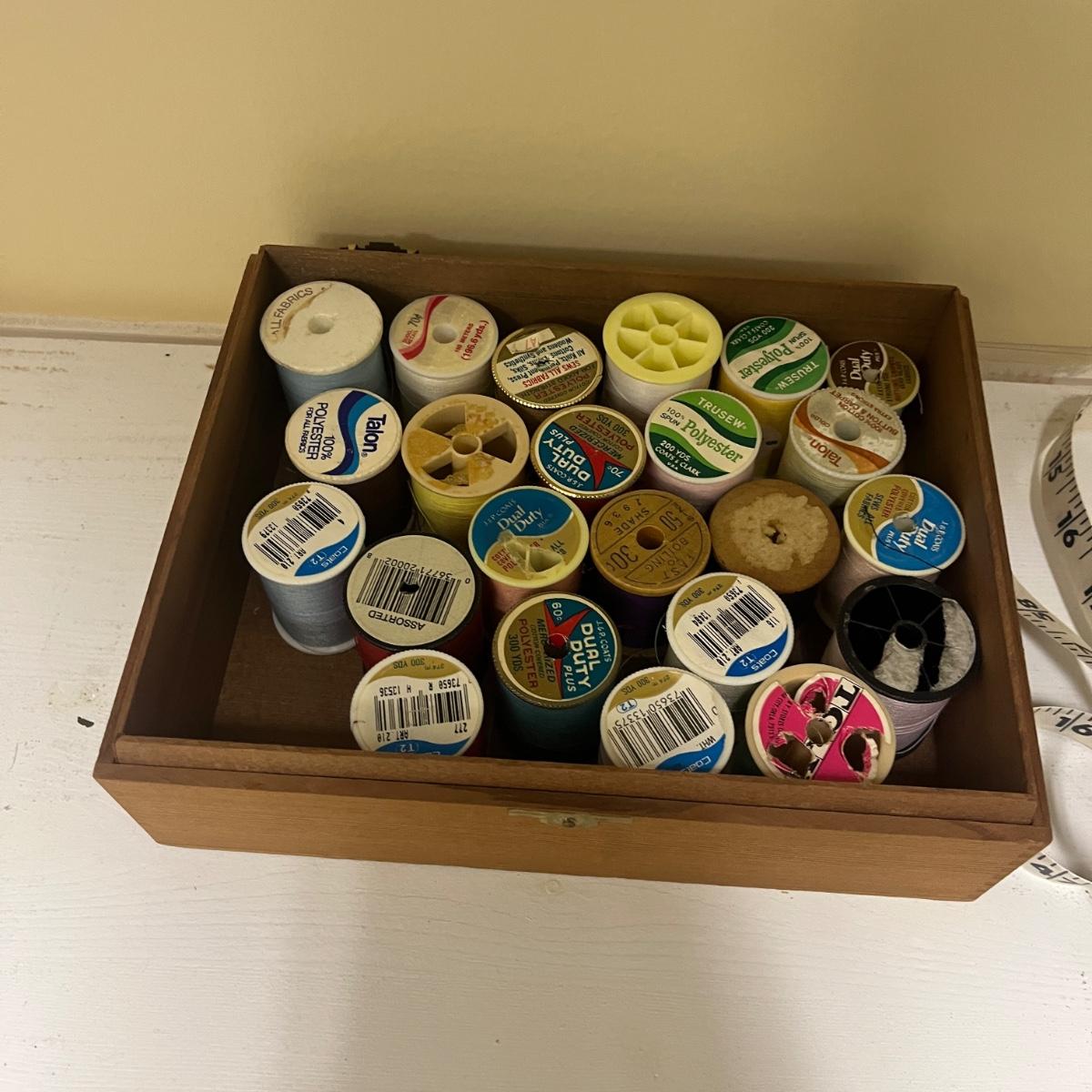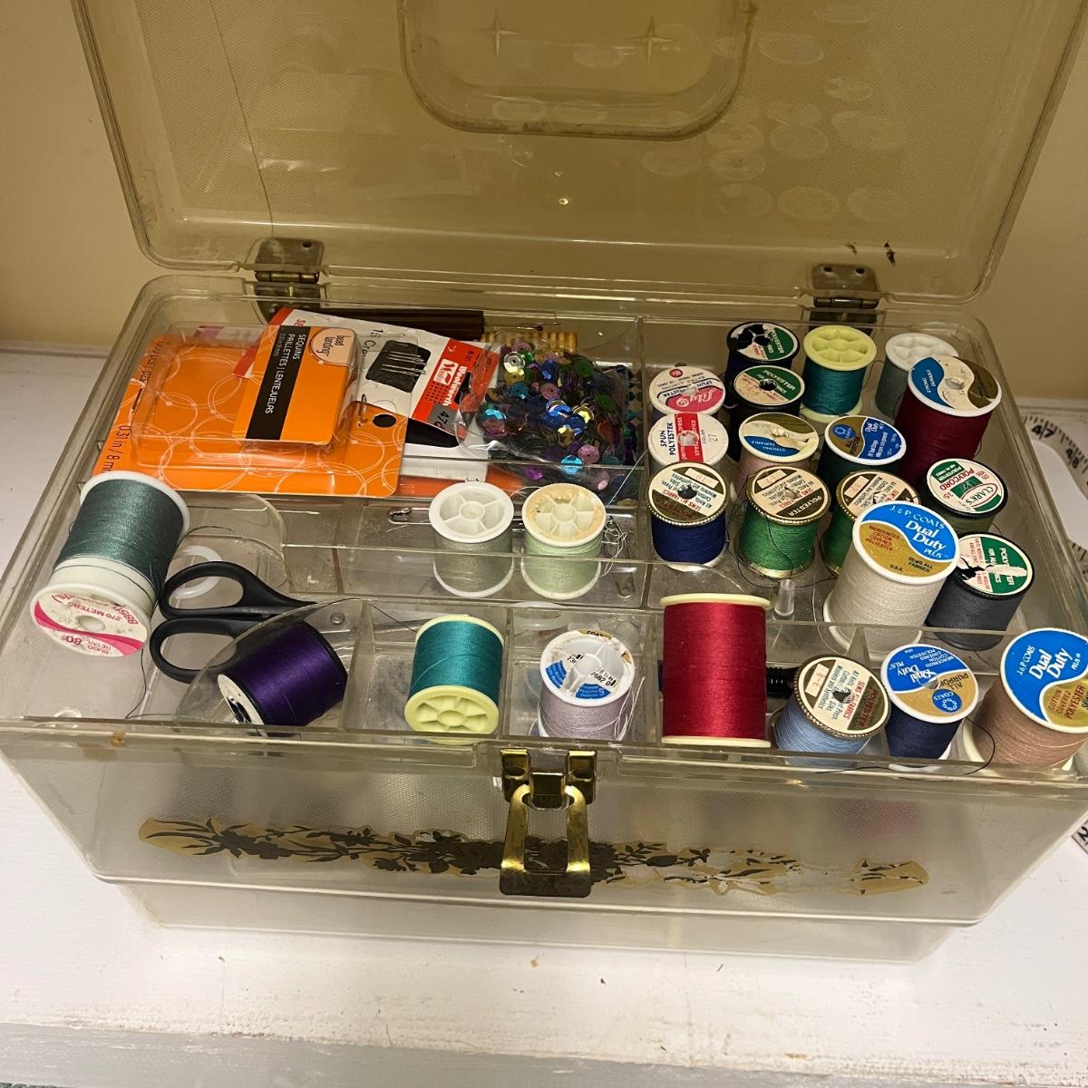 Lot includes Ginger scissors, Dritz Ham and seam roll, Singer buttonholer, plastic sewing box, selection of thread, buttons and more. Sewing box measures 14” x 9” x 8”H.