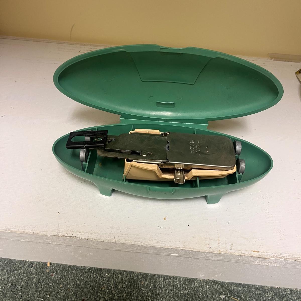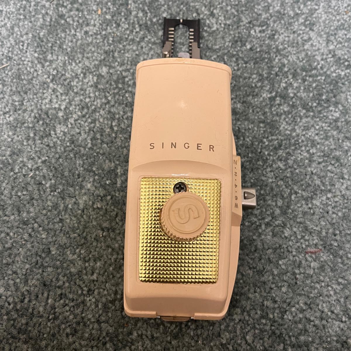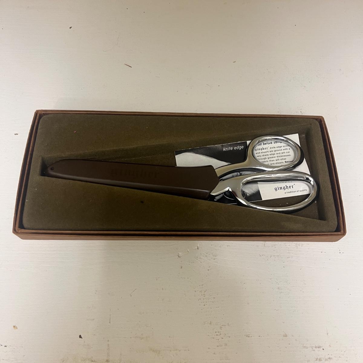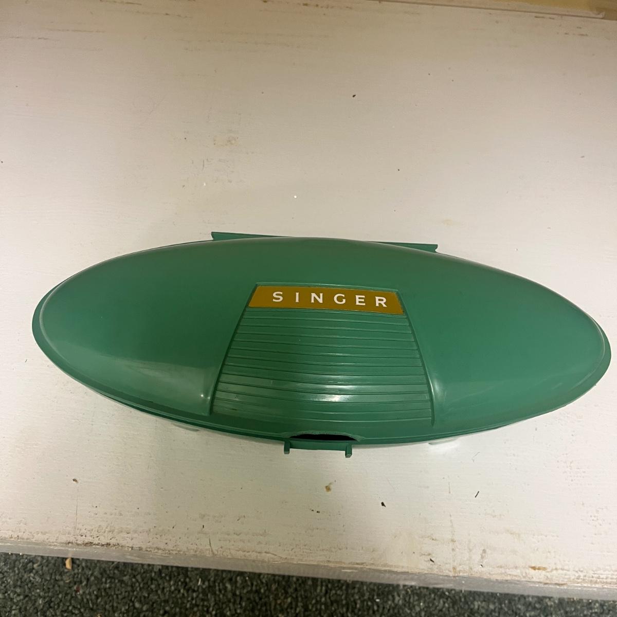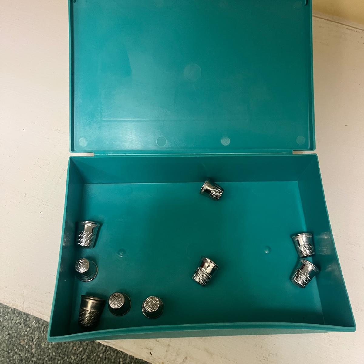 Lot includes Ginger scissors, Dritz Ham and seam roll, Singer buttonholer, plastic sewing box, selection of thread, buttons and more. Sewing box measures 14” x 9” x 8”H.