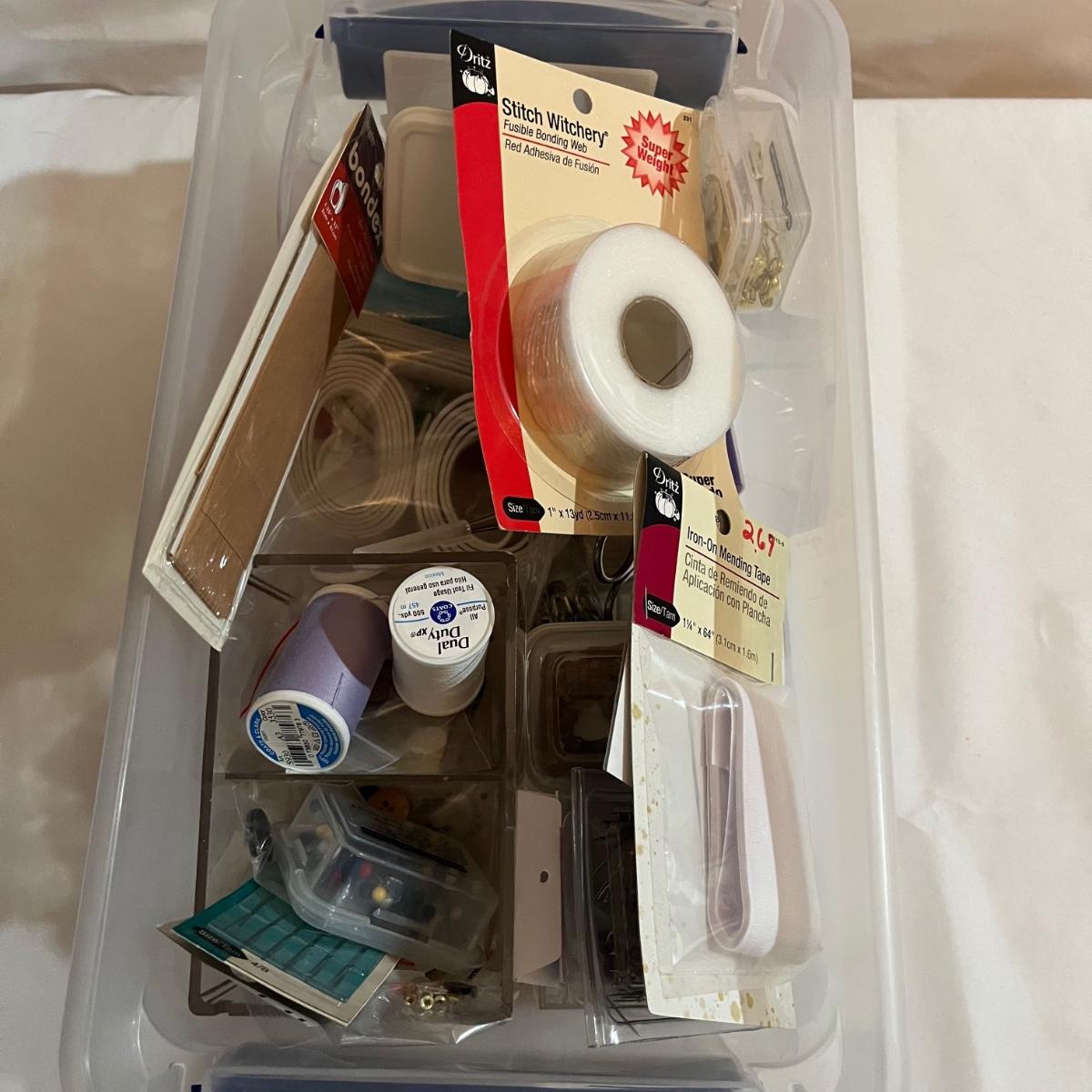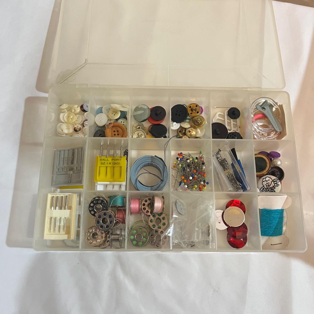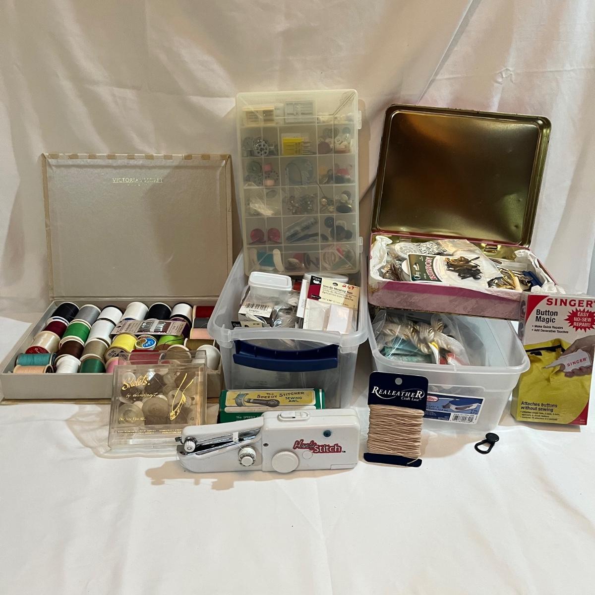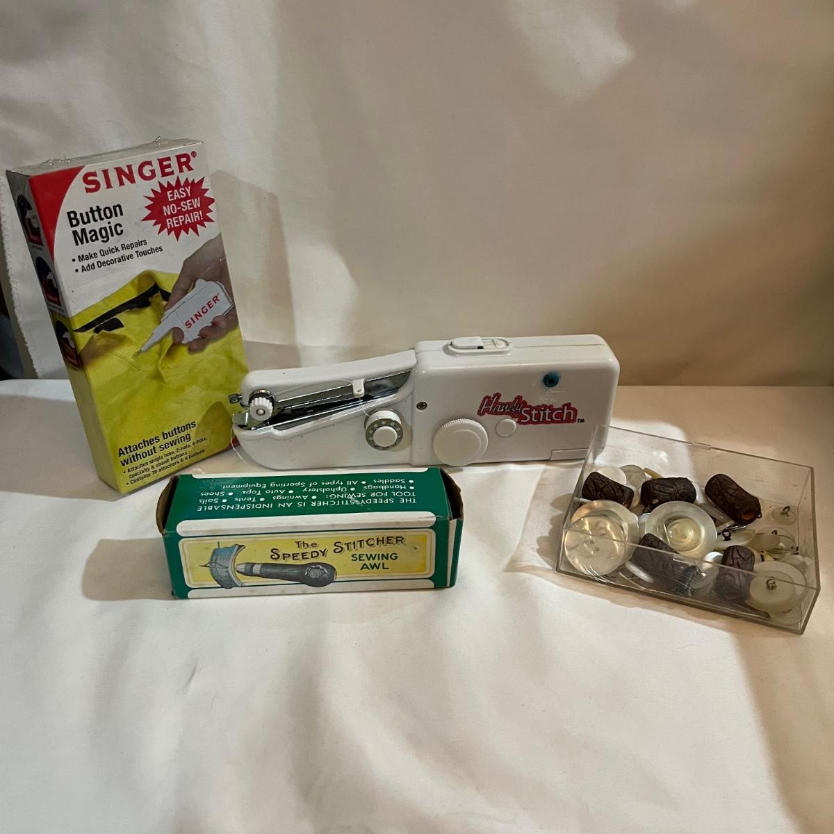 Lot includes Singer button magic, Handy Stitch, a variety of thread, Speedy Stitcher, bobbins, buttons and more.