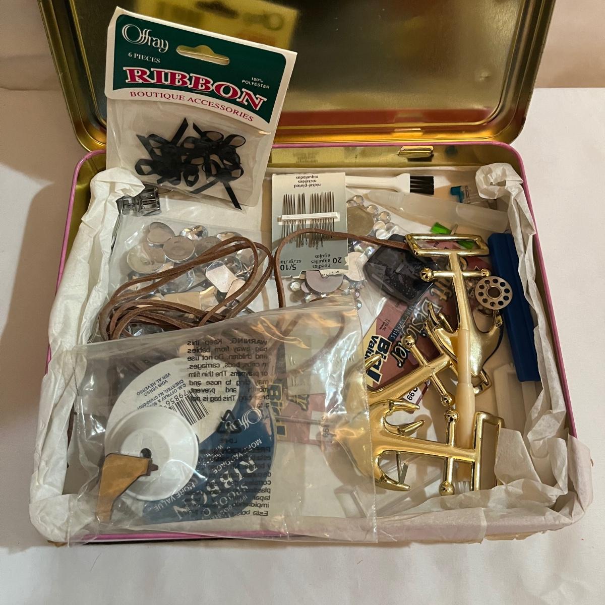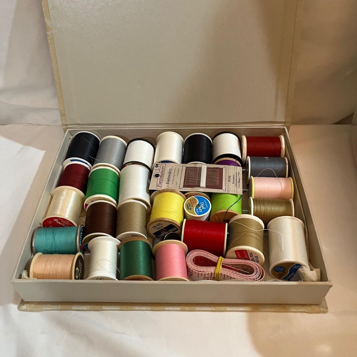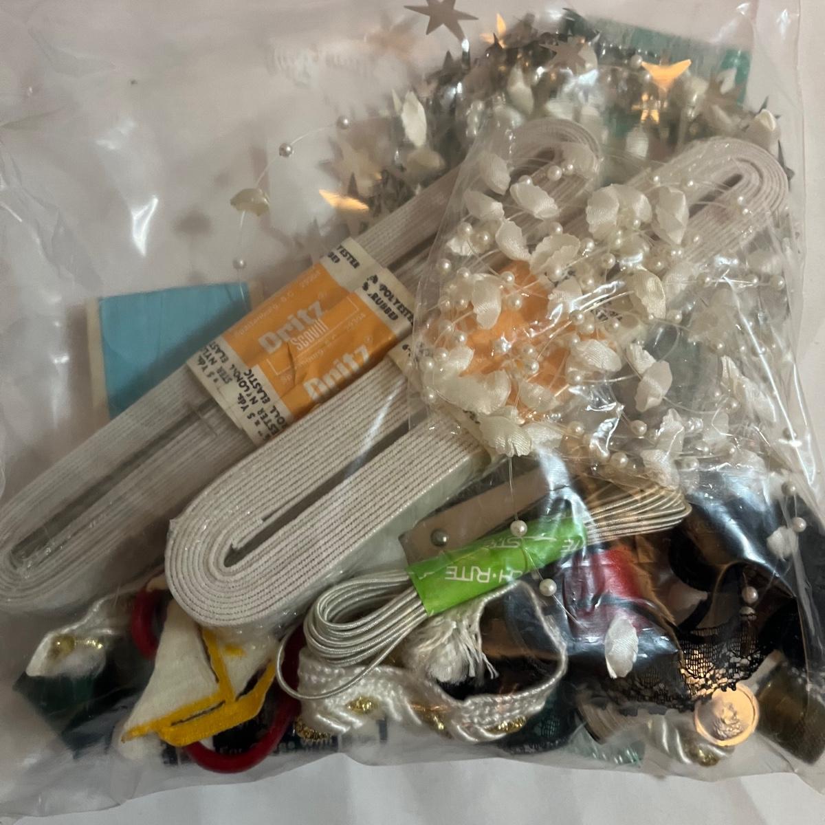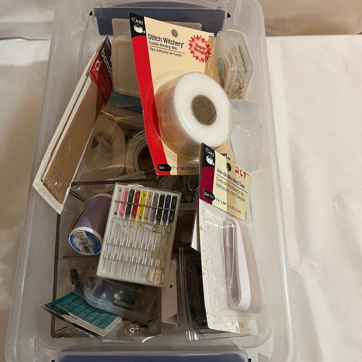 Lot includes Singer button magic, Handy Stitch, a variety of thread, Speedy Stitcher, bobbins, buttons and more.