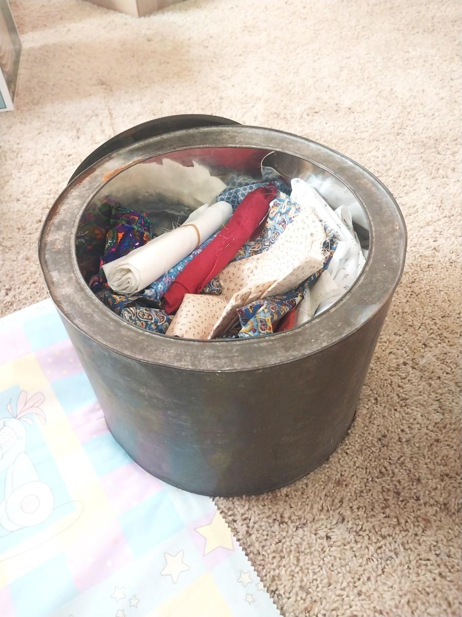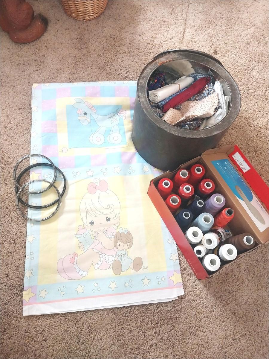 OLD TIN FULL SCRAP MATERIALS-MANY THREADS-HOOPS AND PRECIOUS MOMENTS MATERIAL