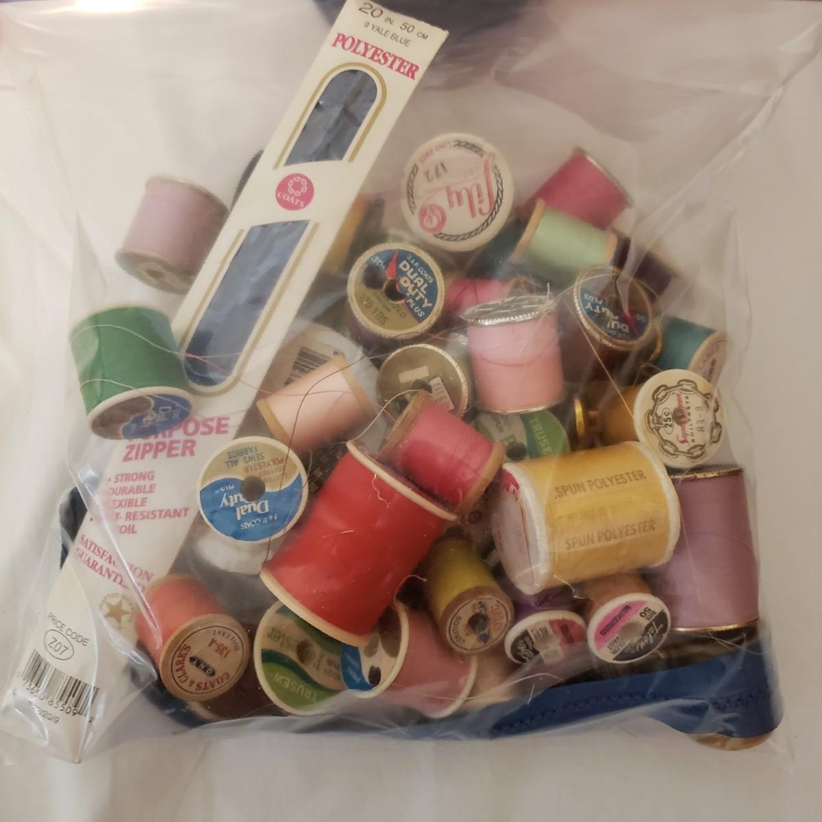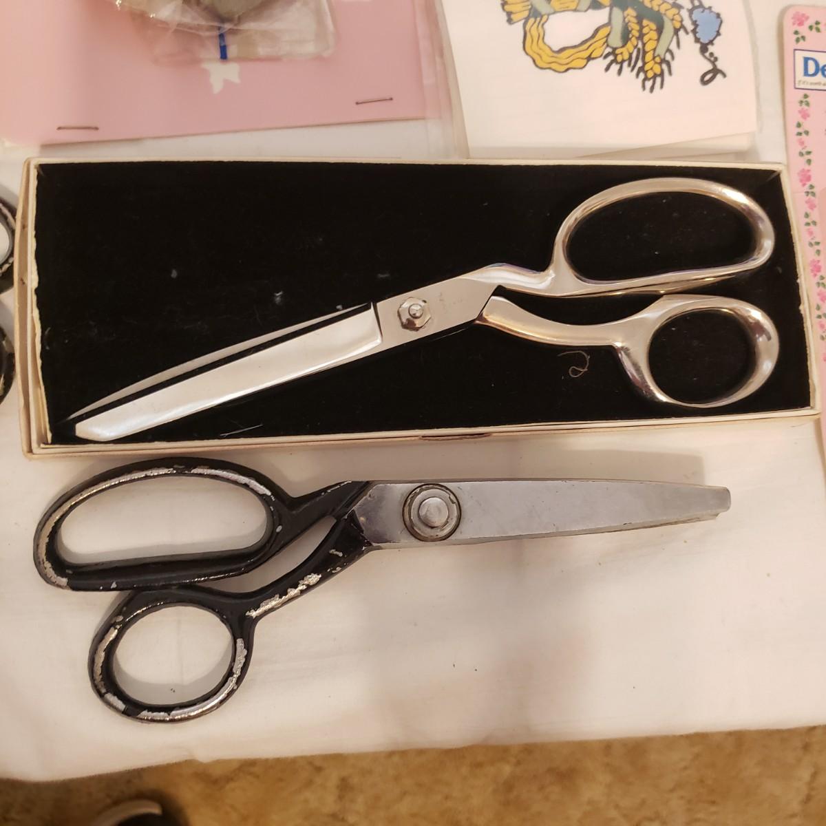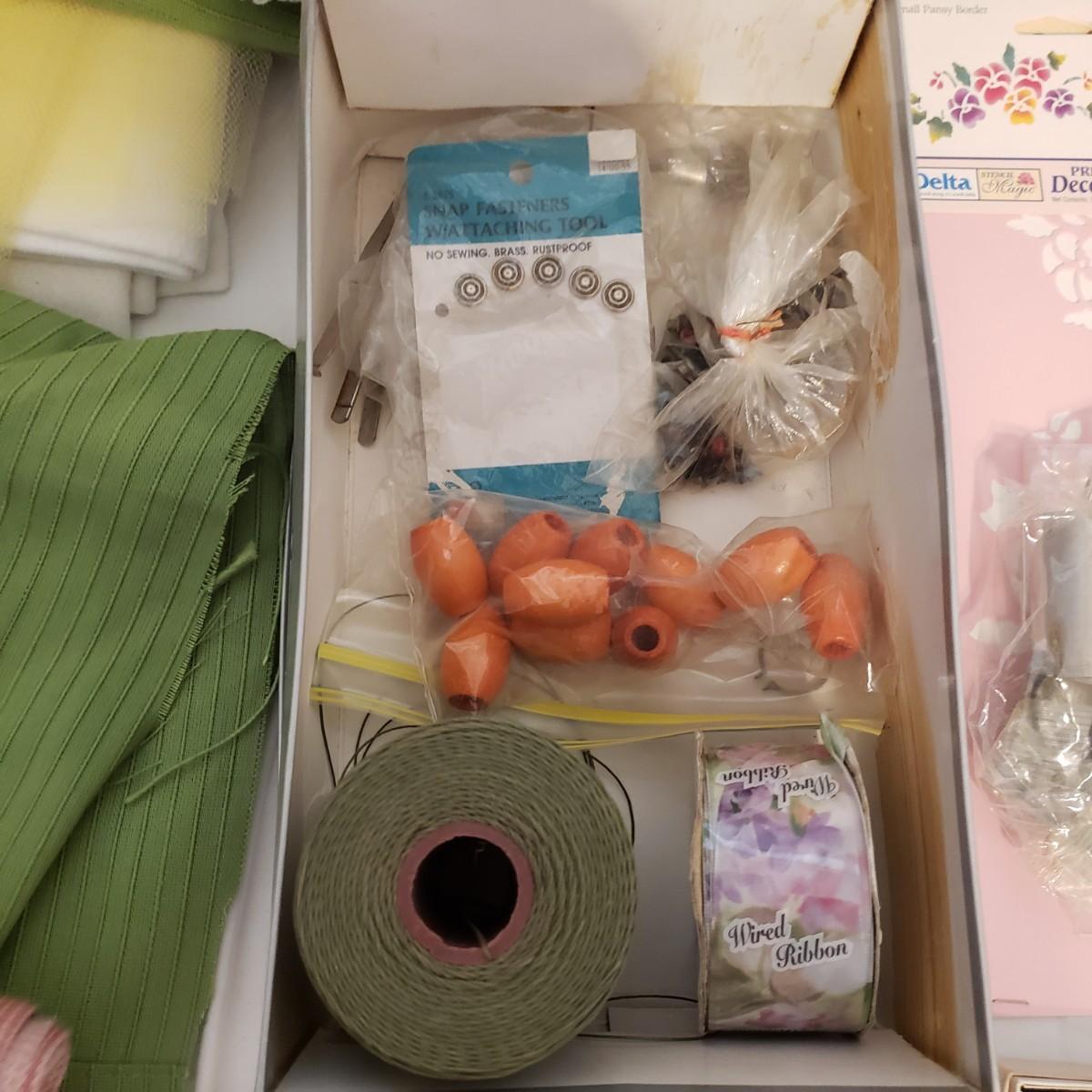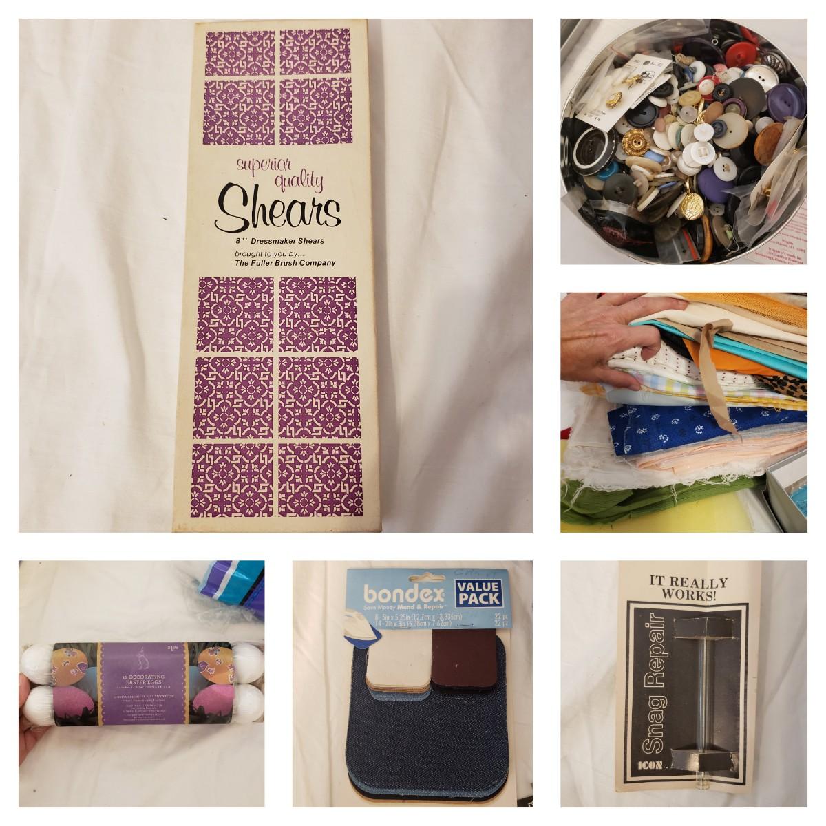 This sewing and craft has a bit of everything from material/thread, shears, yarn and knitting needles to paint brushes and ready to paint Easter Eggs! The cookie tin of buttons is nothing but classic! The last picture shows lot all packed up. The cardboard box is all material for reference. Also includes a quilting frame. Please see photos for details.