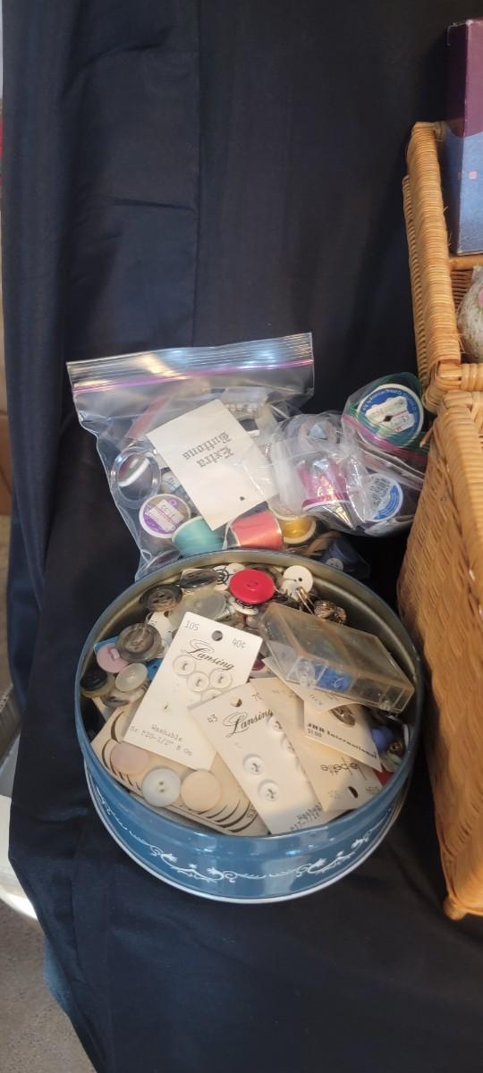 Sewing basket filled with great stuff! Tin of buttons and more!