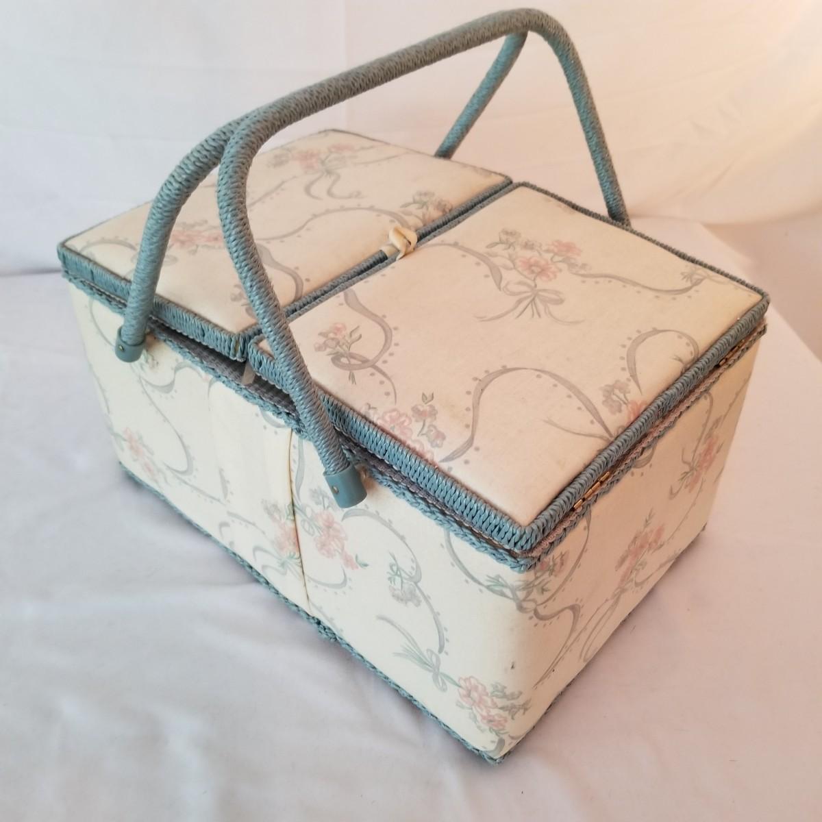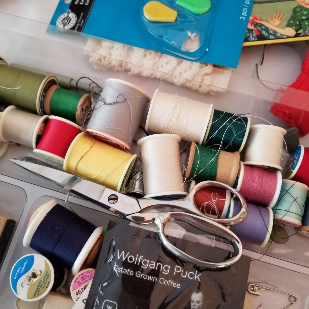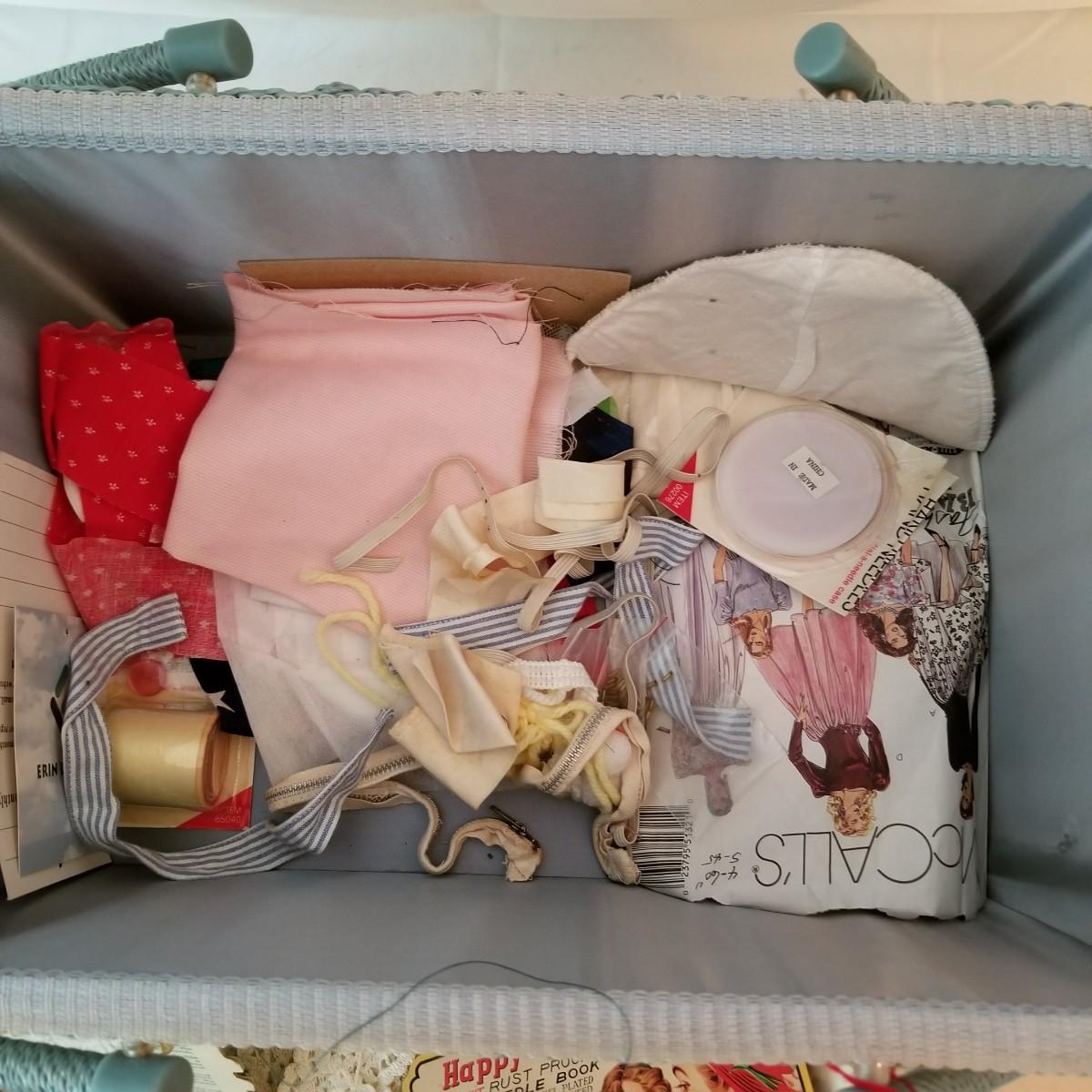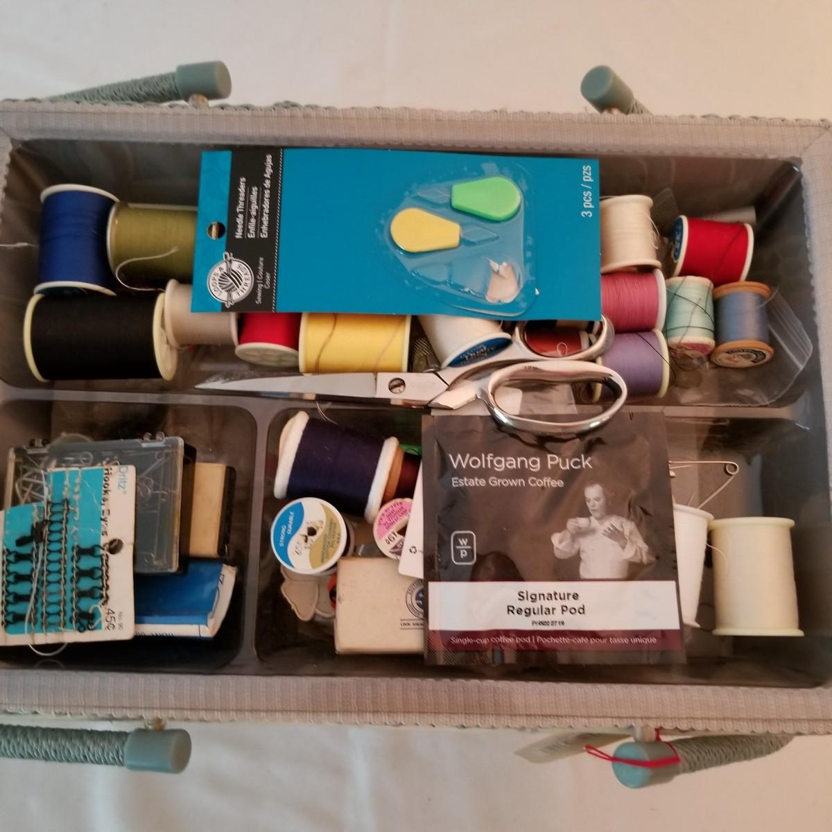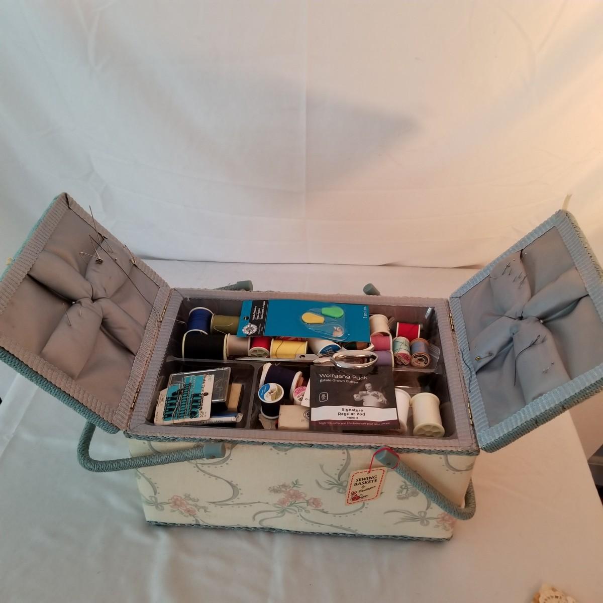 A sewing basket chock full of notions, thread and more. Needles, pins, snaps, lace, pinking shears, buttons, etc. Basket measures 15" x10" x8". Soft cloth covering and handles. Shipping available.