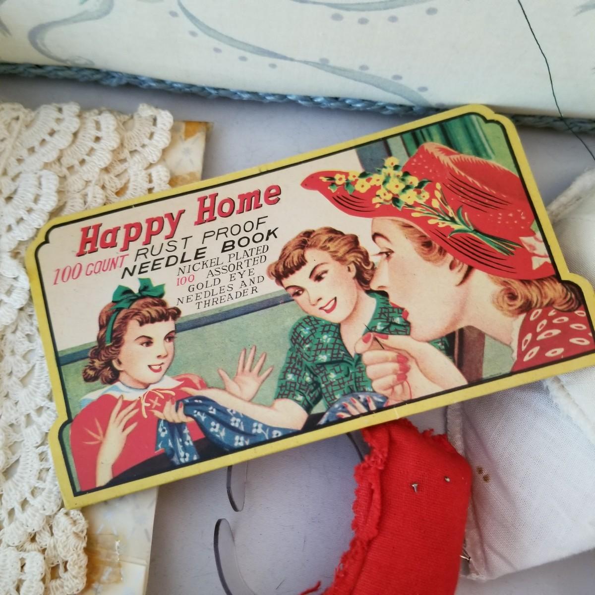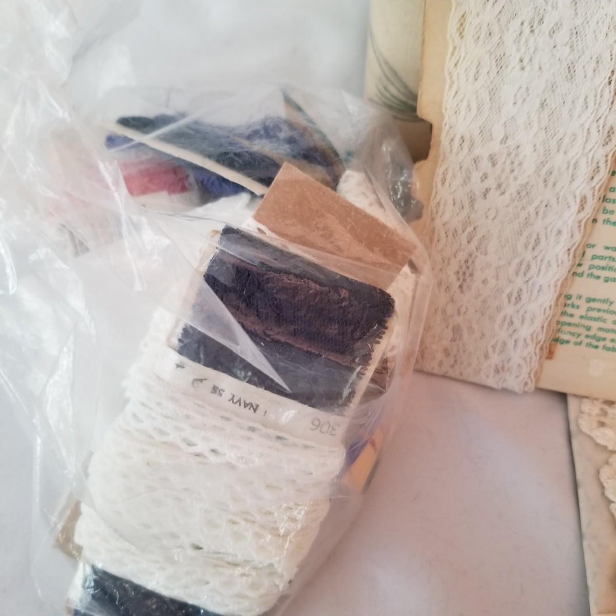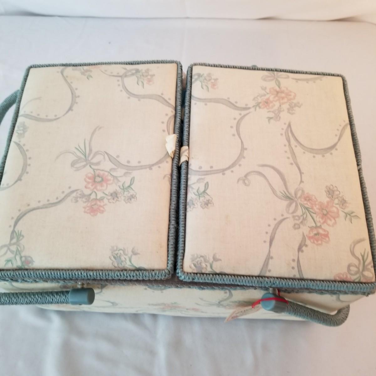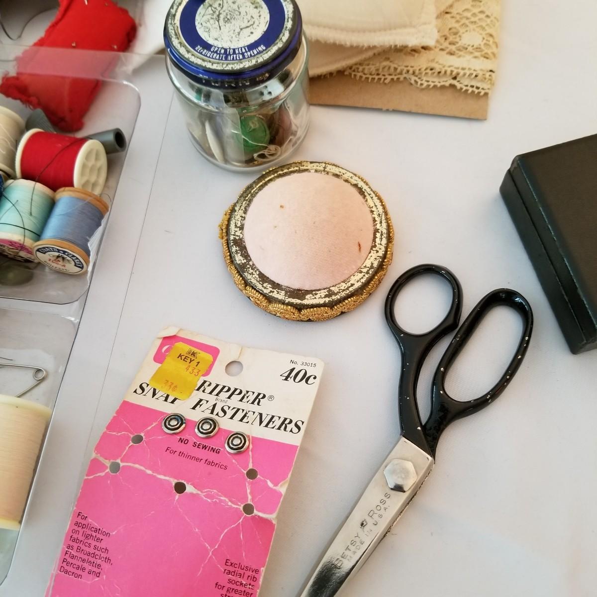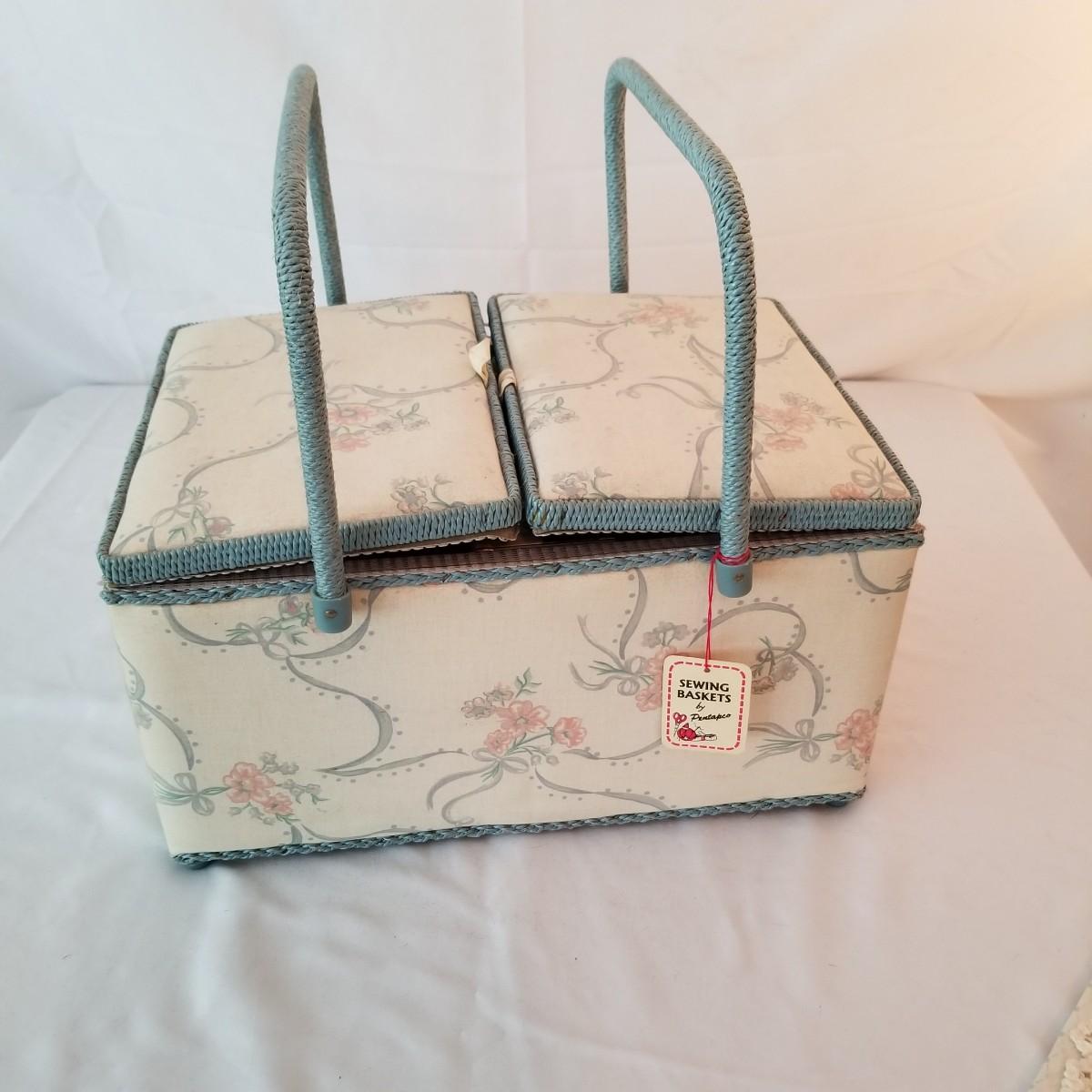 A sewing basket chock full of notions, thread and more. Needles, pins, snaps, lace, pinking shears, buttons, etc. Basket measures 15" x10" x8". Soft cloth covering and handles. Shipping available.