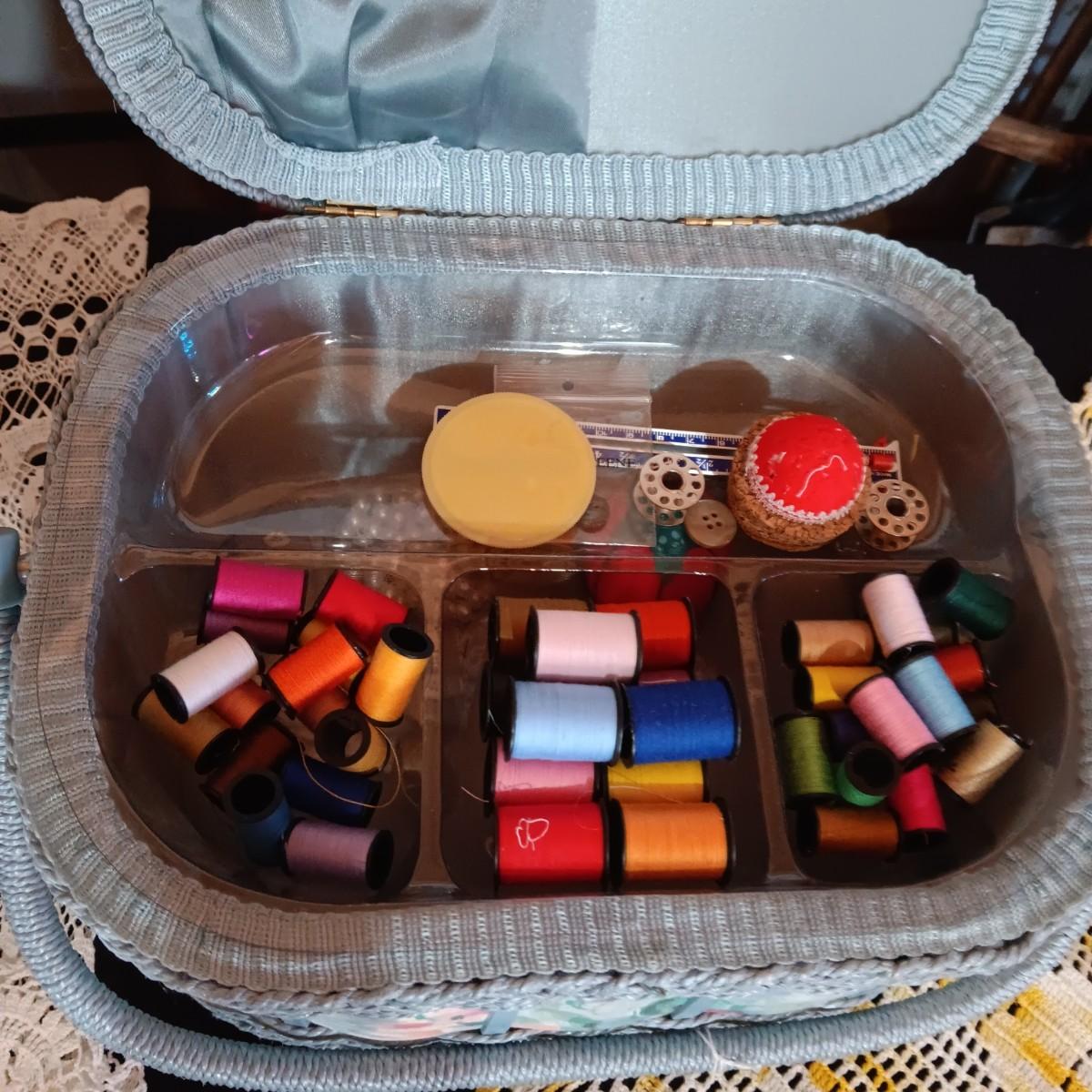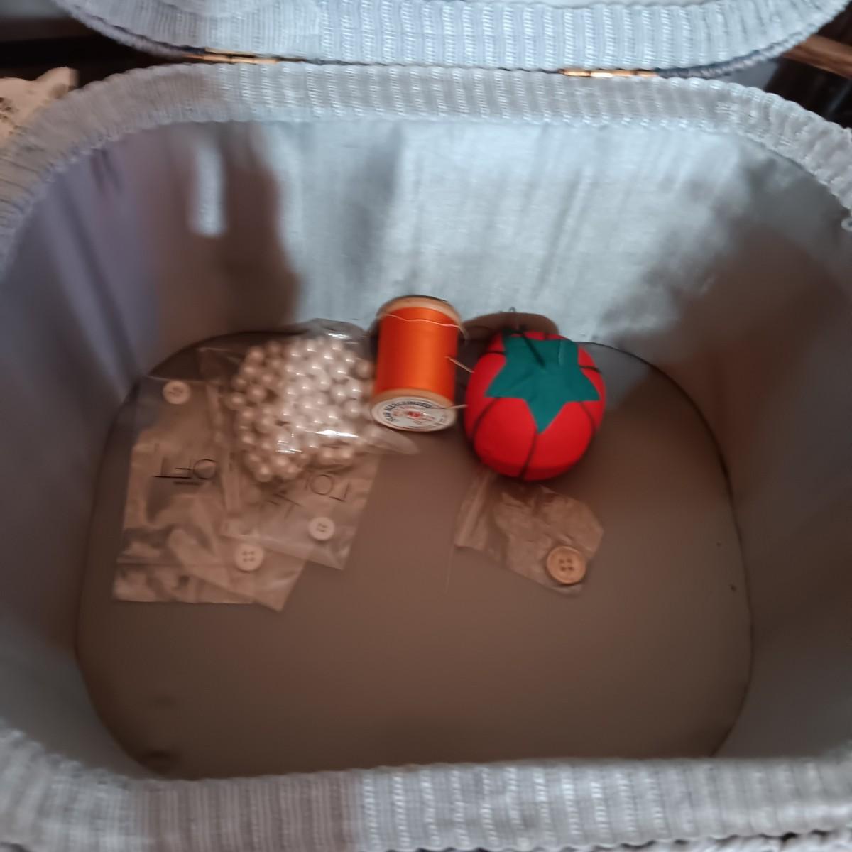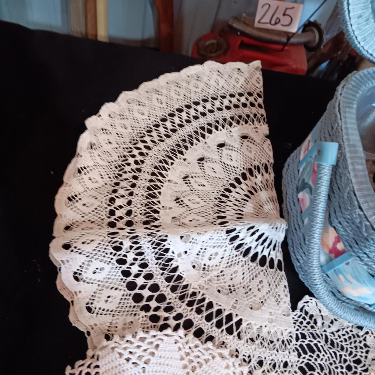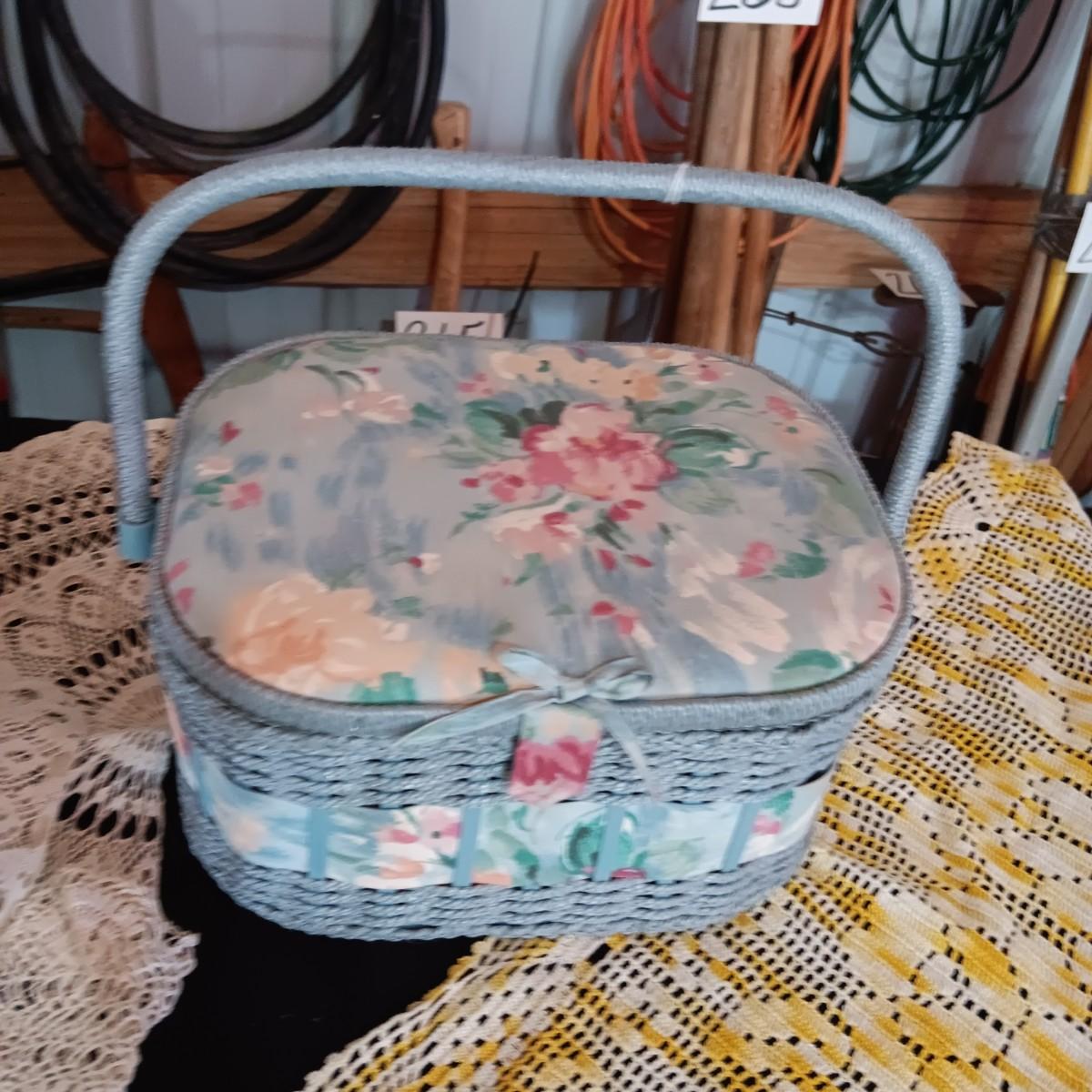 SEWING BASKET W/NOTIONS AND SEVERAL DOILIES