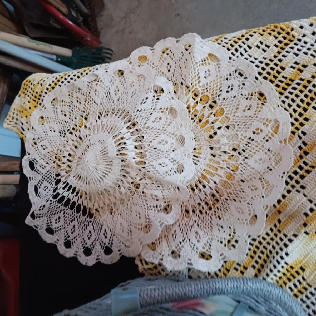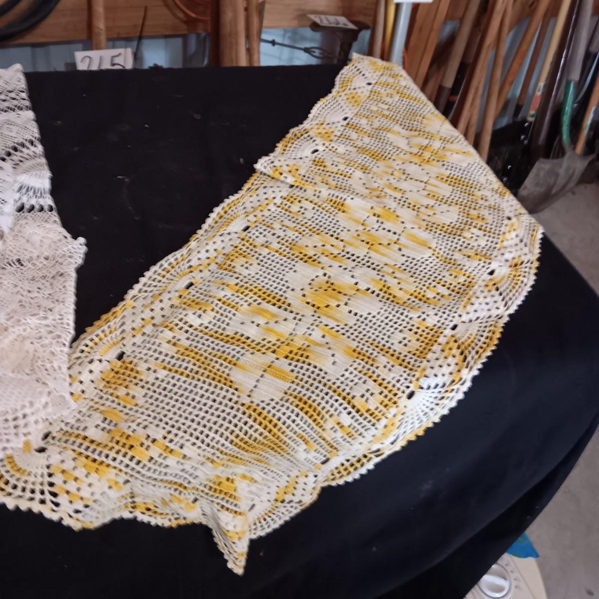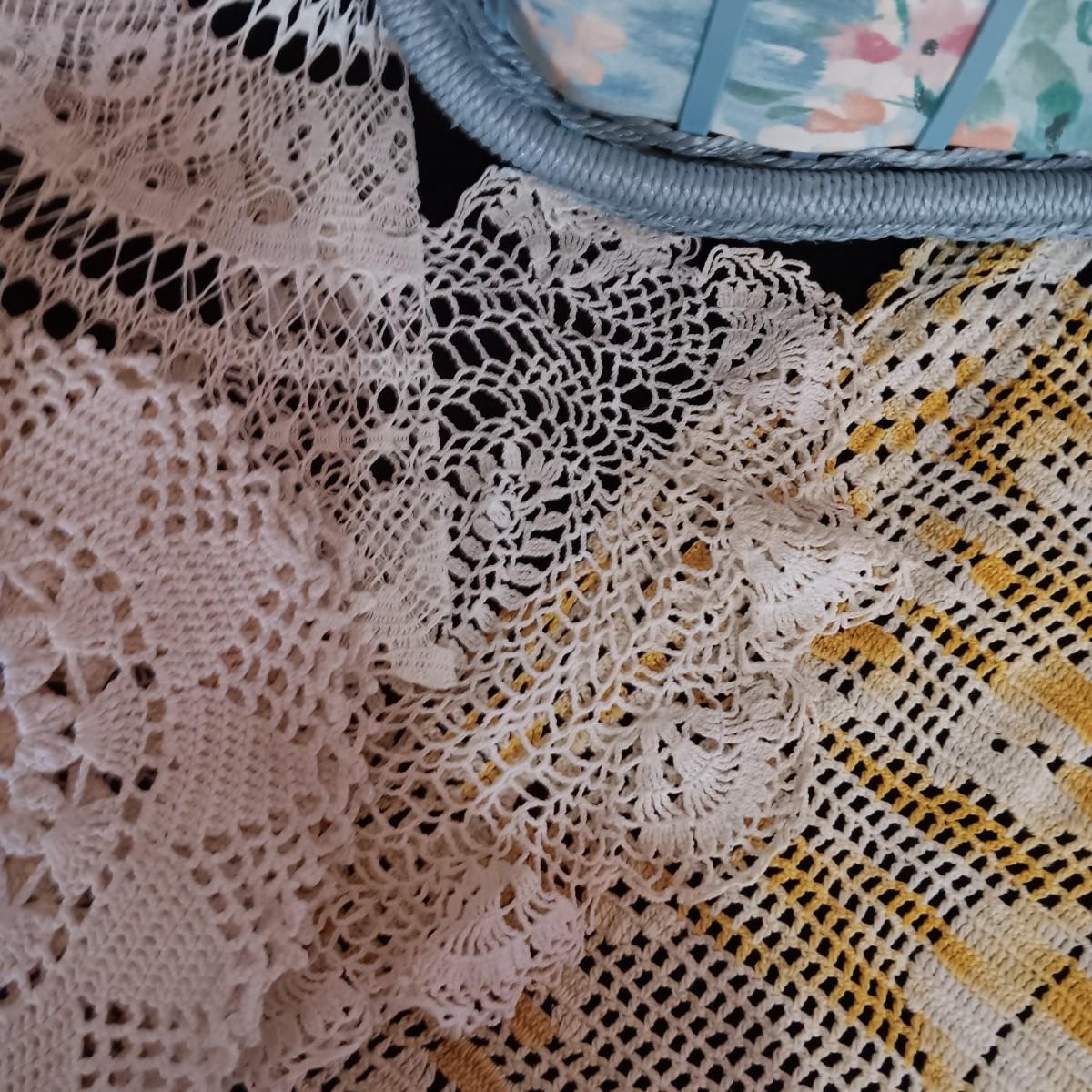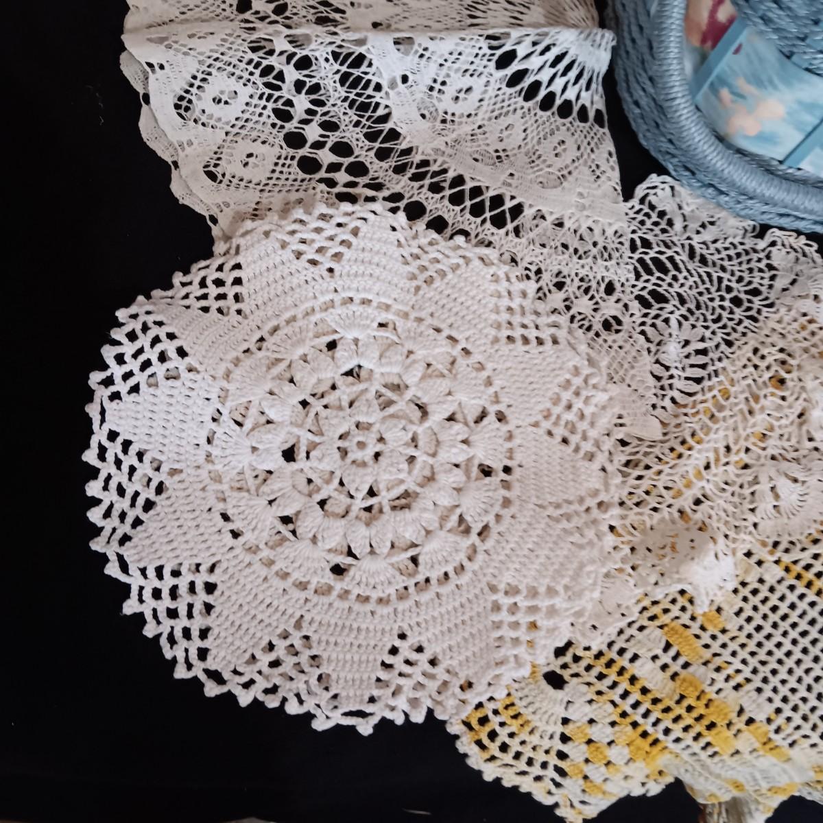 SEWING BASKET W/NOTIONS AND SEVERAL DOILIES