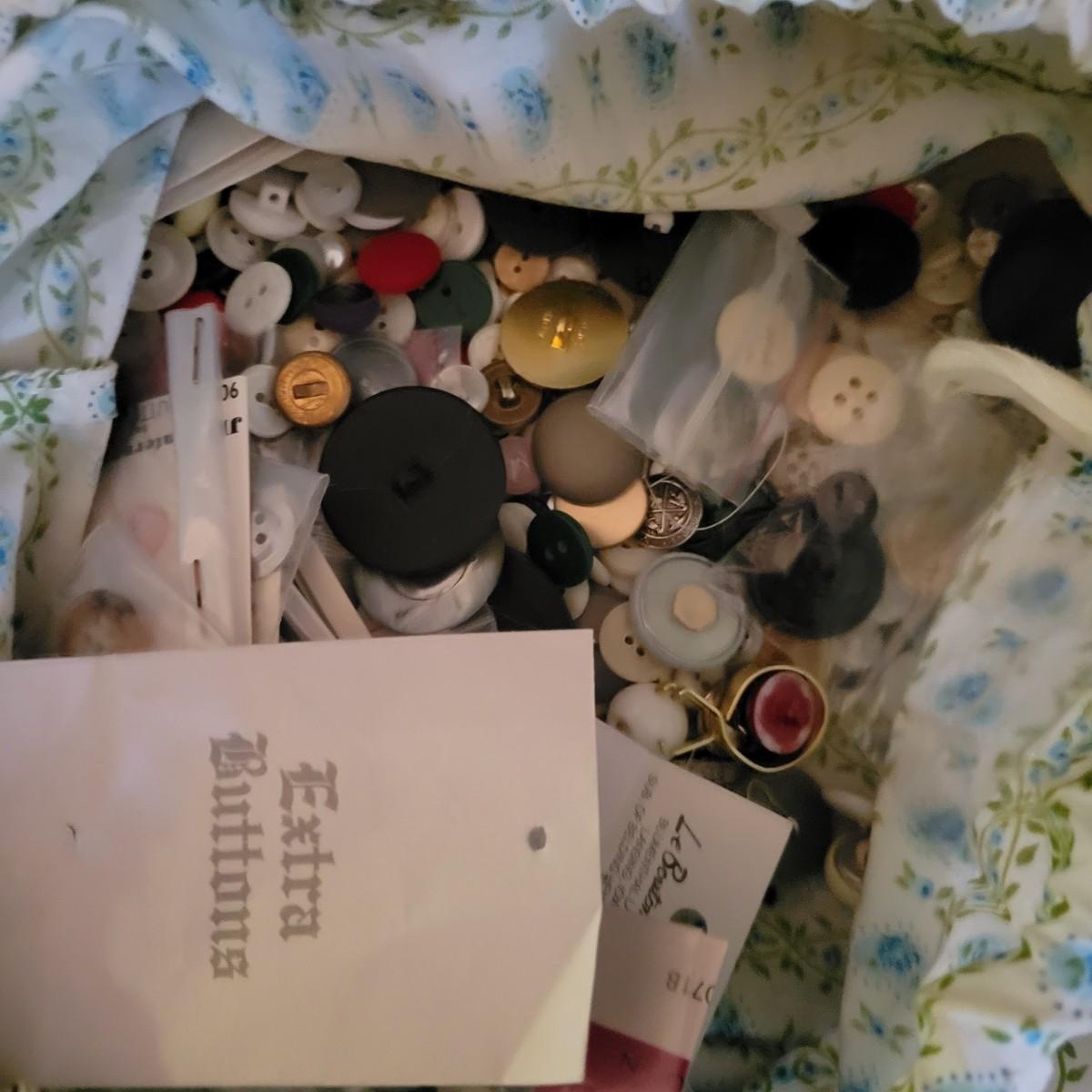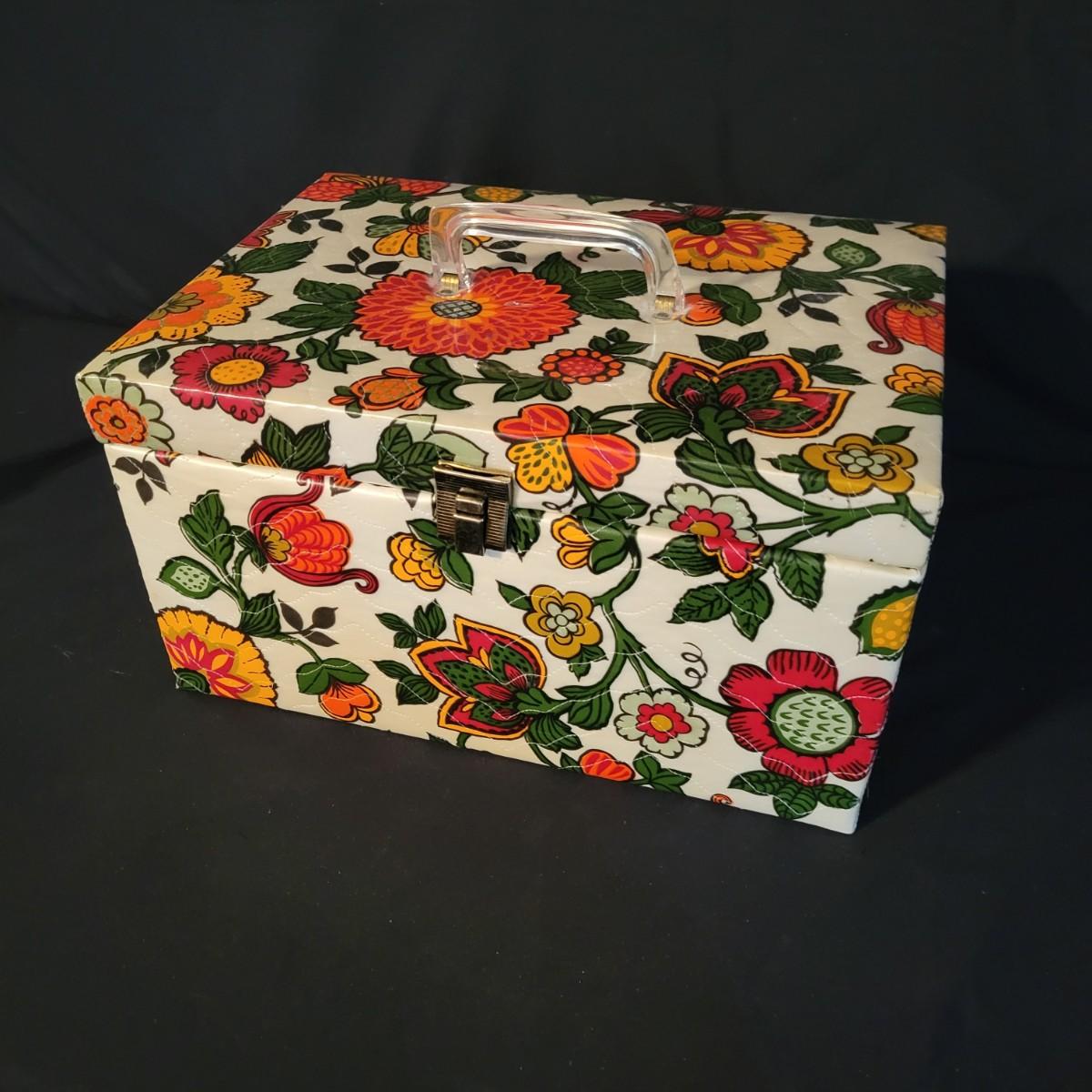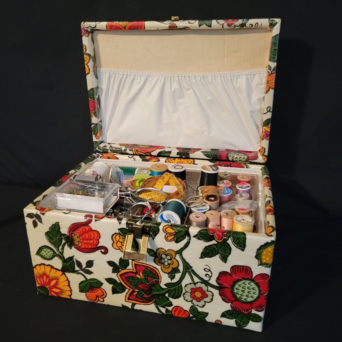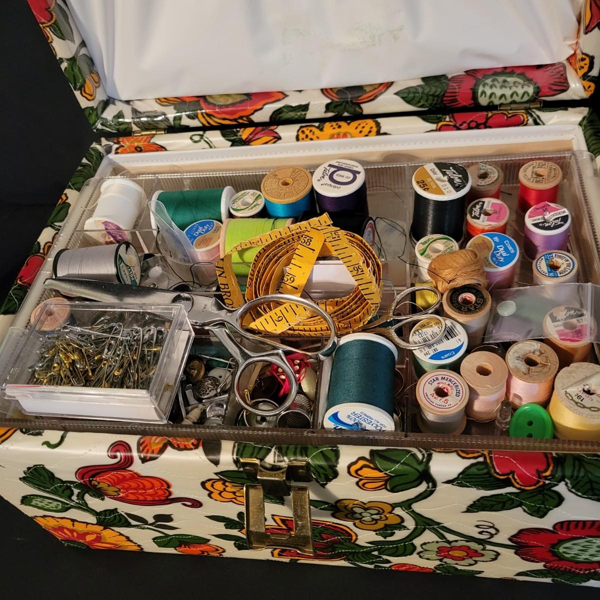 A sewing box with a floral design and metal clasp that measures approximately 15" x 10.5" x 8"H. Also included is an assortment of sewing supplies that includes thread, scissors, safety pins, buttons and more. Shipping available