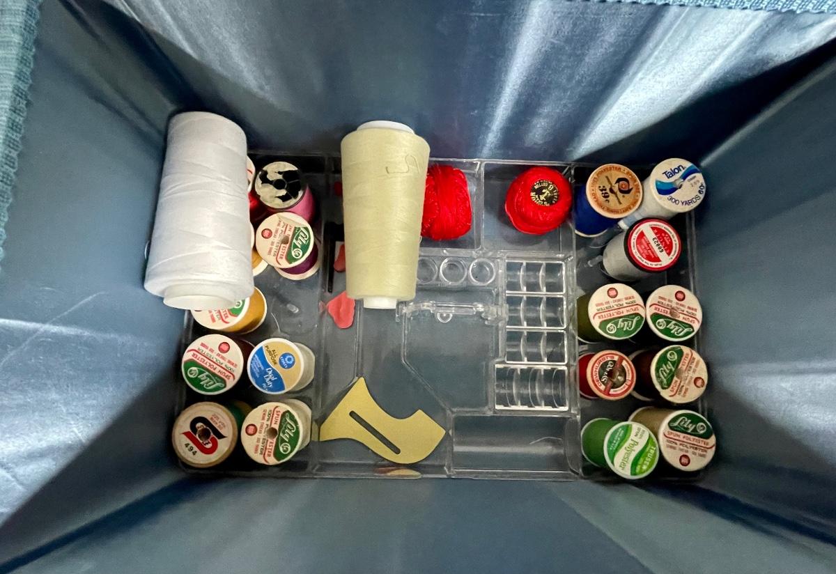 Inside are buttons, thread, Velcro, Pin Cushion, Scissors, etc. All in good condition.