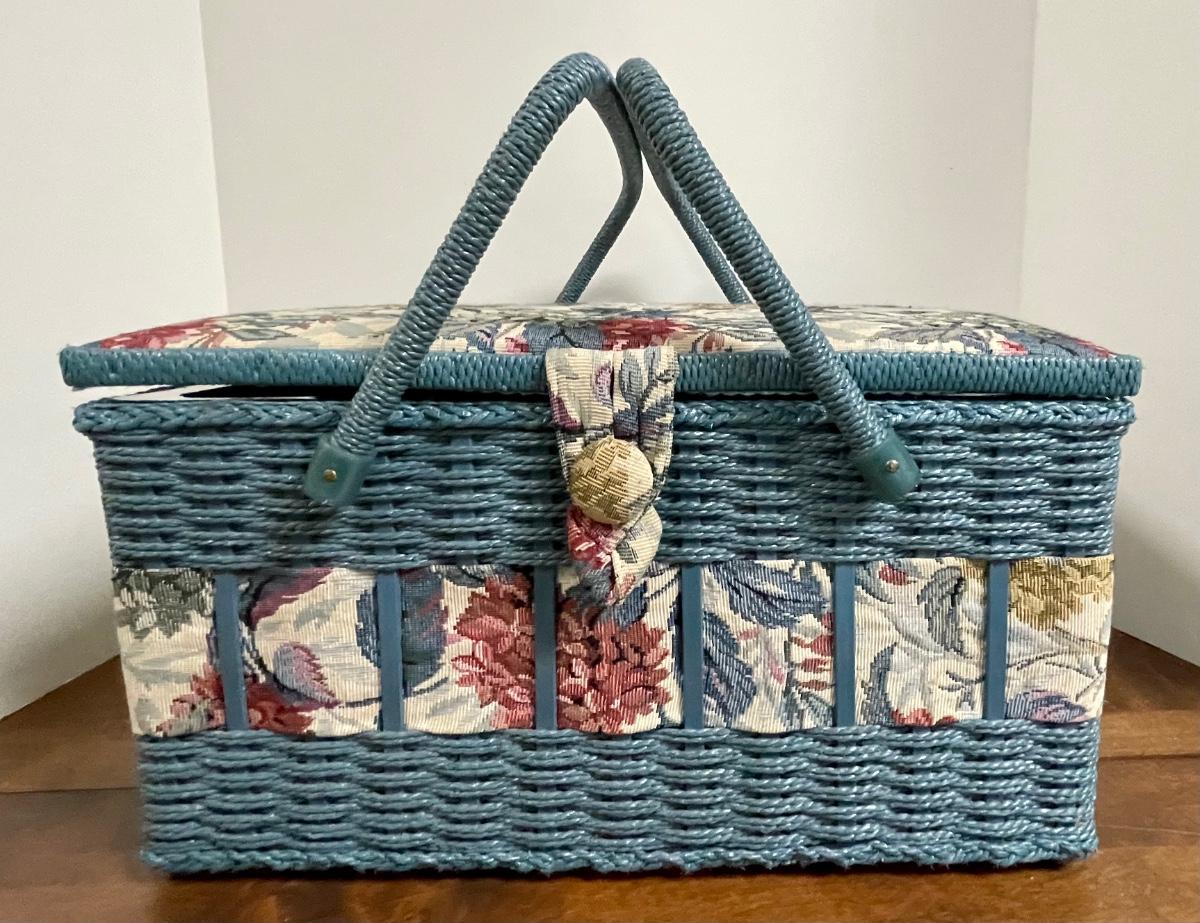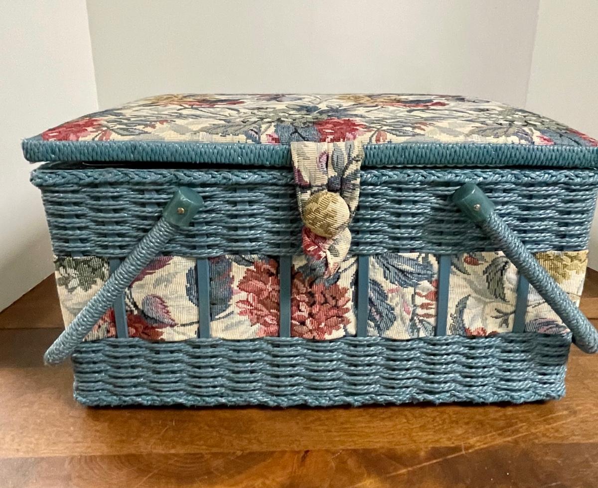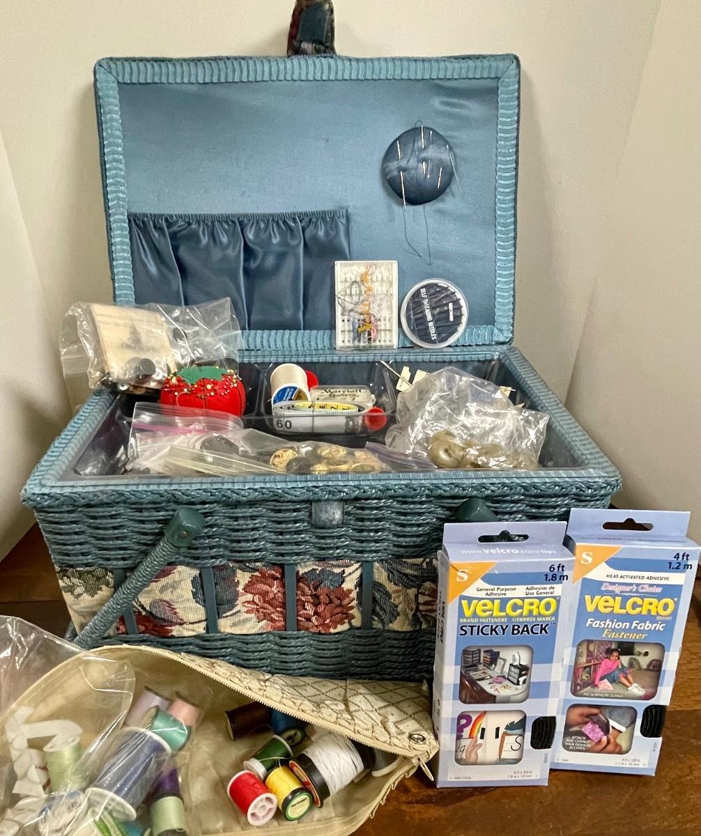 Sewing Box / Basket with handles & inner tray stuffed with craft and sewing supplies notions