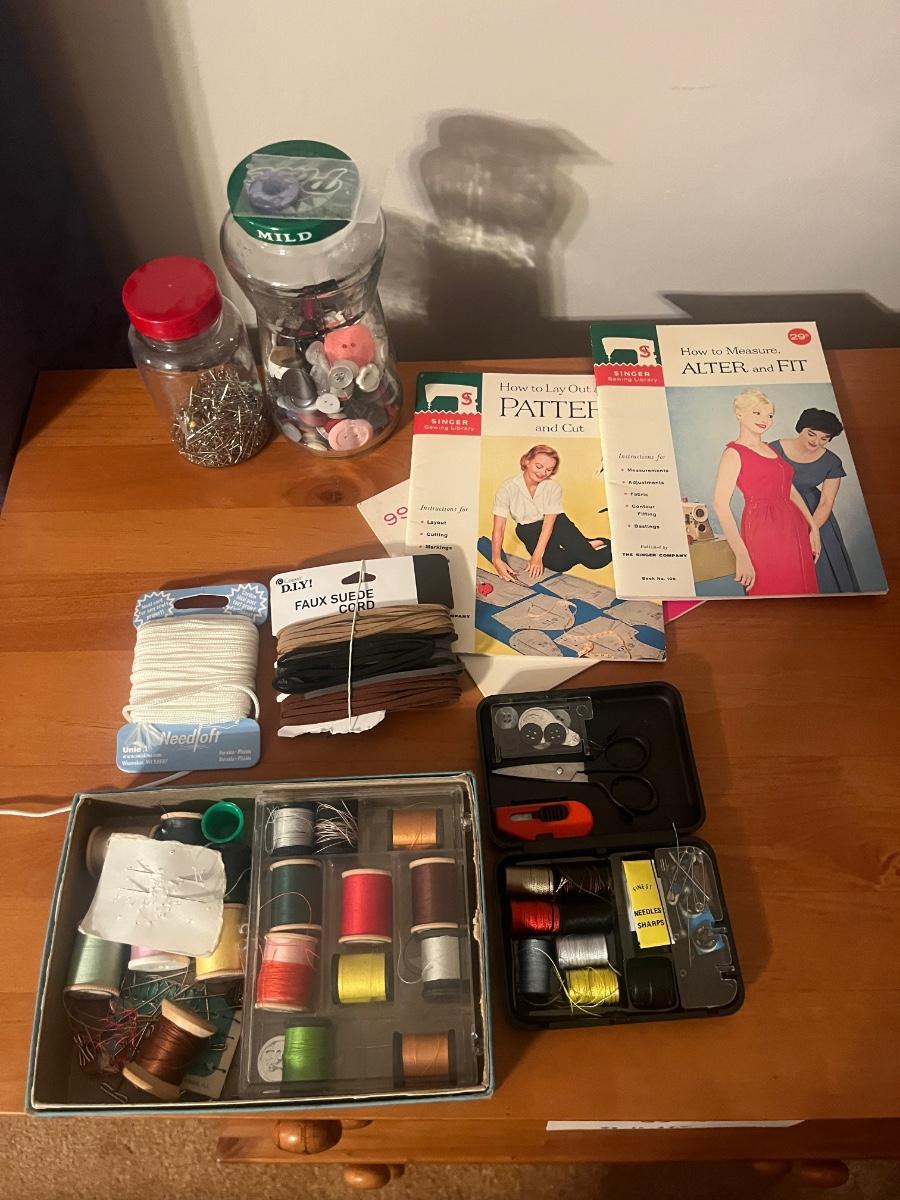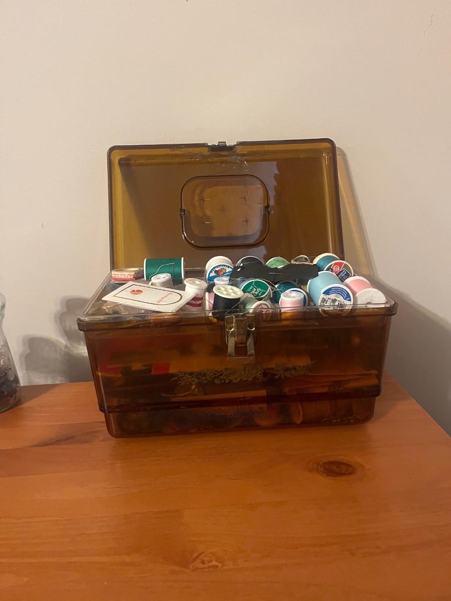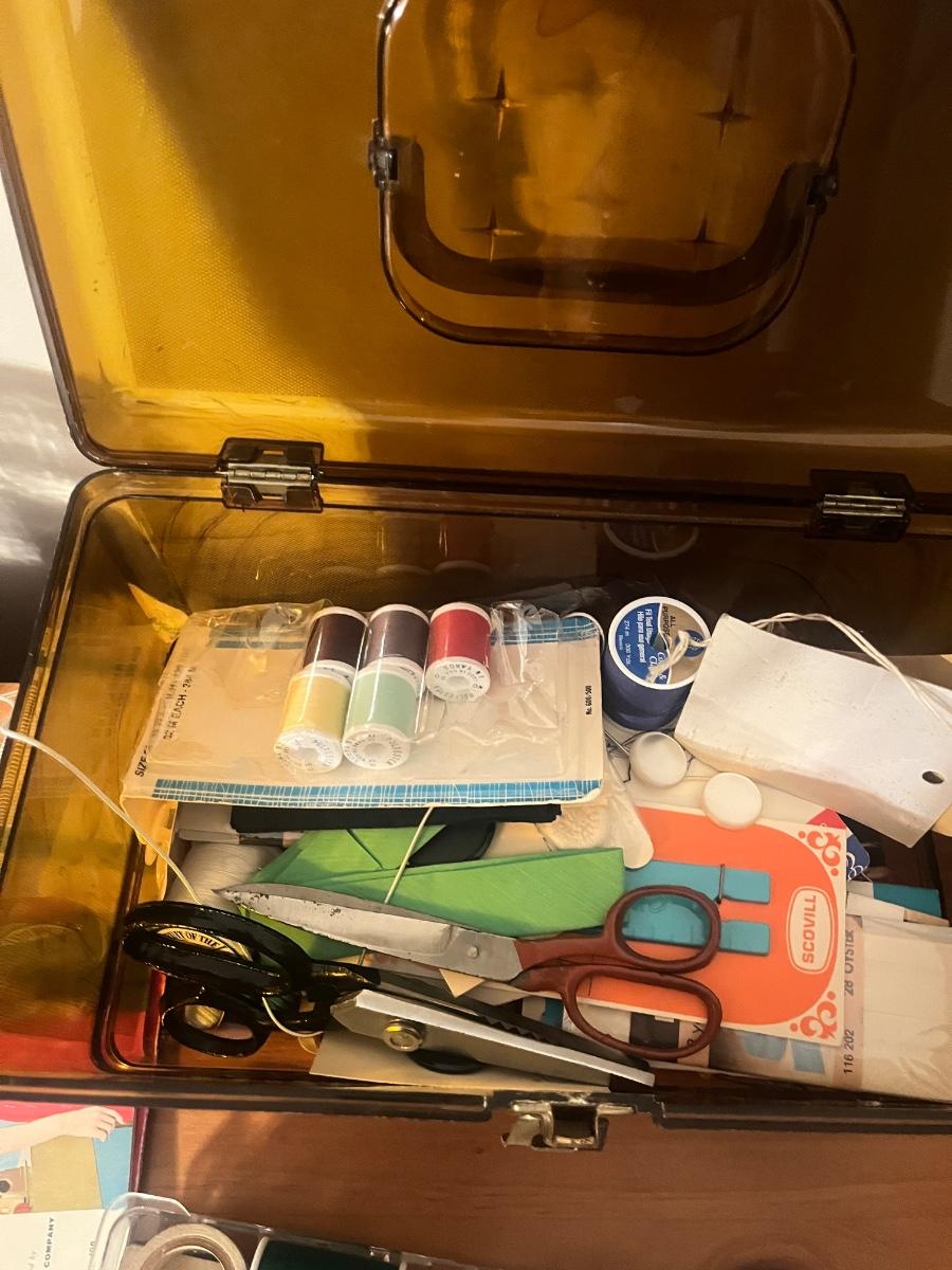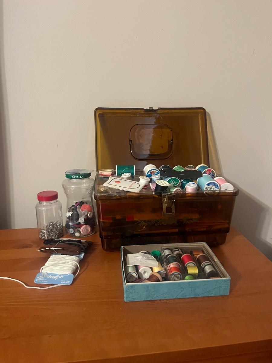 Lot contains a plastic box with contents that include scissors, pinking shears, thread, mini Singer sewing kit, buttons, safety pins, elastic and more. Box measures 12” x 7” x 7”H. Box has a crack that has been taped, see photos.