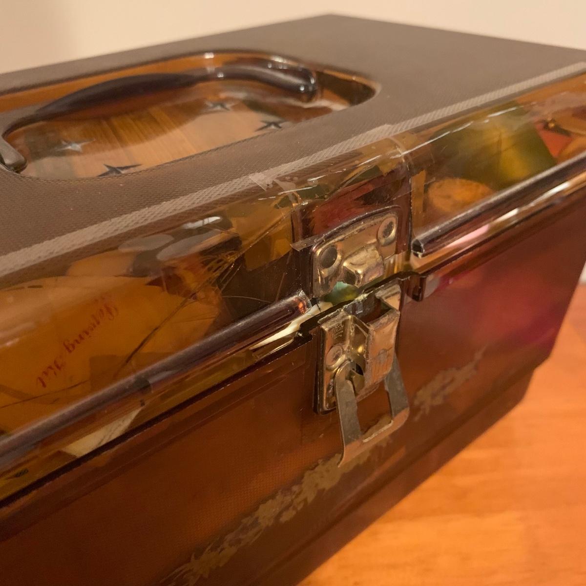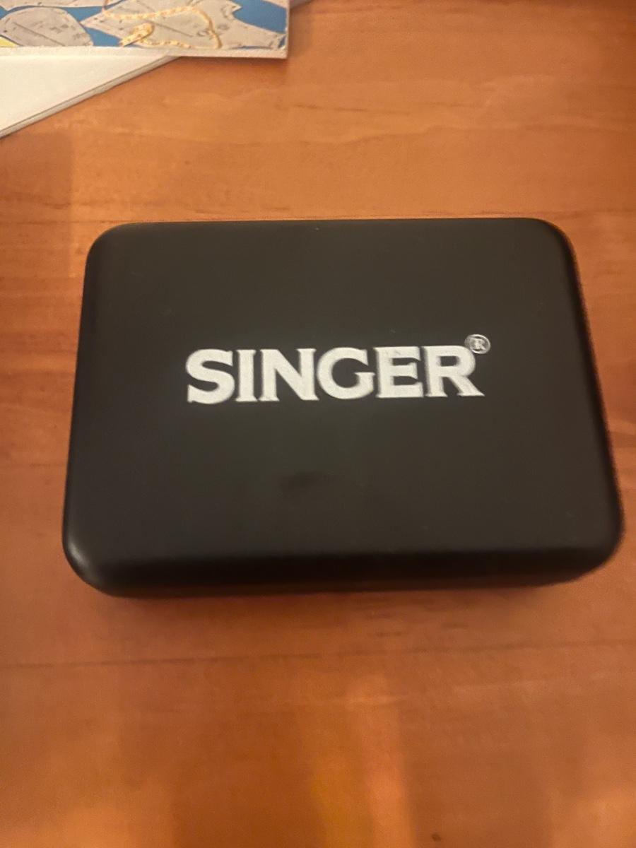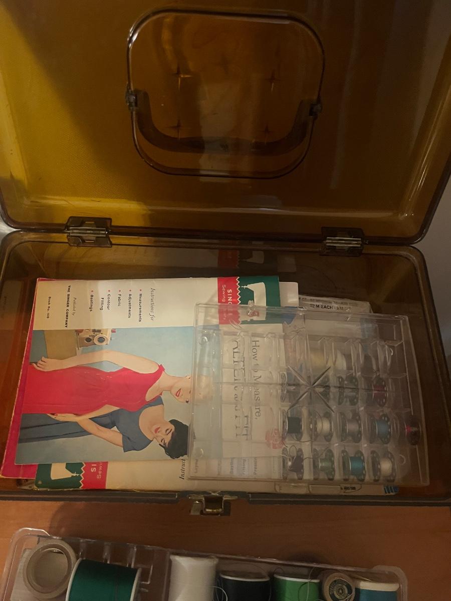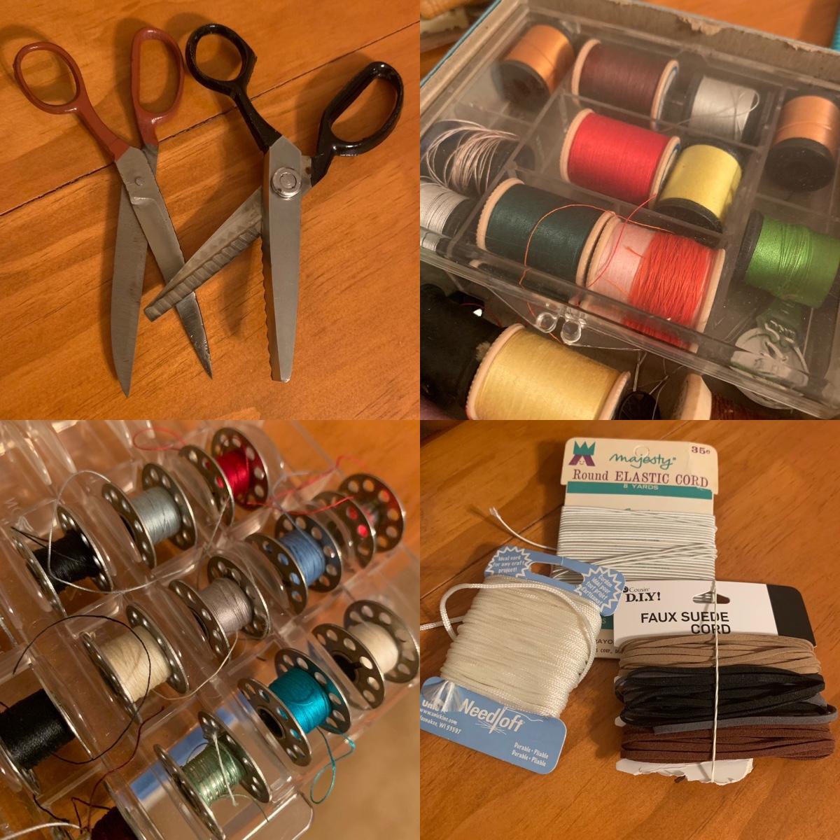 Lot contains a plastic box with contents that include scissors, pinking shears, thread, mini Singer sewing kit, buttons, safety pins, elastic and more. Box measures 12” x 7” x 7”H. Box has a crack that has been taped, see photos.