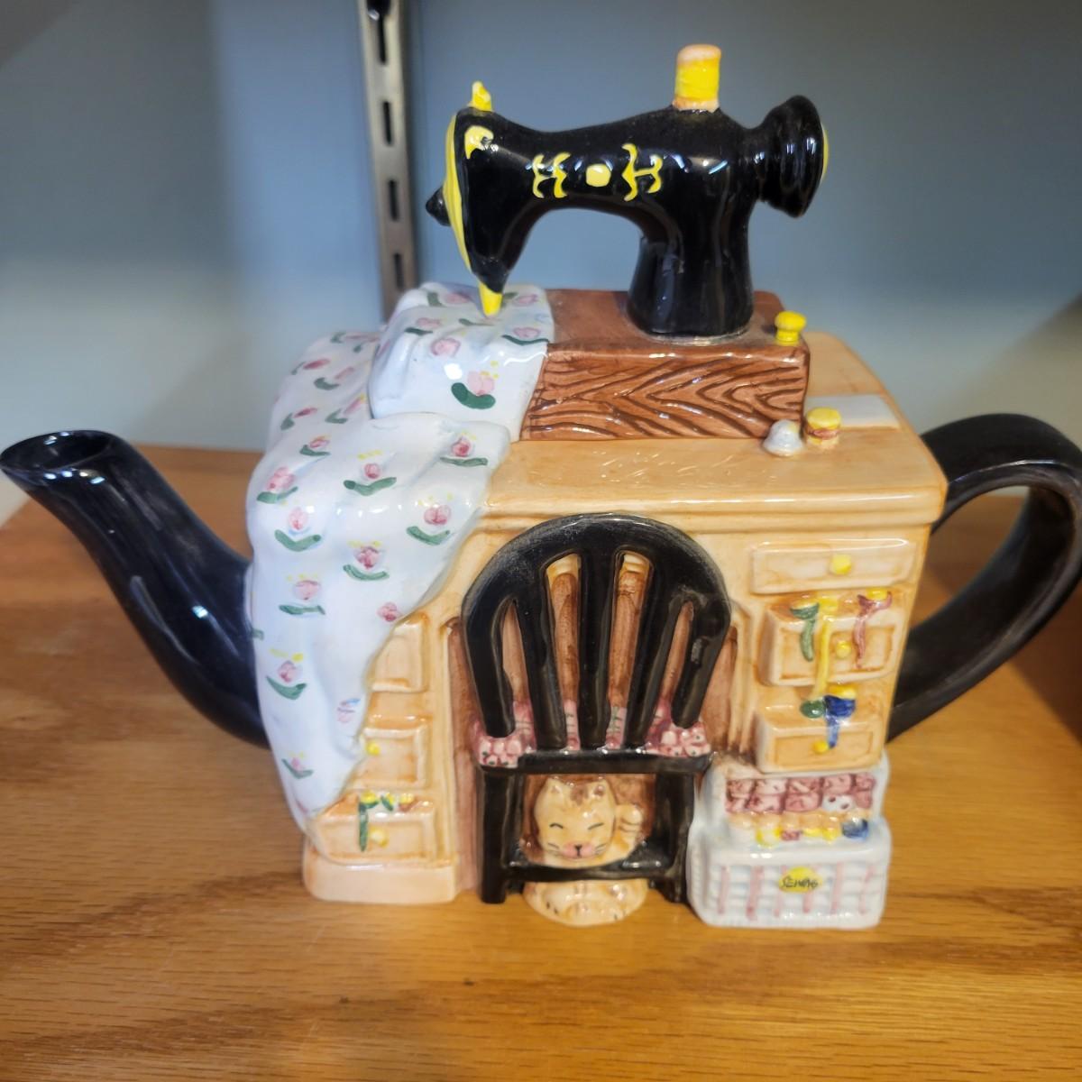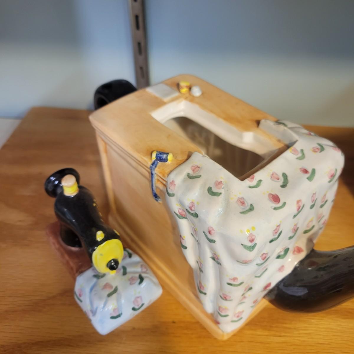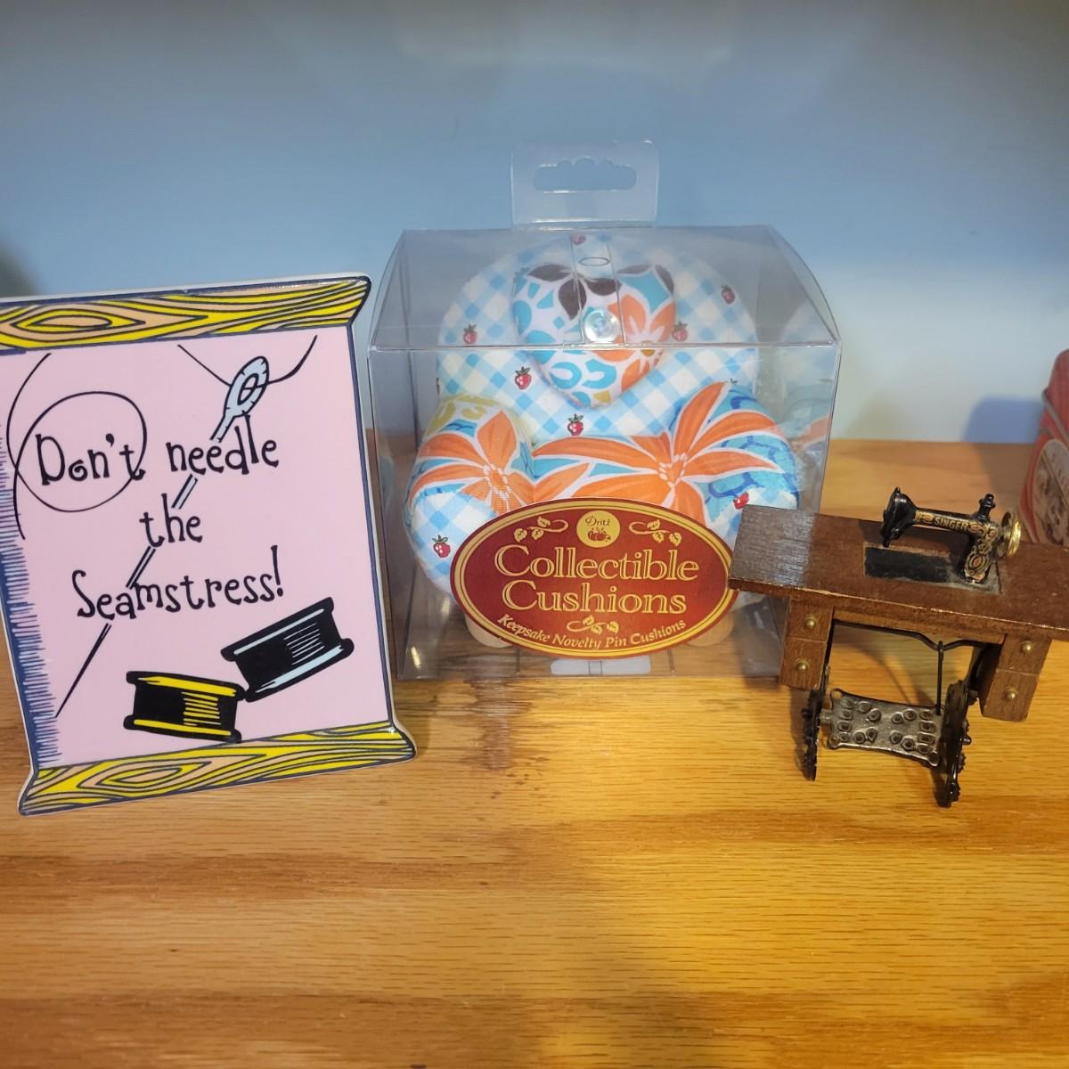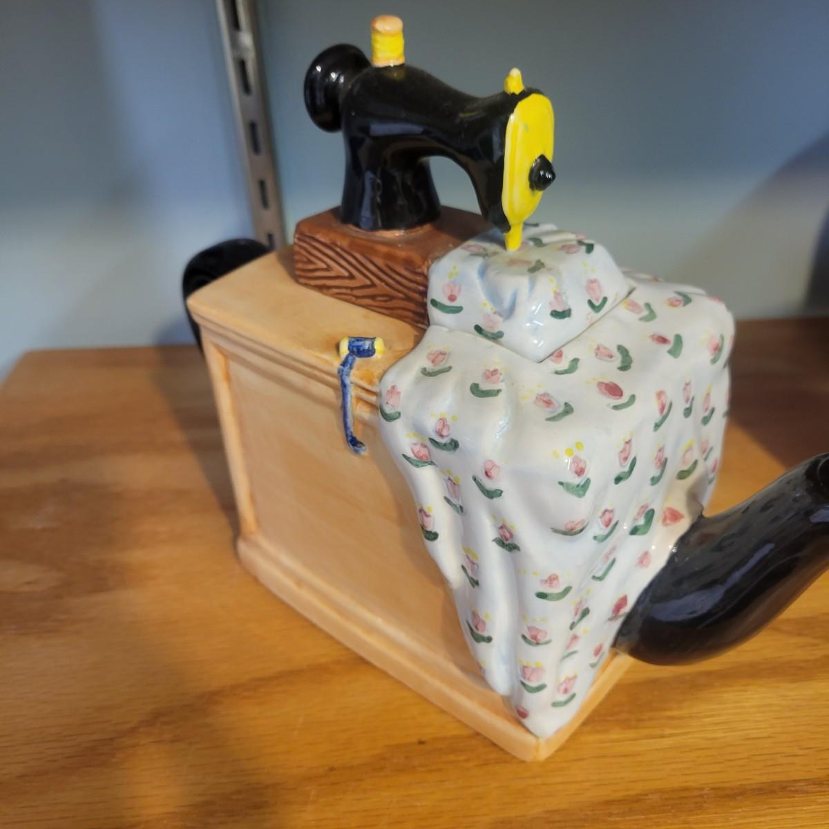 An assortment of sewing room decor items in good condition. Included in this lot is a decorative ceramic tea pot, two sewing boxes with trays to hold needles and whatnot, a set of nesting boxes with a fabric exterior and more. Largest sewing box measures approximately 7.5 " x 4.5" Shipping available